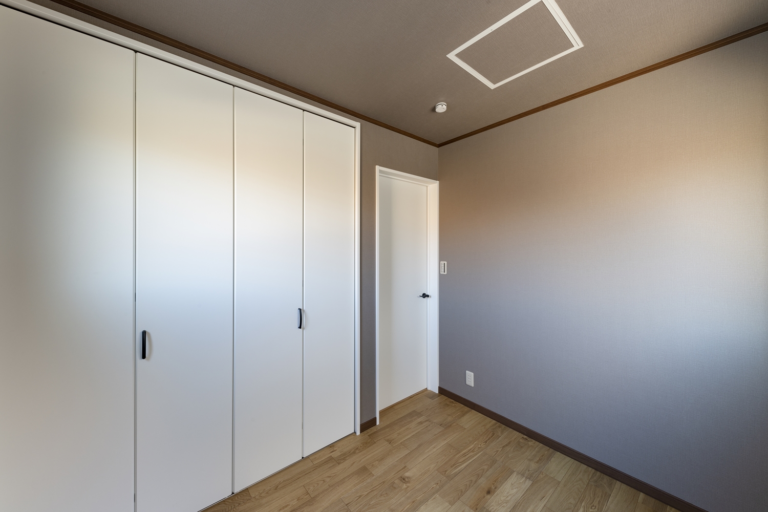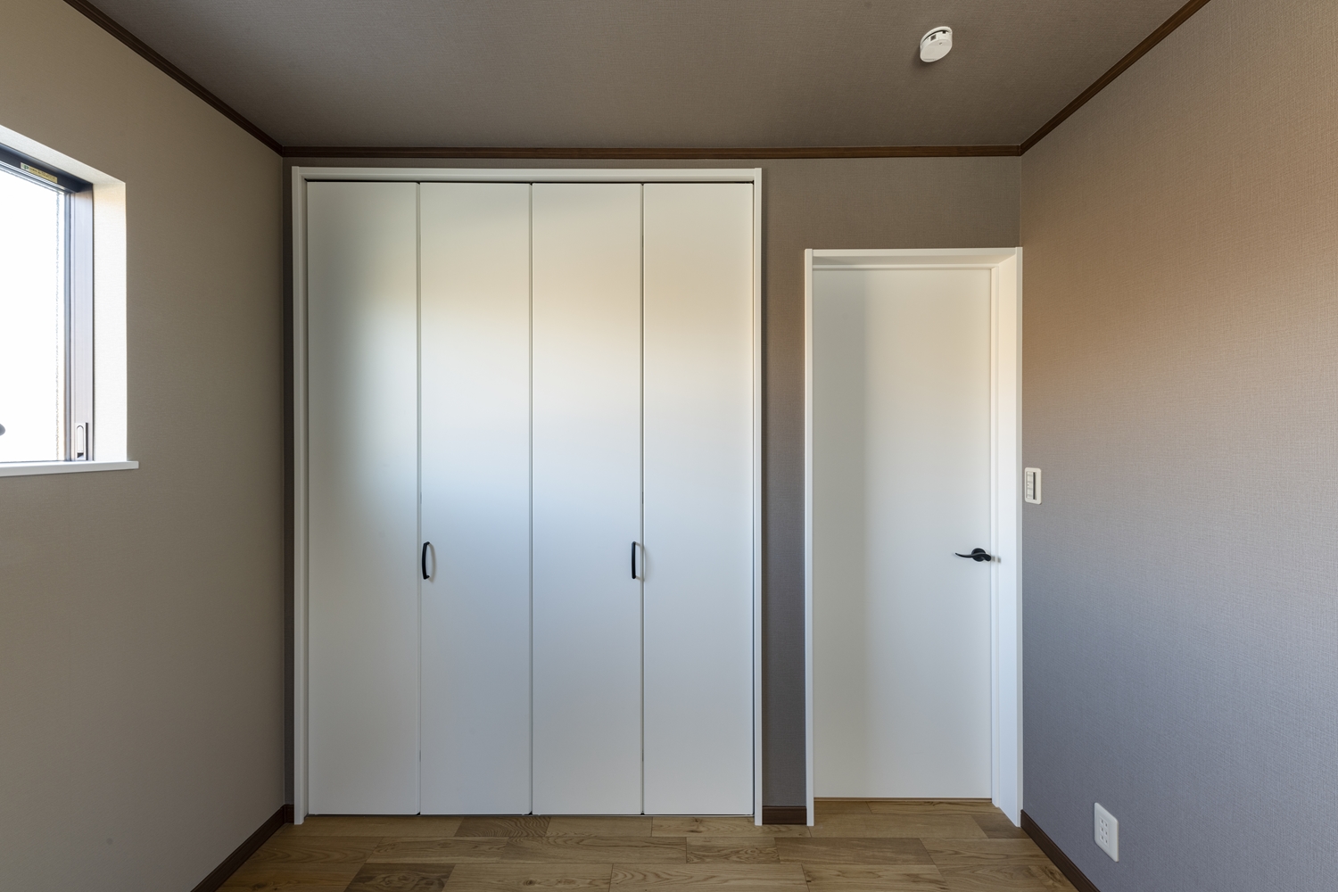 1階洋室/モノトーンカラーの壁紙に白い建具を合わせたモダンな雰囲気のお部屋。