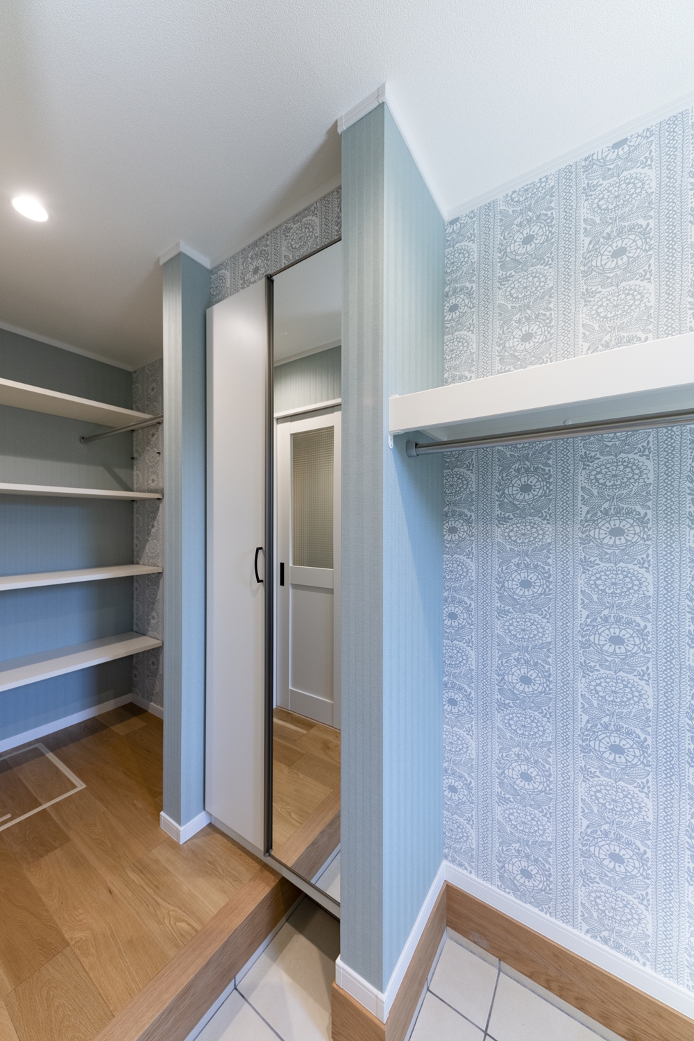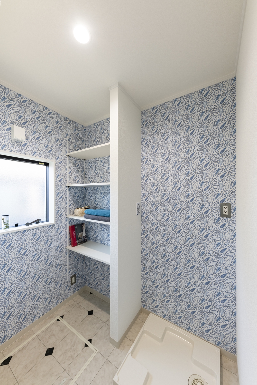 ランドリースペース/タオルや洗剤等をたっぷり収納できるリネン棚を設置。ペイズリー柄のブルーの壁紙が可愛らしくってとっても印象的です。