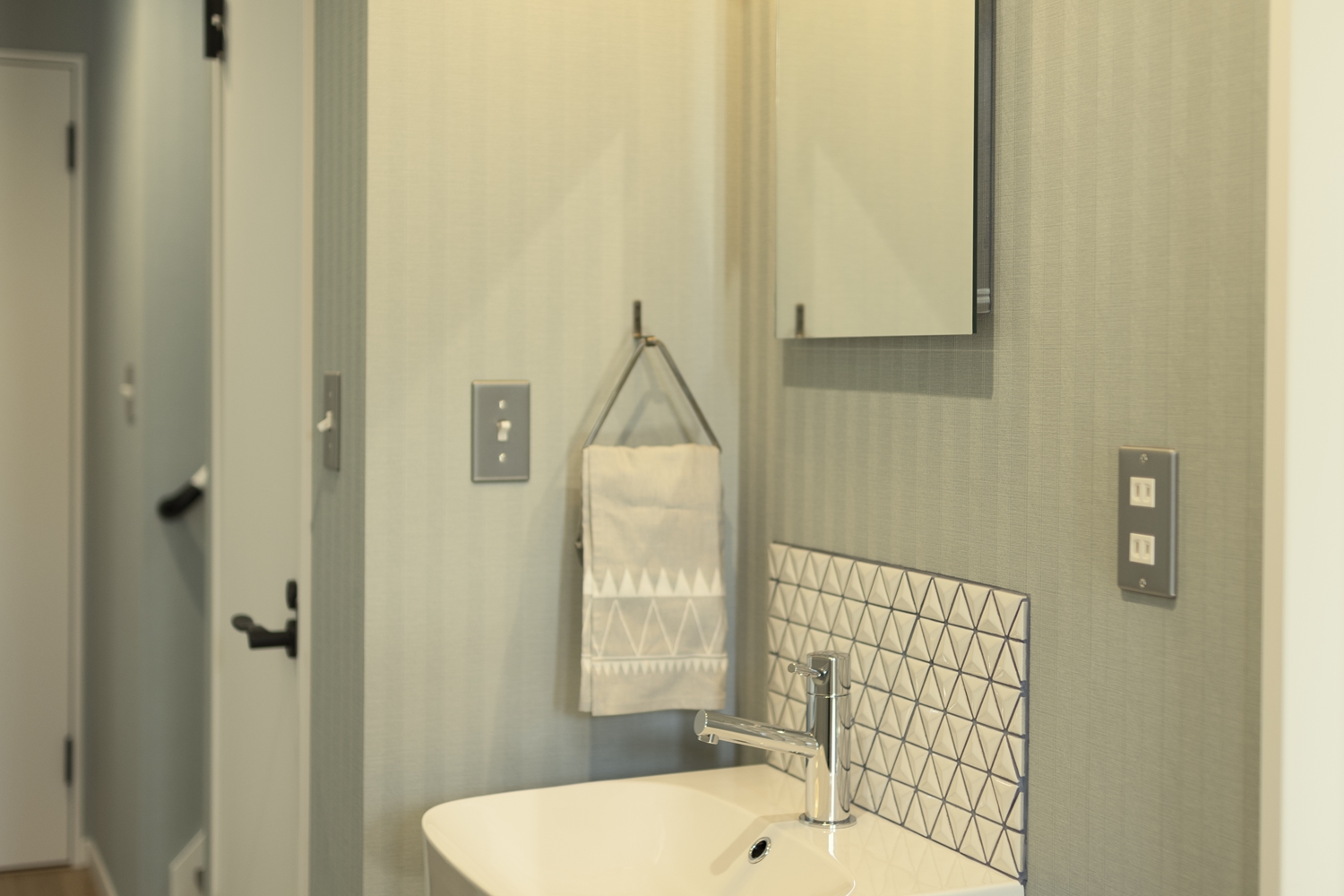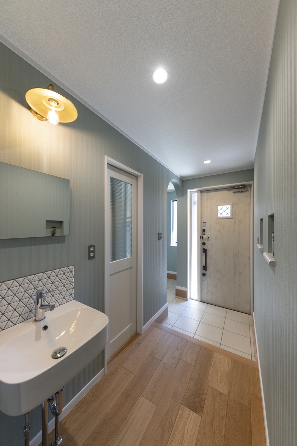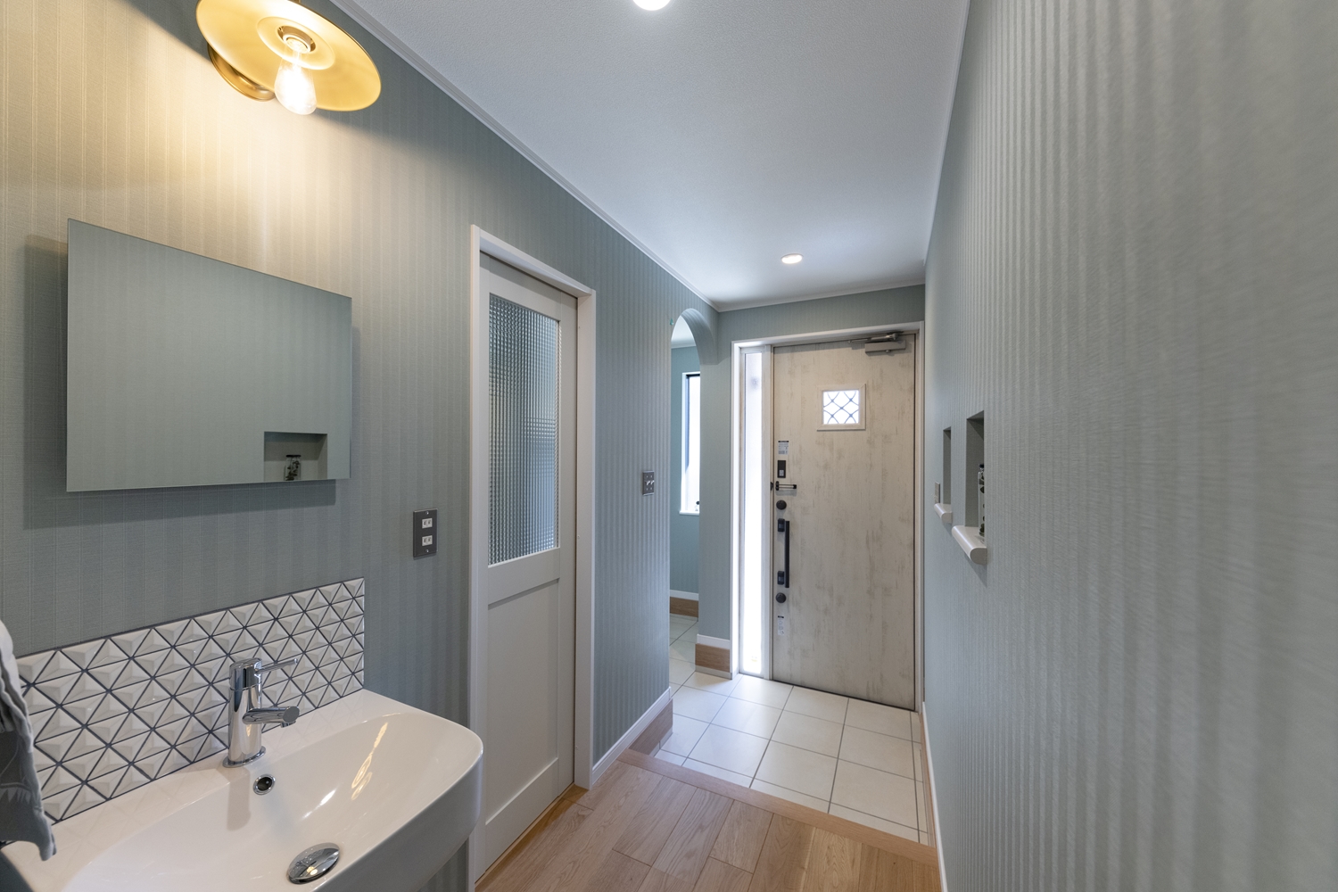 お客様も使いやすい玄関横の手洗いコーナー。帰宅してすぐうがいや手洗いができるので、衛生的で快適!三角のタイルが可愛らしくて魅力的♪