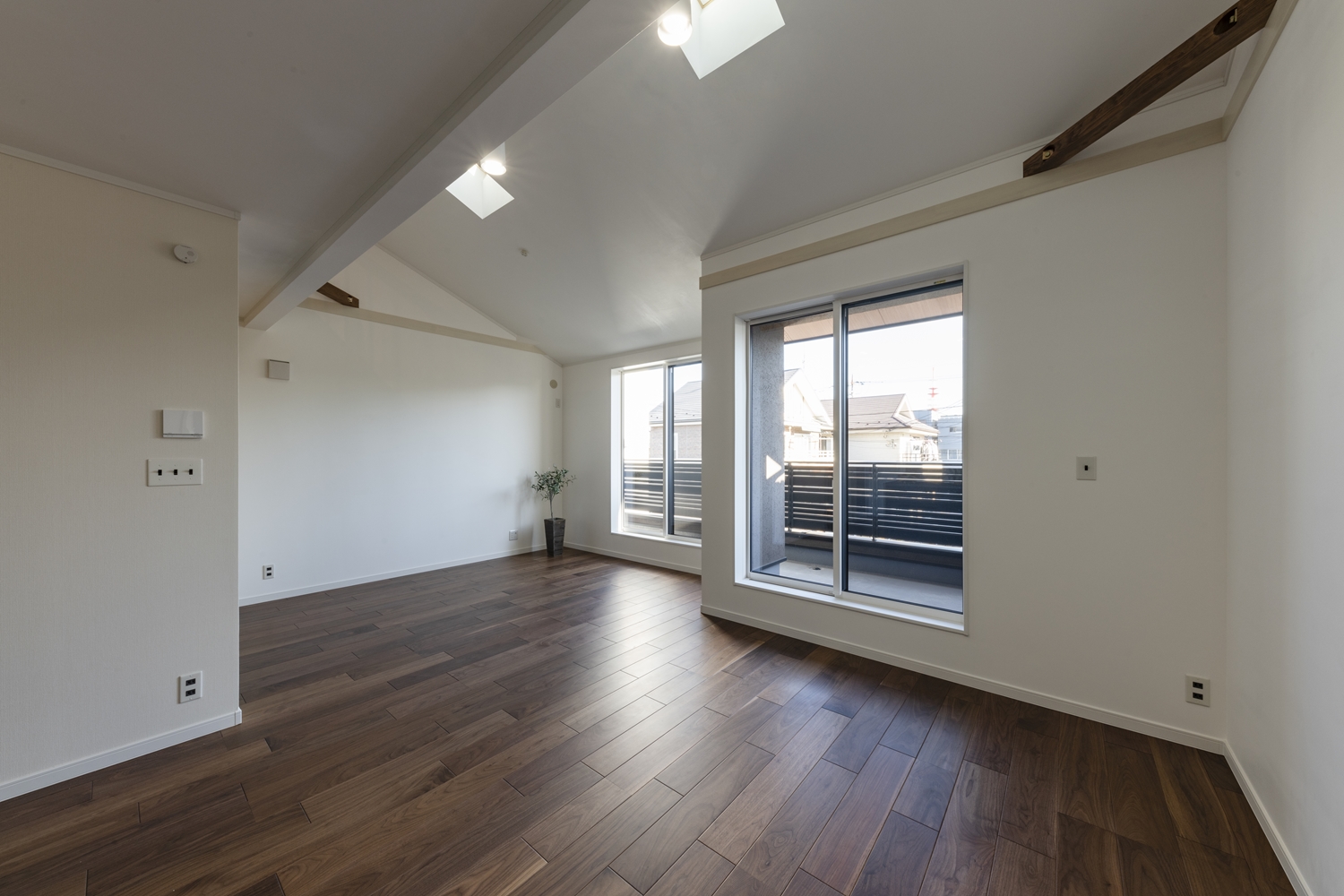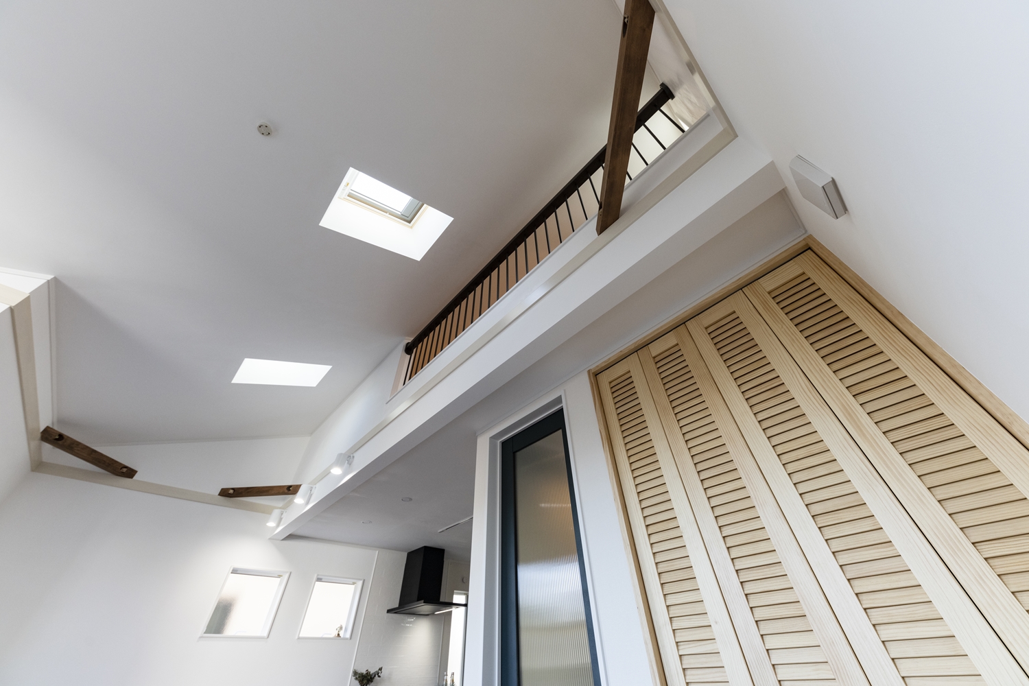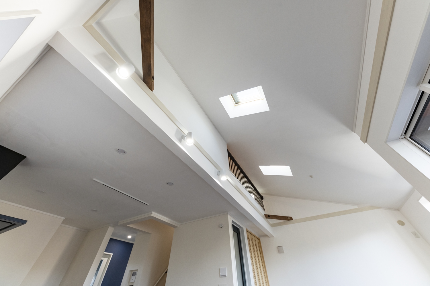 勾配天井にトップライト(天窓)を設えた開放的で光のあふれる空間。火打ち梁をあらわしにしてお部屋のアクセントに。