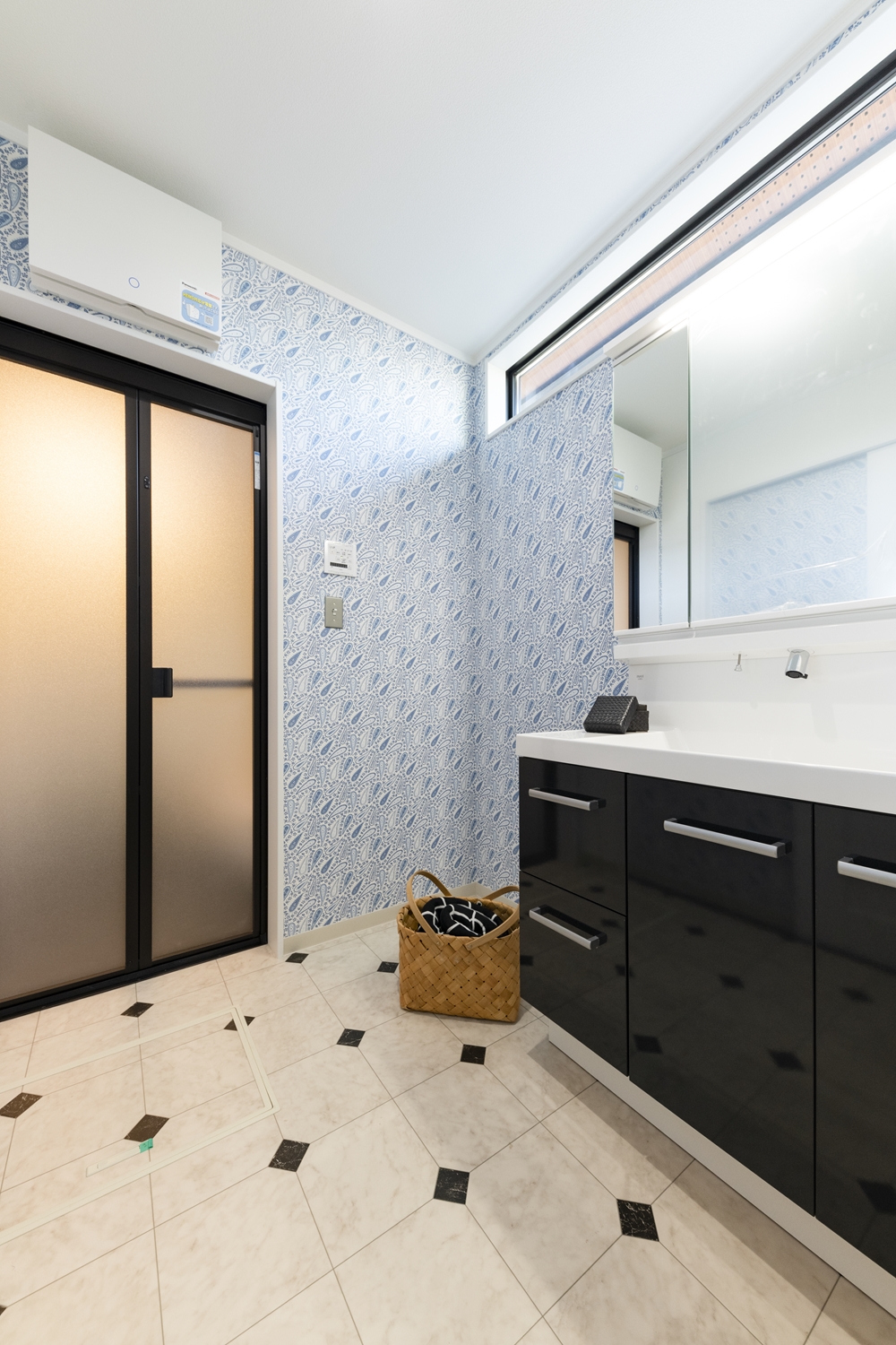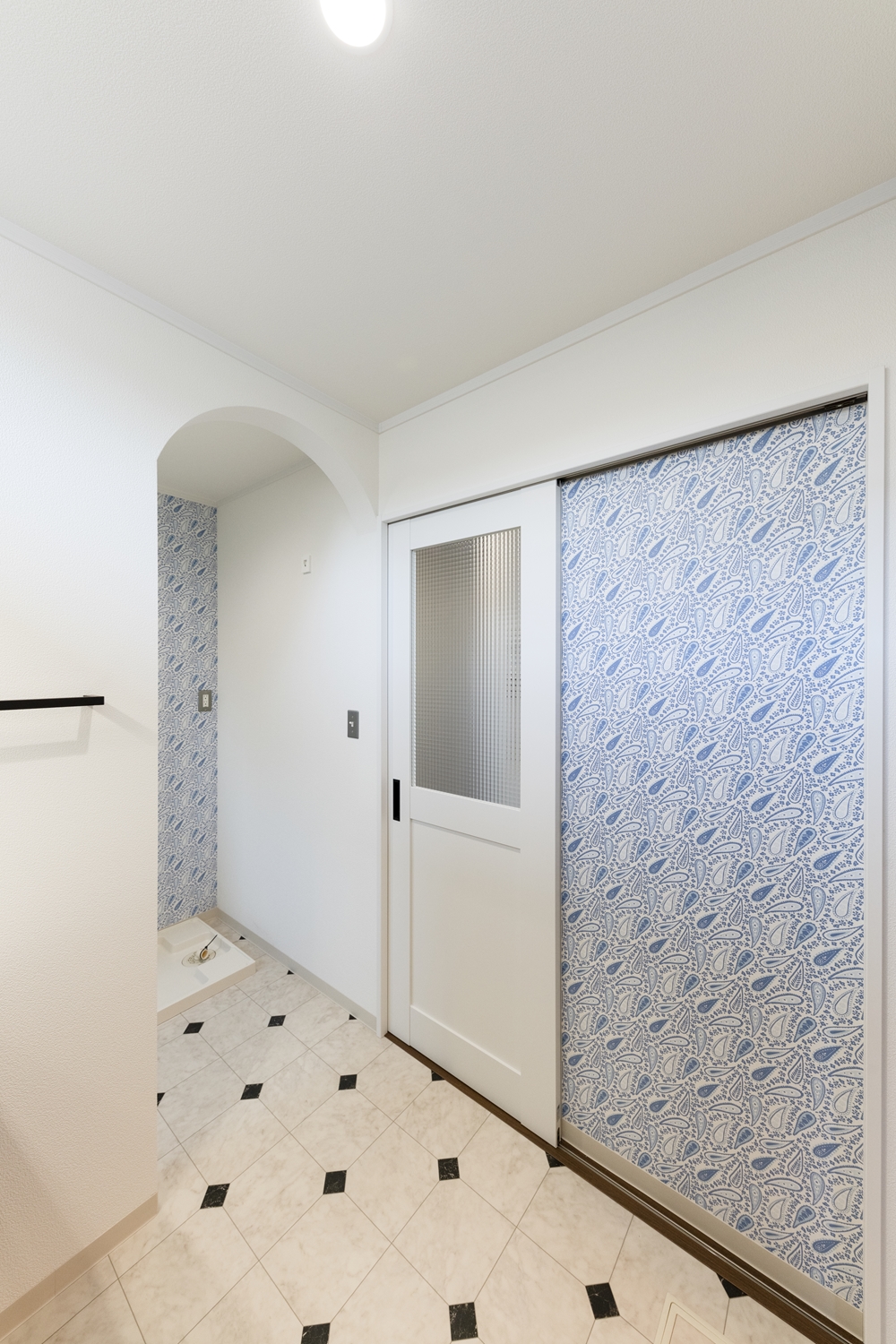サニタリールーム/ペイズリー柄のブルーの壁紙や石目柄のフロアがとっても可愛らしくて印象的です。
