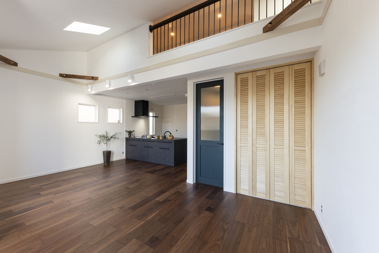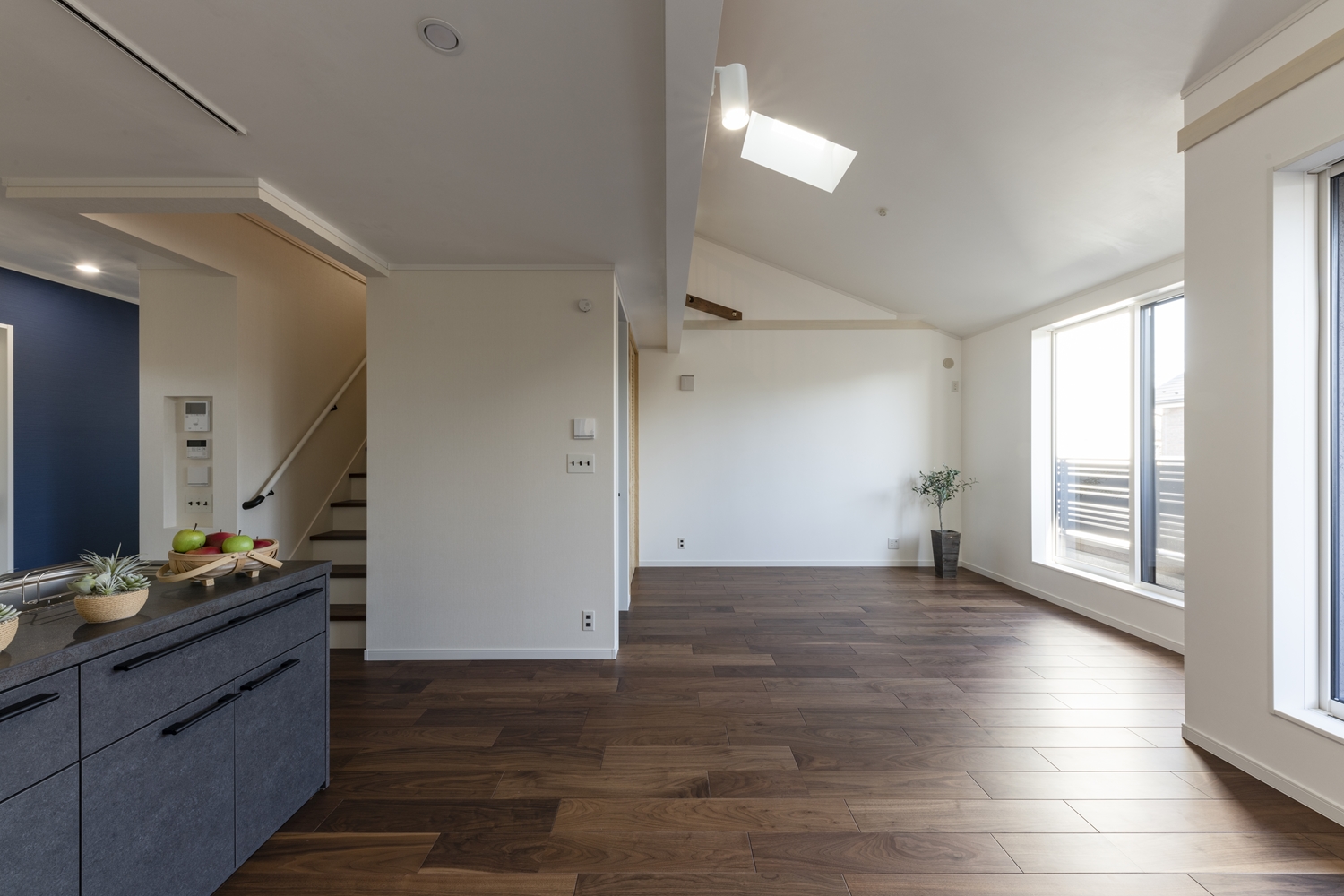 窓から差し込む陽射しが、壁の白さとブラックウォルナットのフローリングのコントラストを鮮やかに引き立てています。