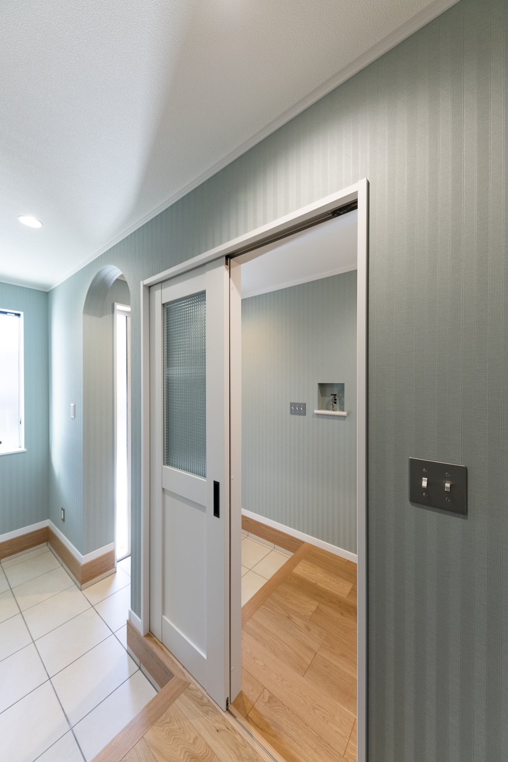 サニタリールーム/アーチ状の下がり壁や、アンティーク家具などによく使われている型板ガラスをあしらったおしゃれな建具を施しました。