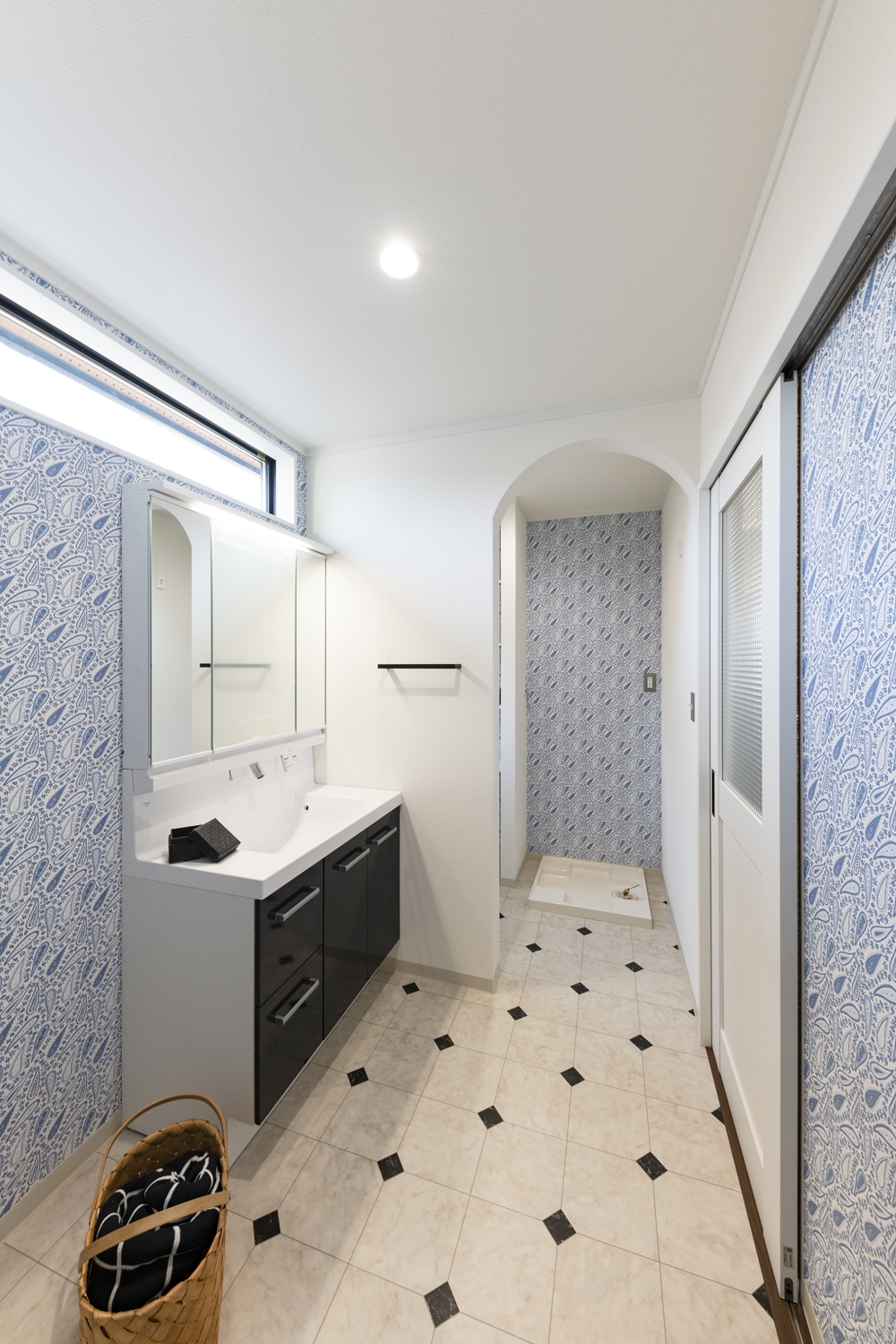 広々としたサニタリールーム。アーチ状の下がり壁の奥は、ランドリースペースになっています。上部に横長の窓を配置し、採光も確保しました。