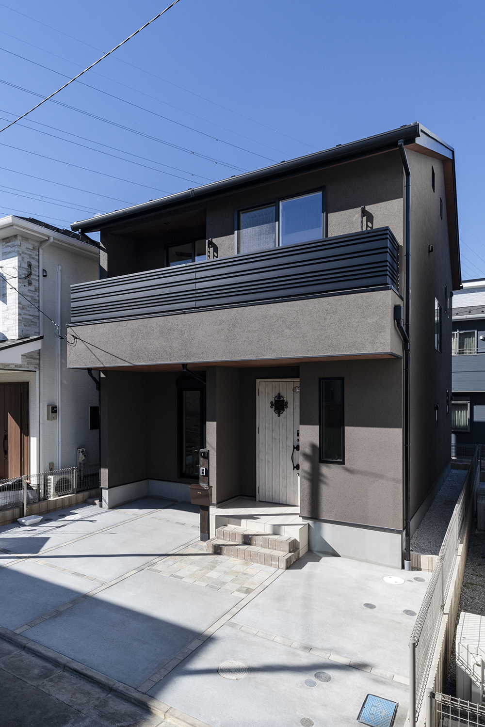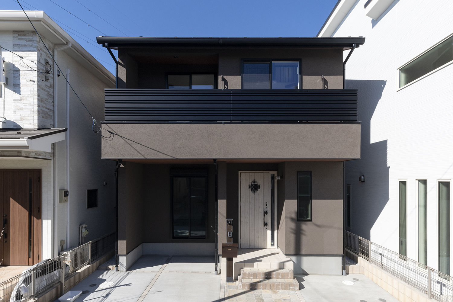 窓に鋳物飾りをあしらった白い玄関ドアがシックな色の外観にアクセントを添えています。軒天に木目調をあしらい、モダンなデザインに。