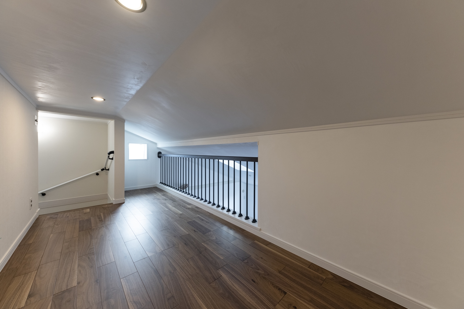 リビングの上部のロフト(4.5帖)。木製の手摺とアイアンの柵を施しました。