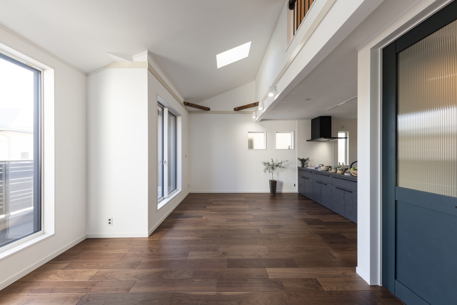 大きな窓やトップライトから、やさしい光が降り注ぐ、明るく開放的な2階リビング。