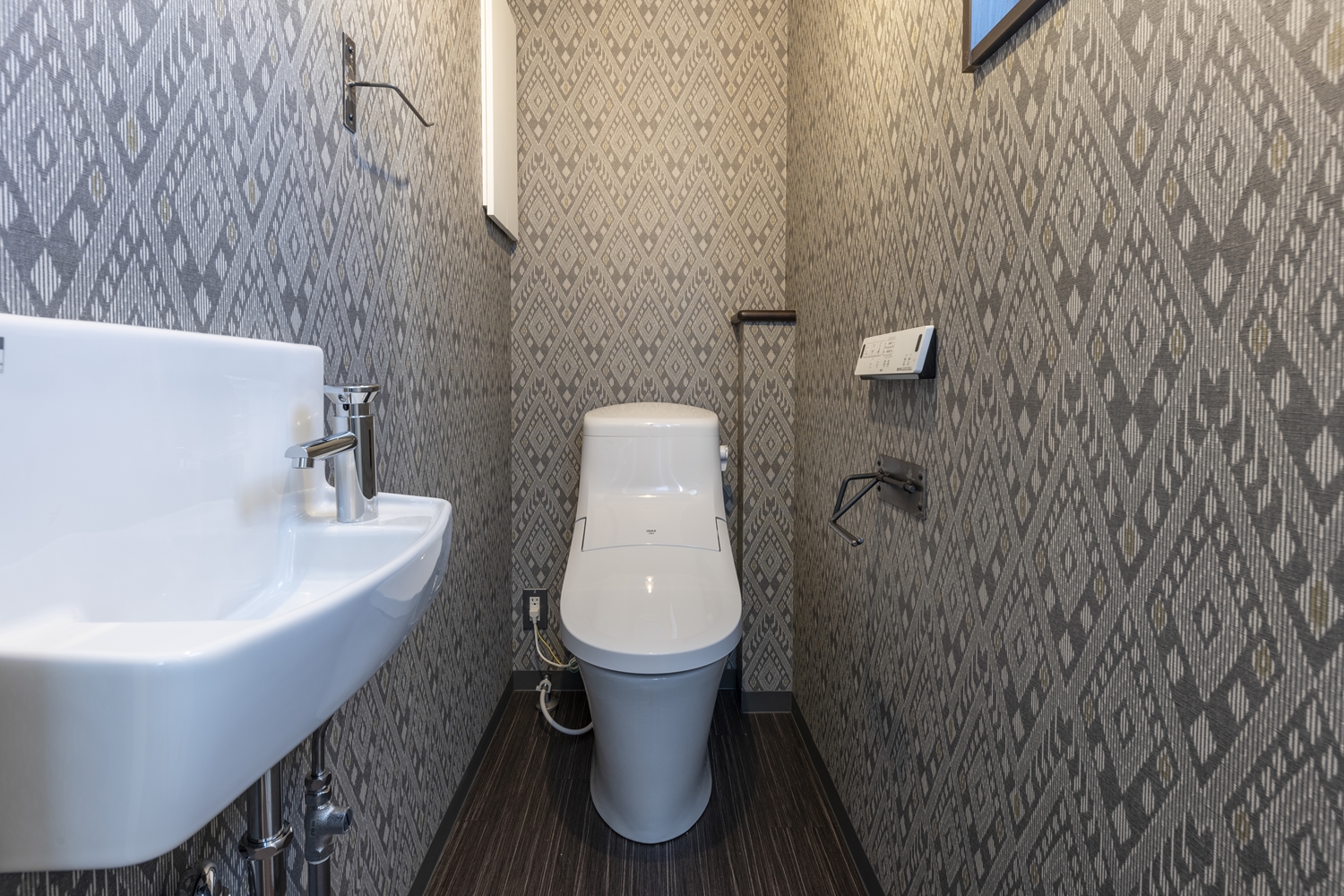 2階トイレ/柄のクロスを全面に施し、個性的に演出。手洗いを設置し使い勝手のよい空間に。