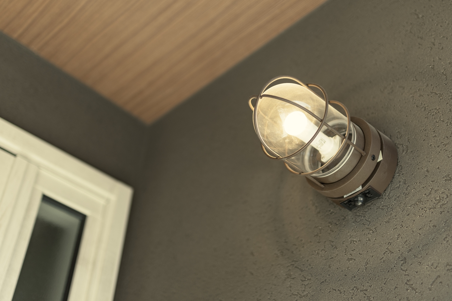 お洒落なインダストリアル調のポーチライトがエントランスを彩ります。