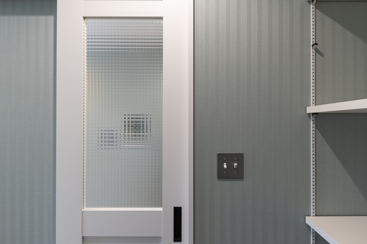 ブルーグリーンの壁紙に白いドアや白いキャビネットでアクセント。爽やかさと温かみを合わせ持った魅力的な空間。