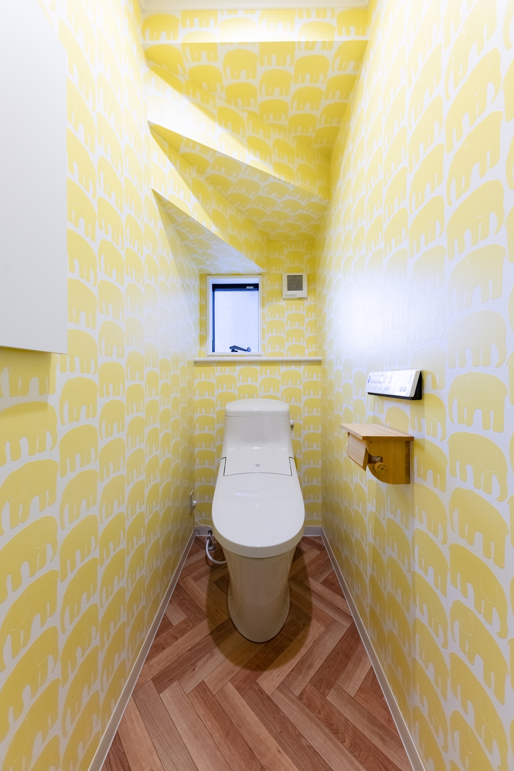 1階トイレ/黄色いアニマルデザインのクロスや、ヘンリーボーン柄のフロアを施したポップで明るい空間。