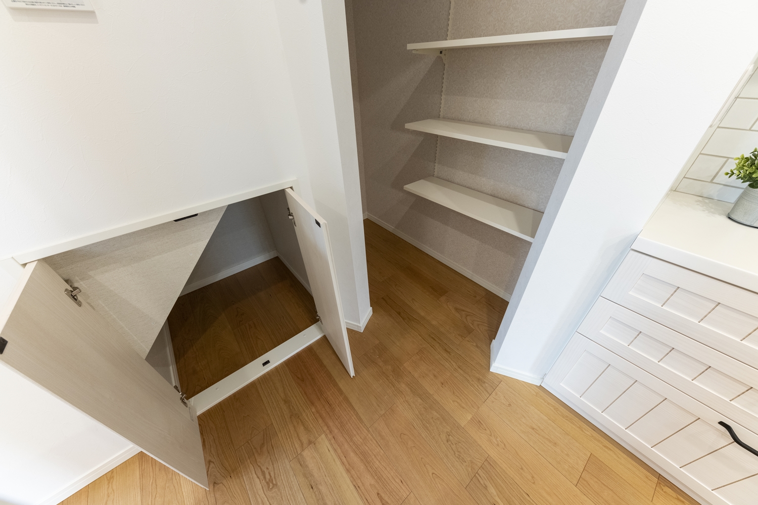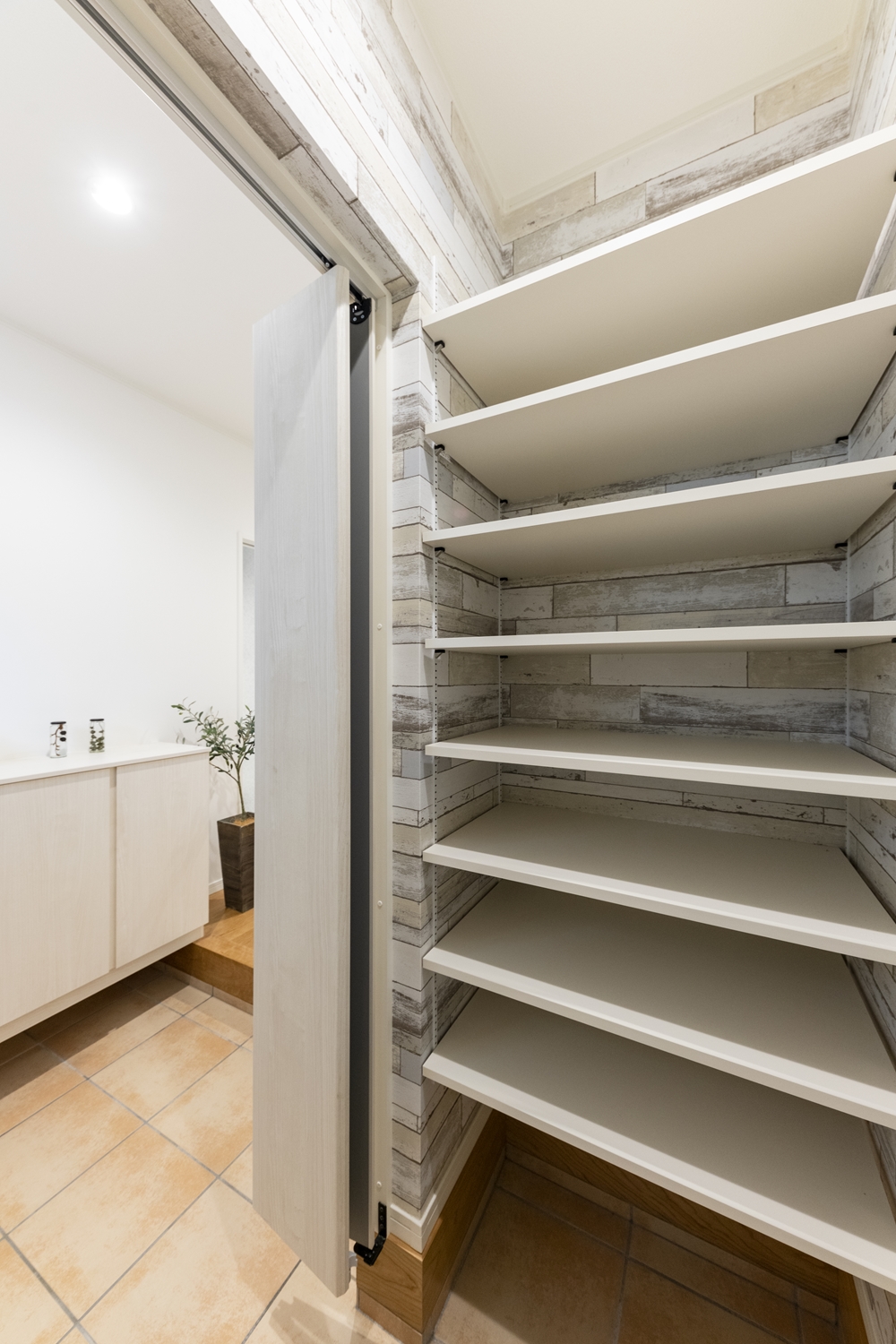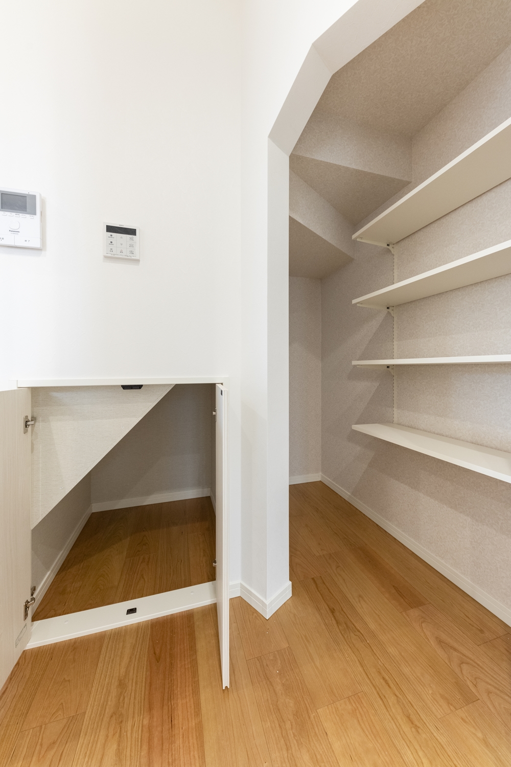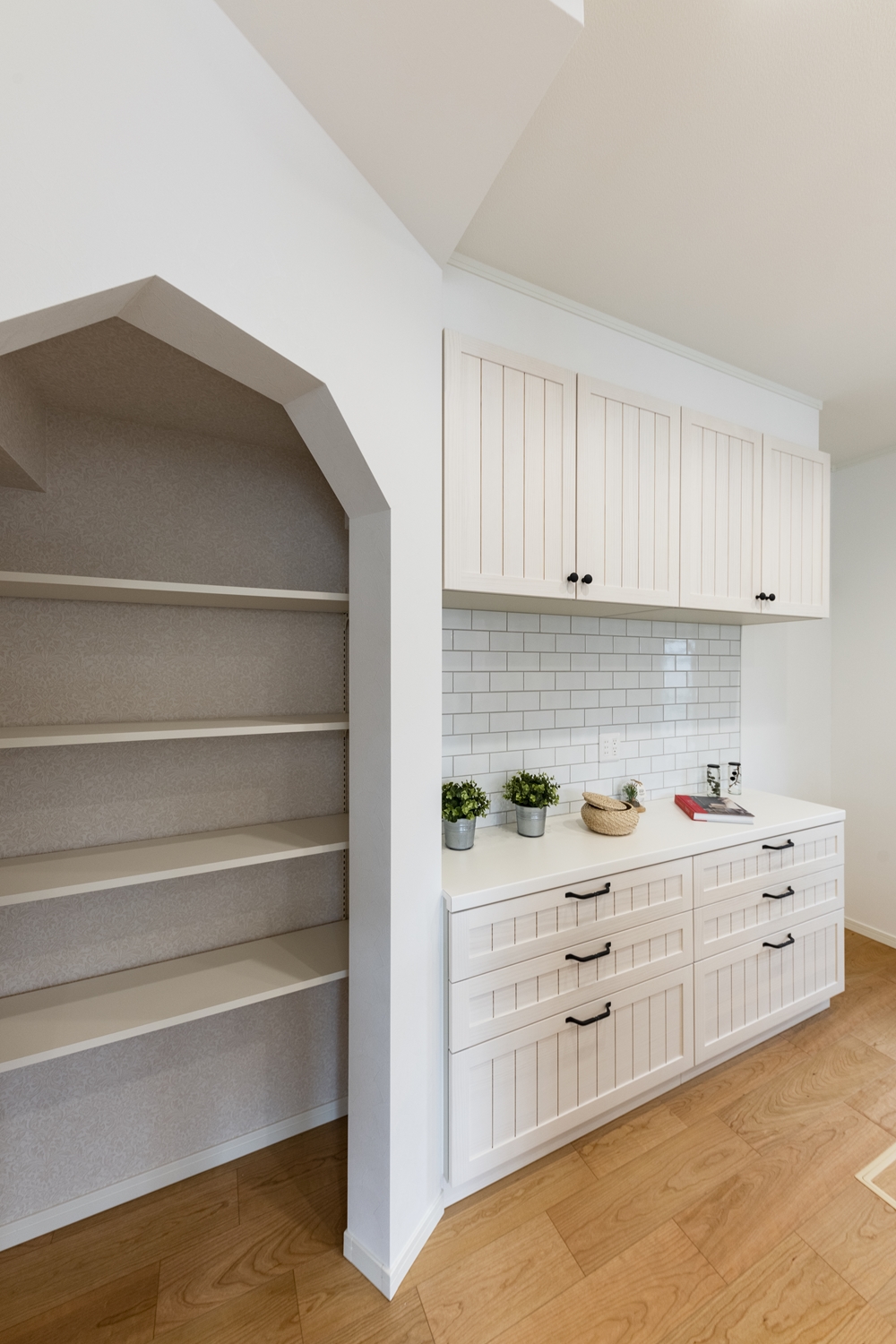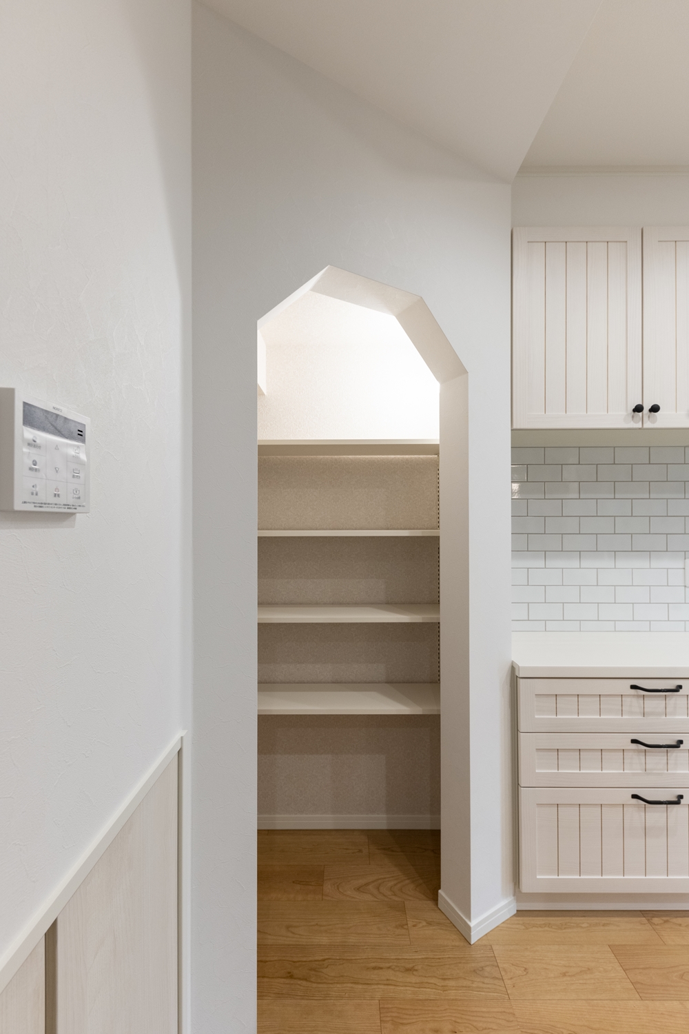 備蓄や場所をとるキッチン家電の保管に便利なパントリーを設えました。入口の下がり壁が可愛らしくアクセントになっています♪