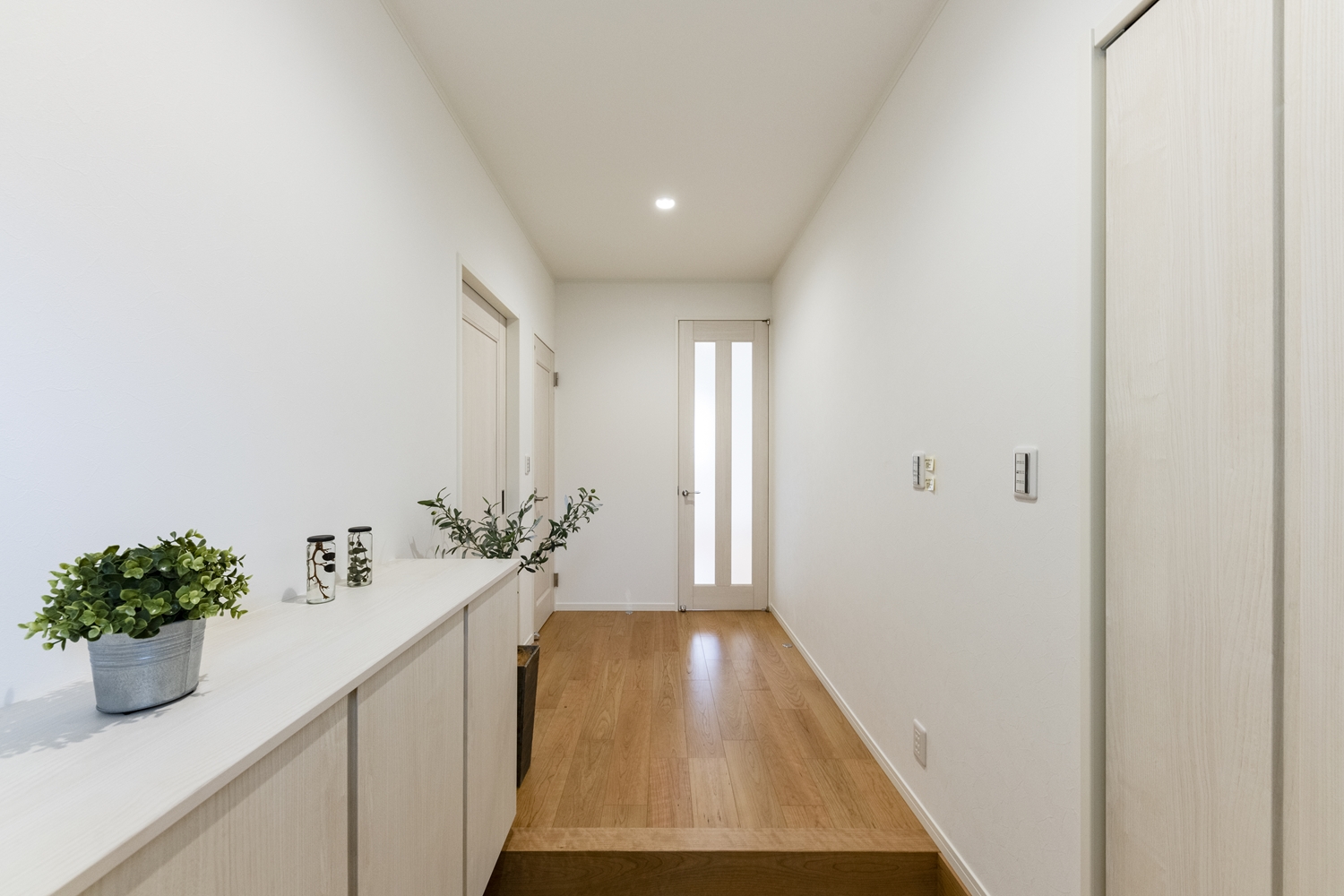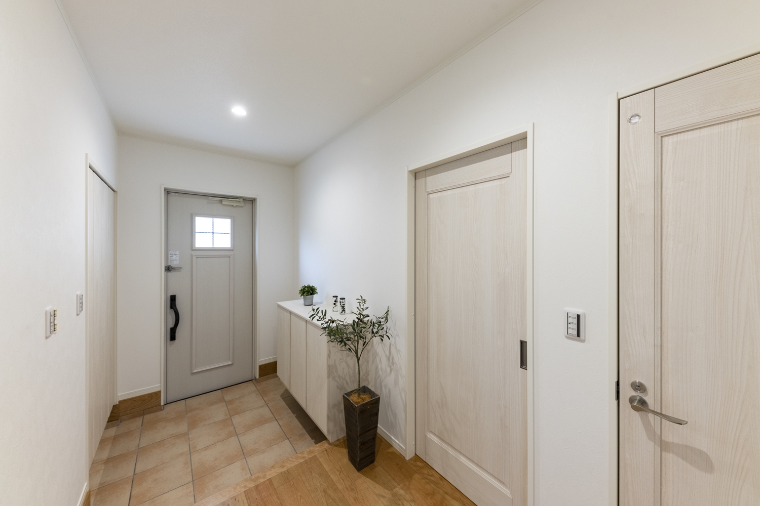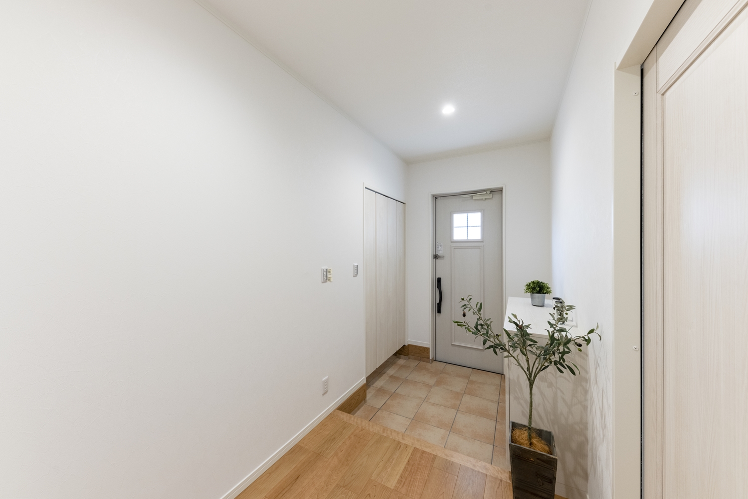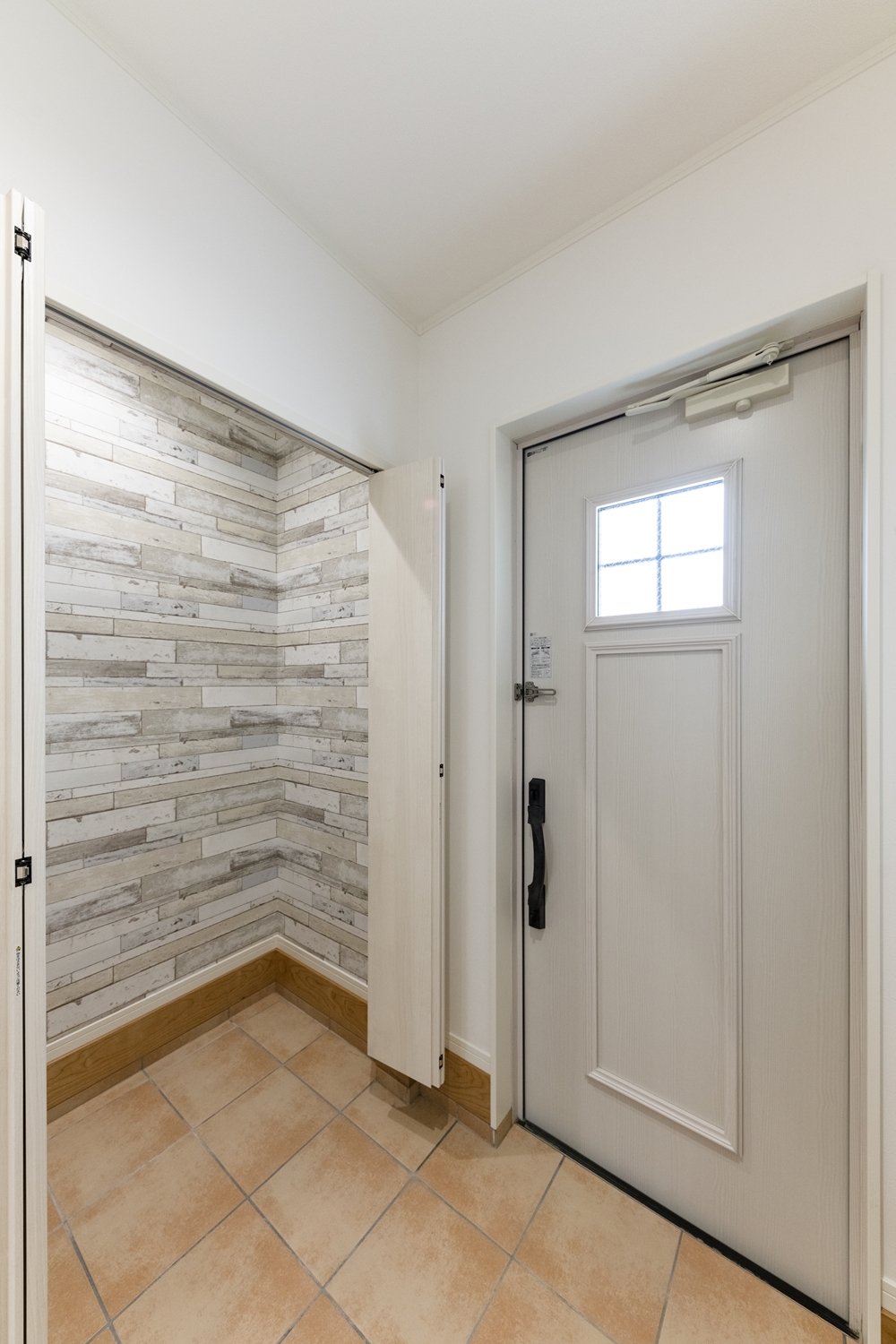 白を基調とした明るくナチュラルな雰囲気の玄関。小窓をあしらった可愛らしいデザインの玄関ドアを施しました。