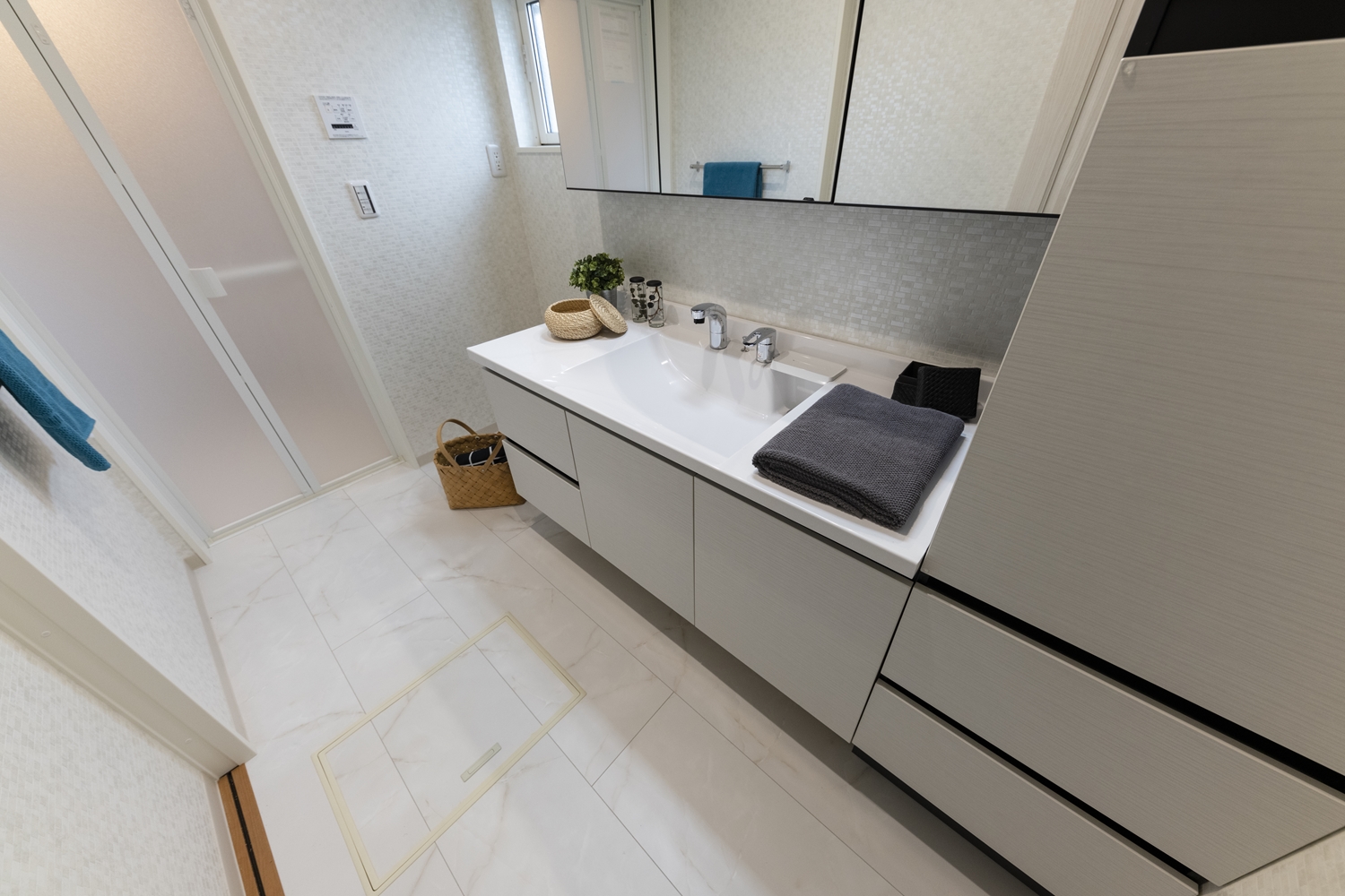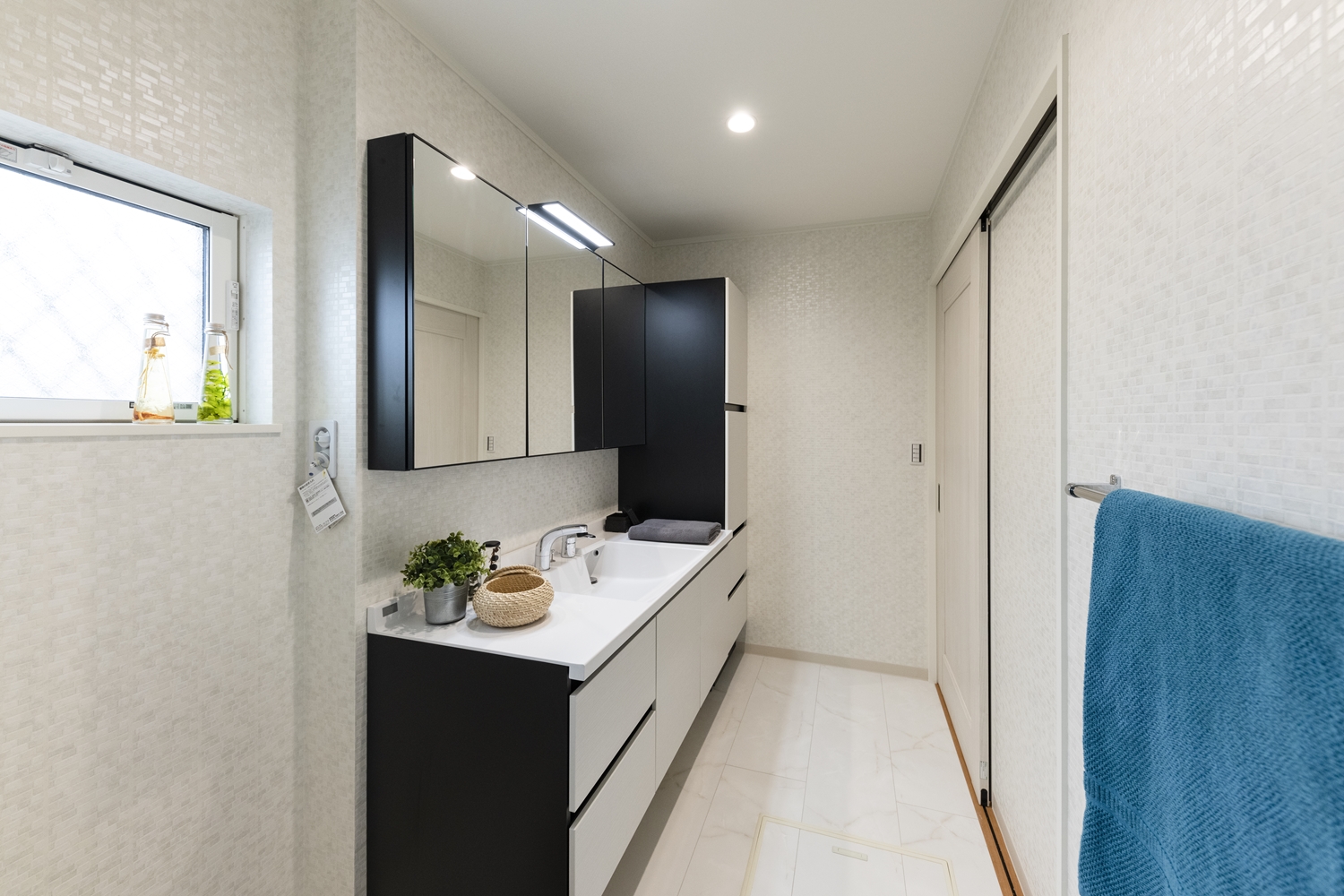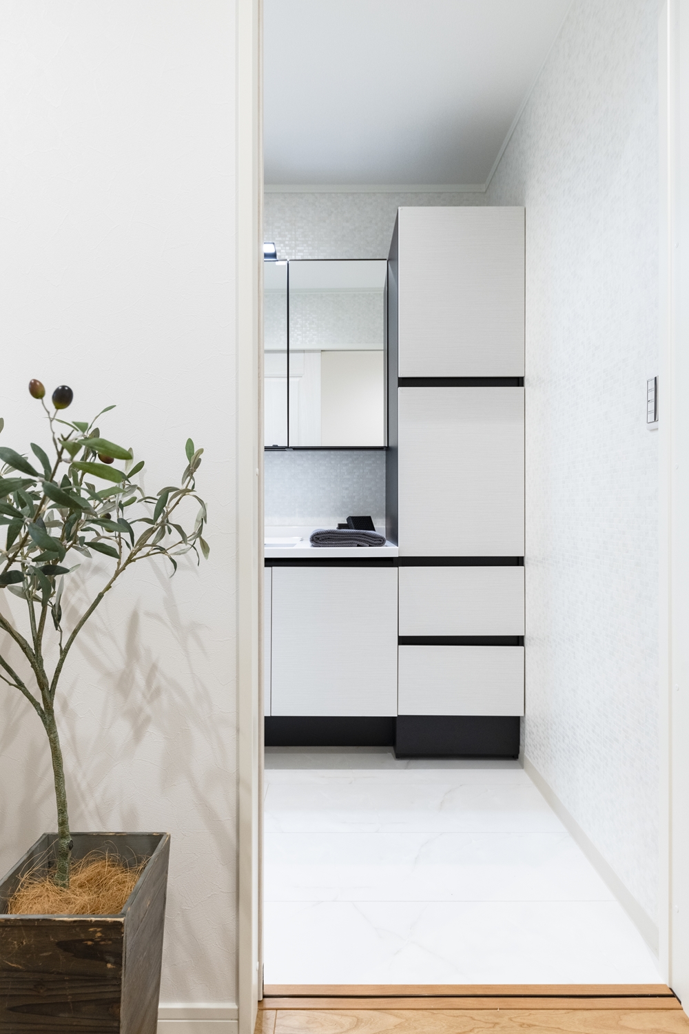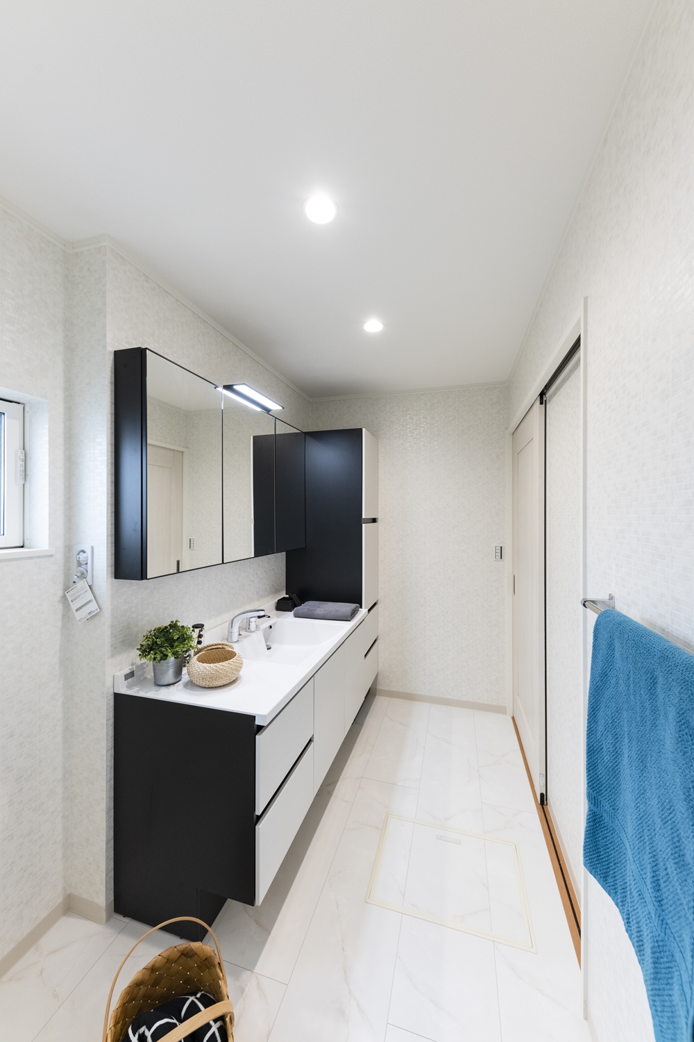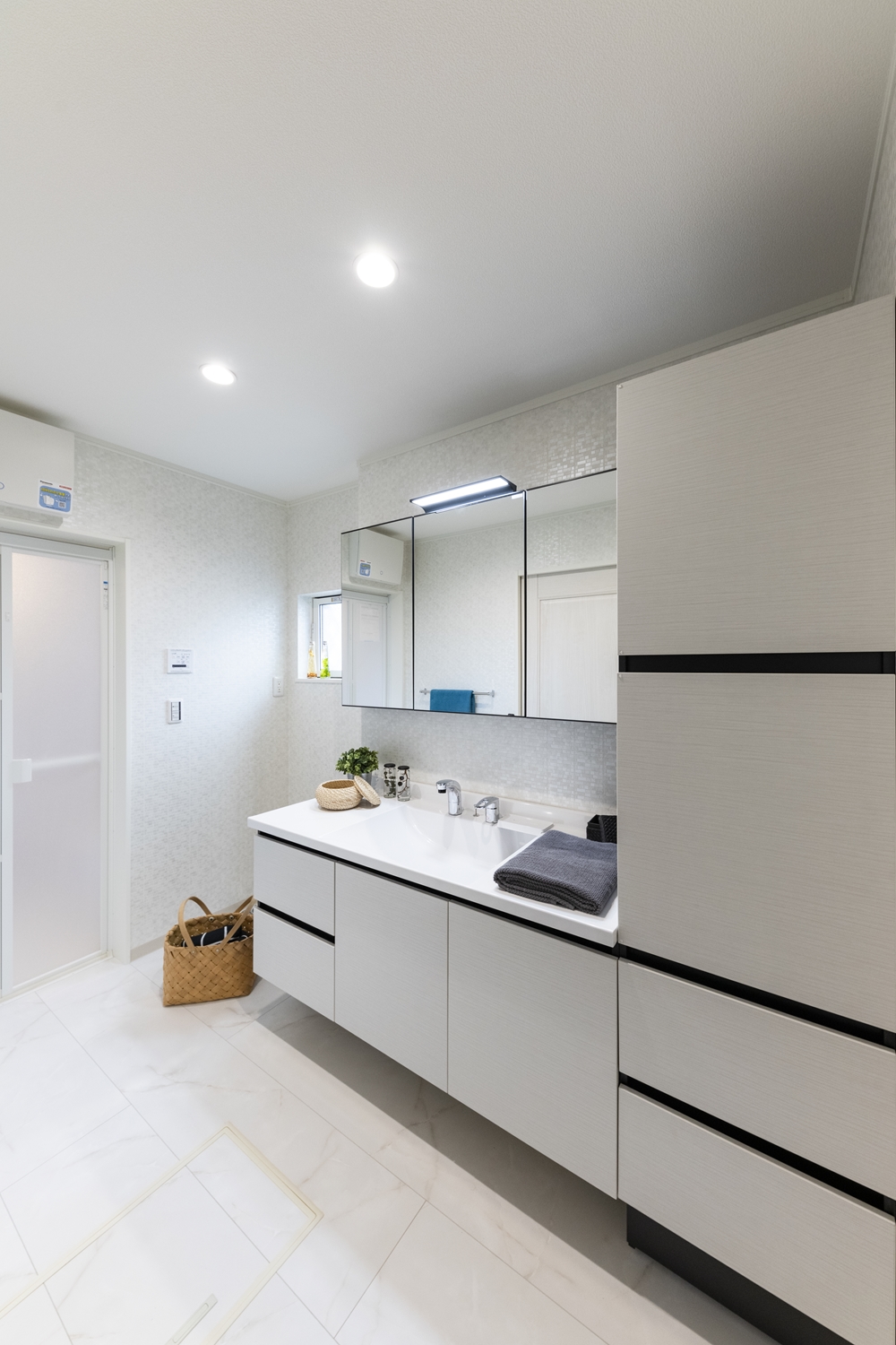 白を基調としたサニタリールーム。ホテルのような洗練された洗面空間が日常を豊かにします。
