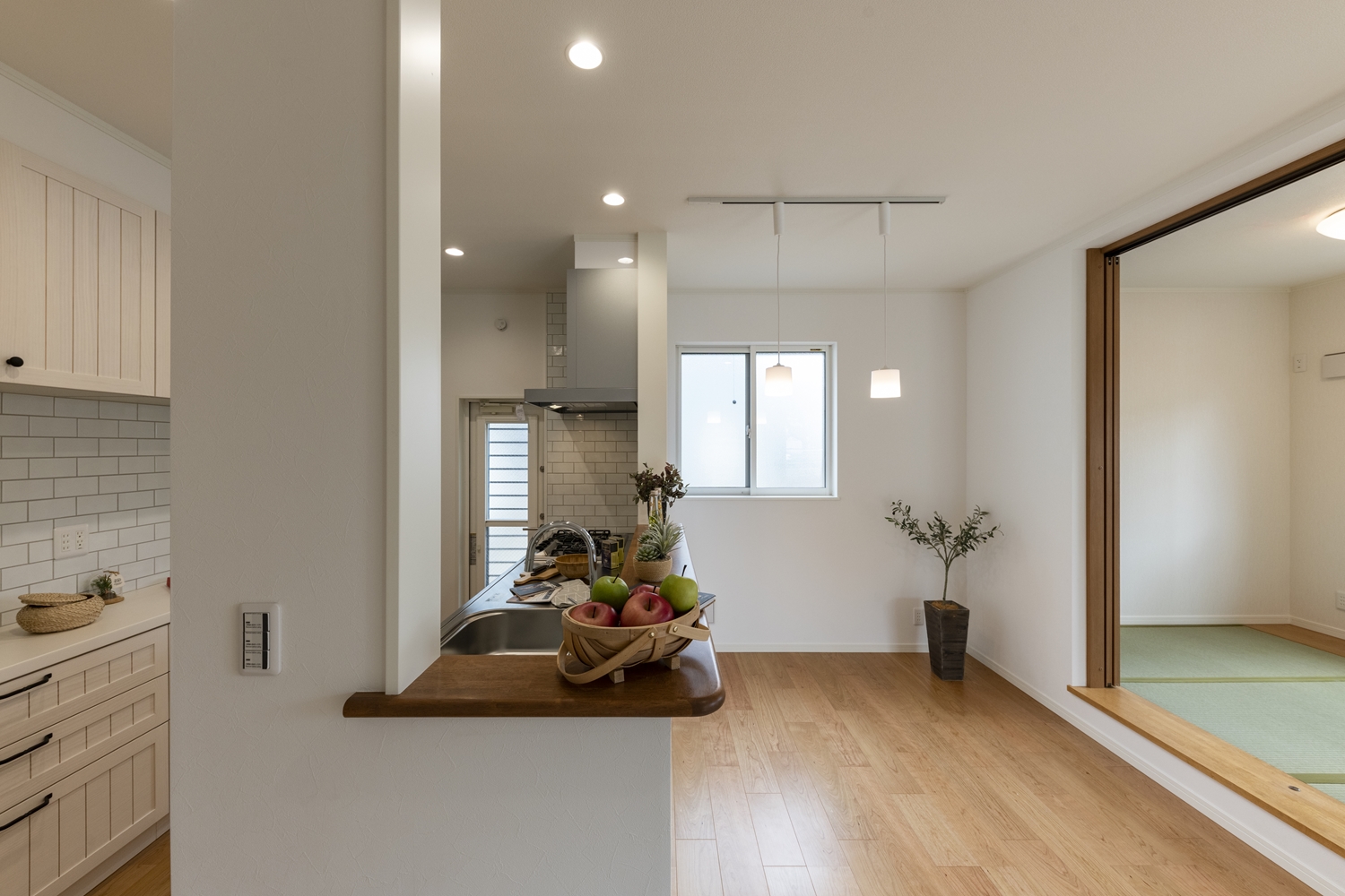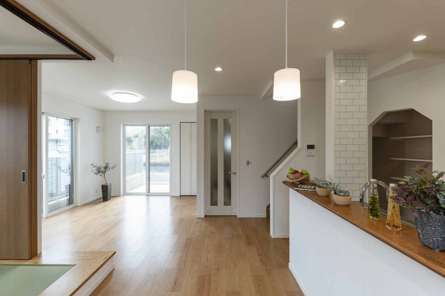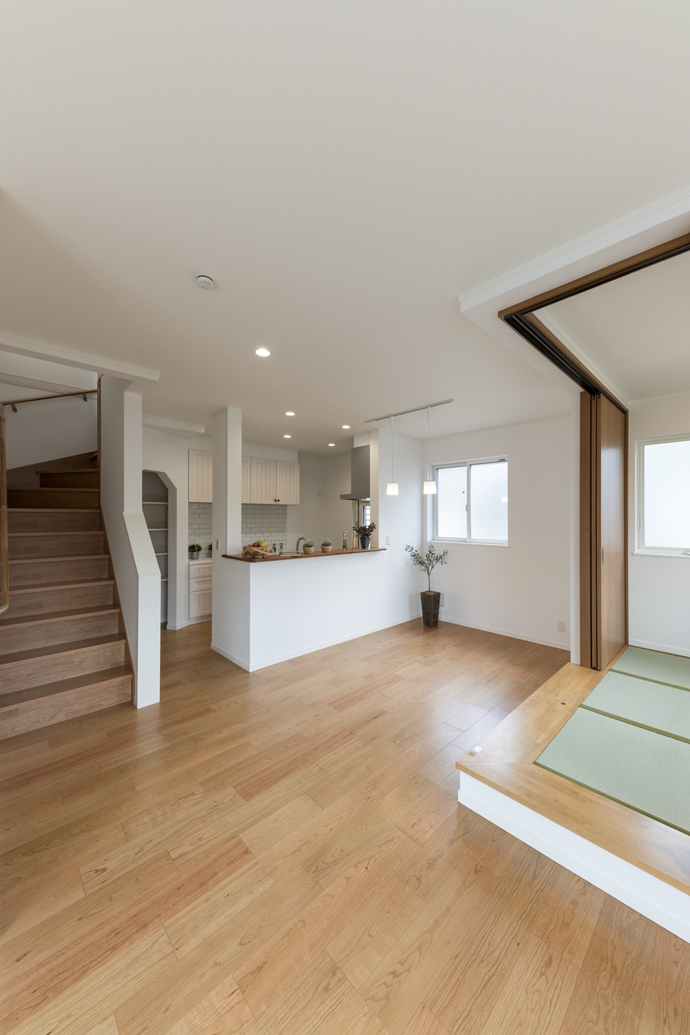 小上がりになった畳スペースのある「和×モダン」の居心地の良いリビング。