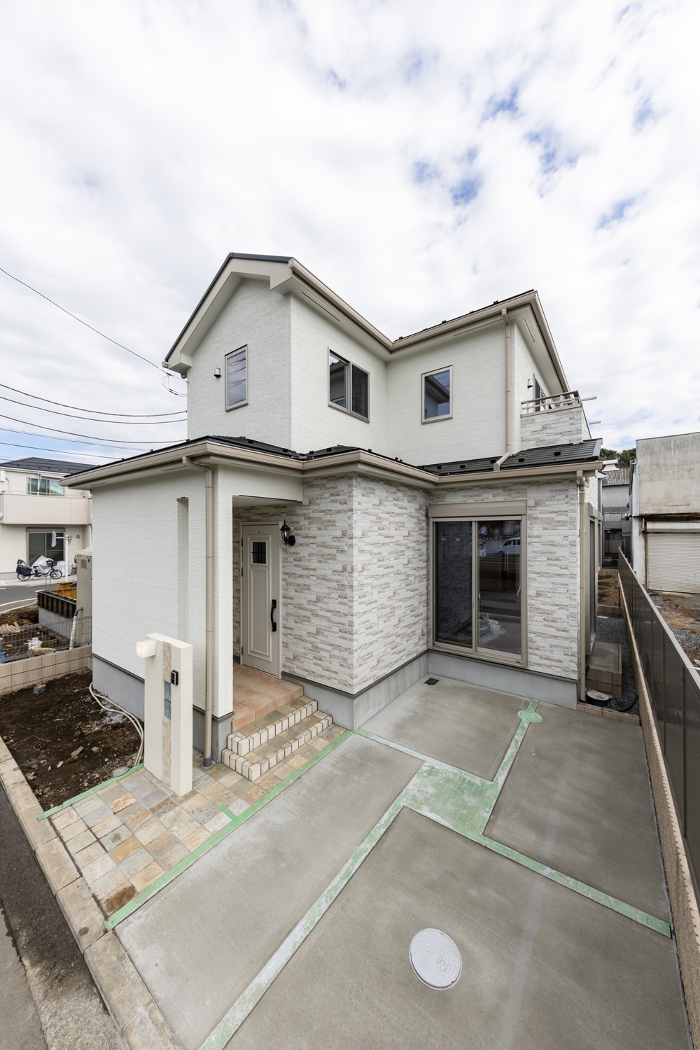 白いサイディングを基調に、表情豊かな石目調のサイディングをアクセントにした、ナチュラル&モダンな外観。