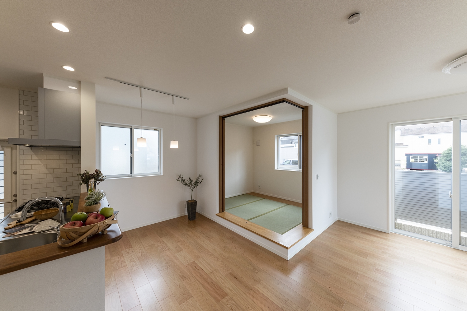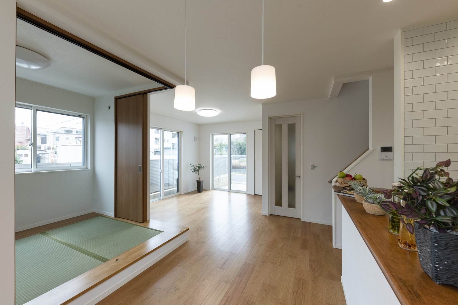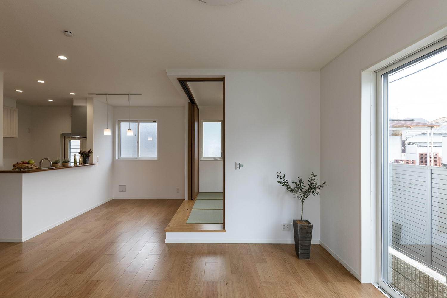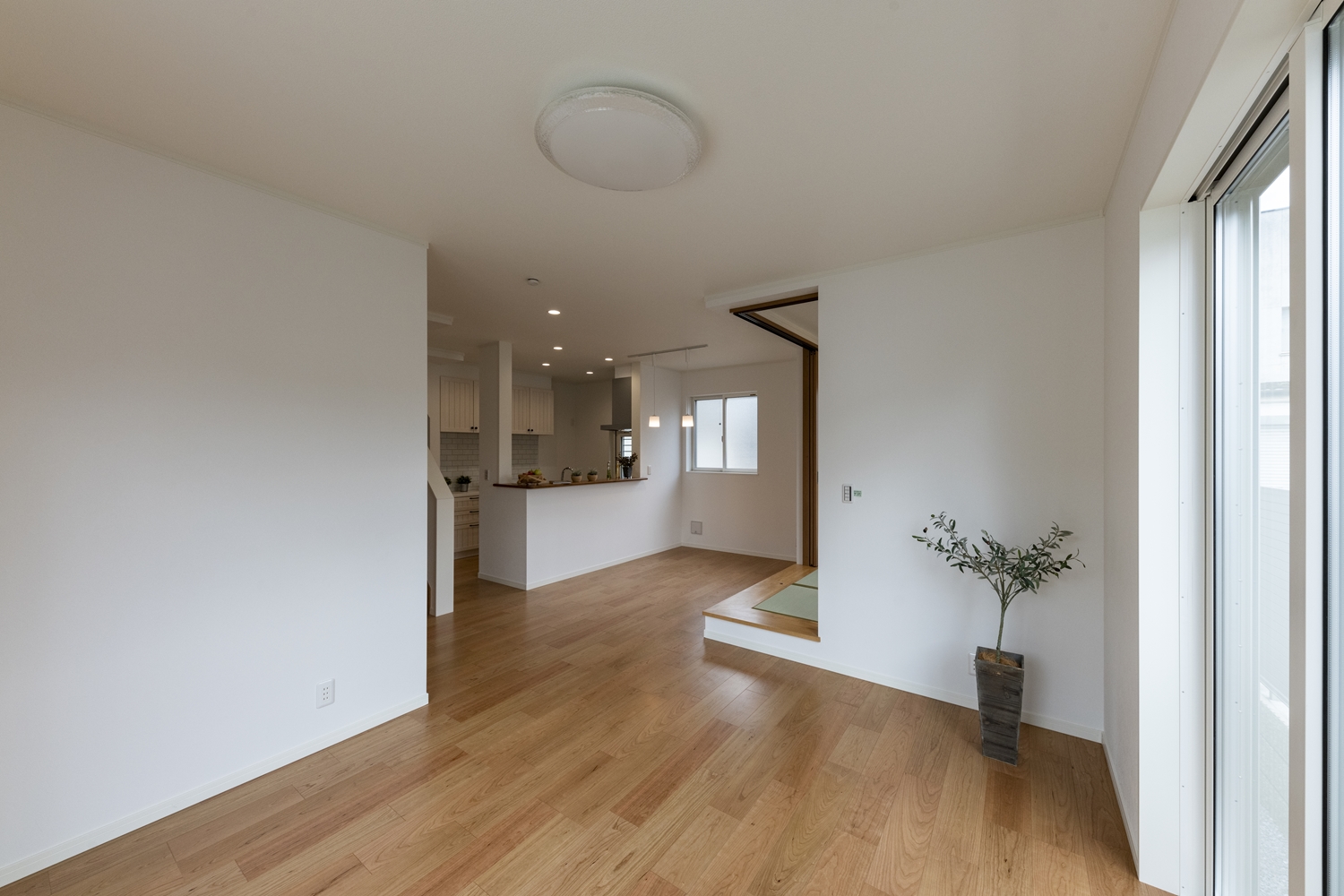 小上がり畳スペースと合わせて20帖超の開放的で広々とした空間のLDK。