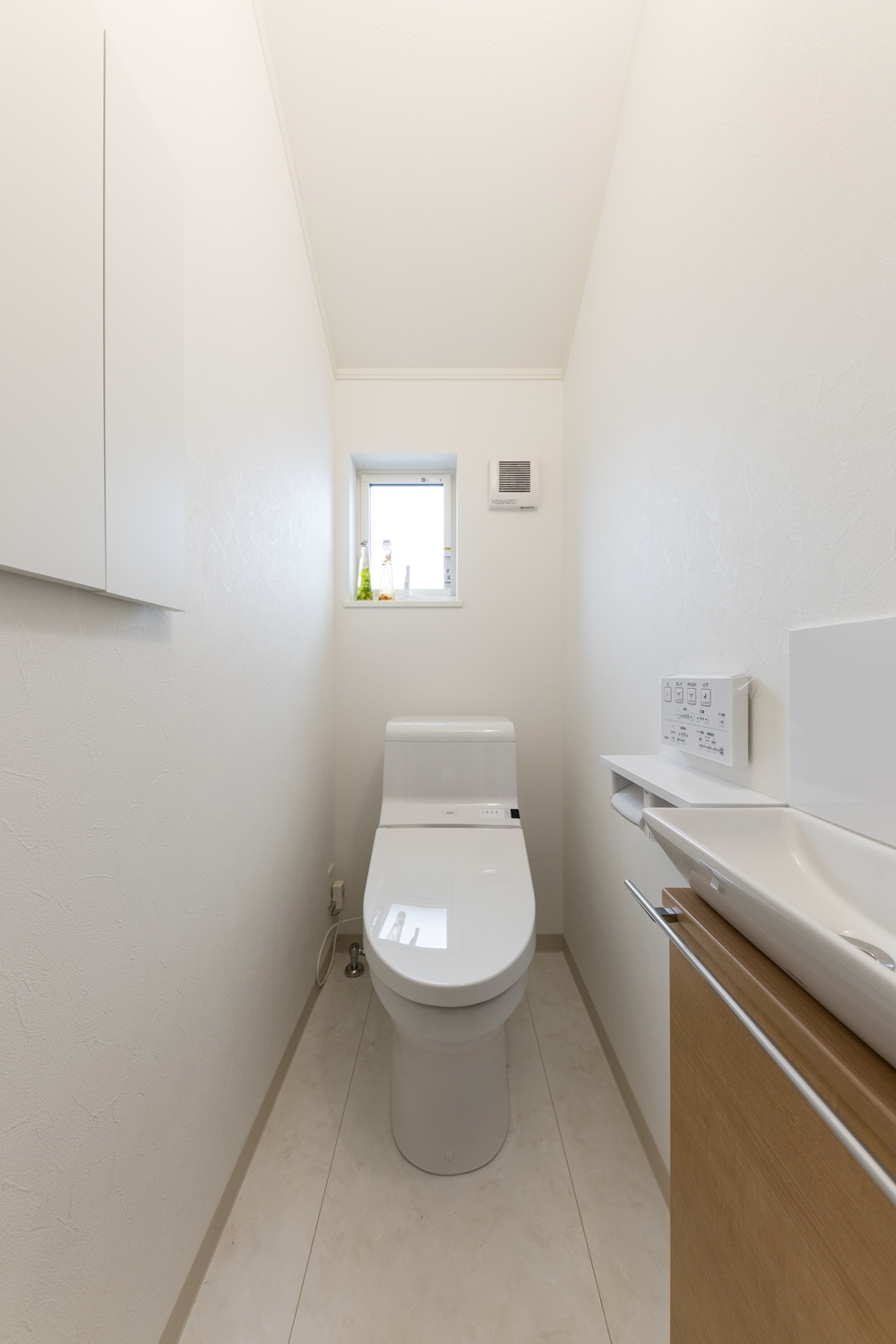 白を基調とした清潔感のある1階トイレ。手洗いや場所をとらないキャビネットを設置して機能的でスッキリとした空間に。