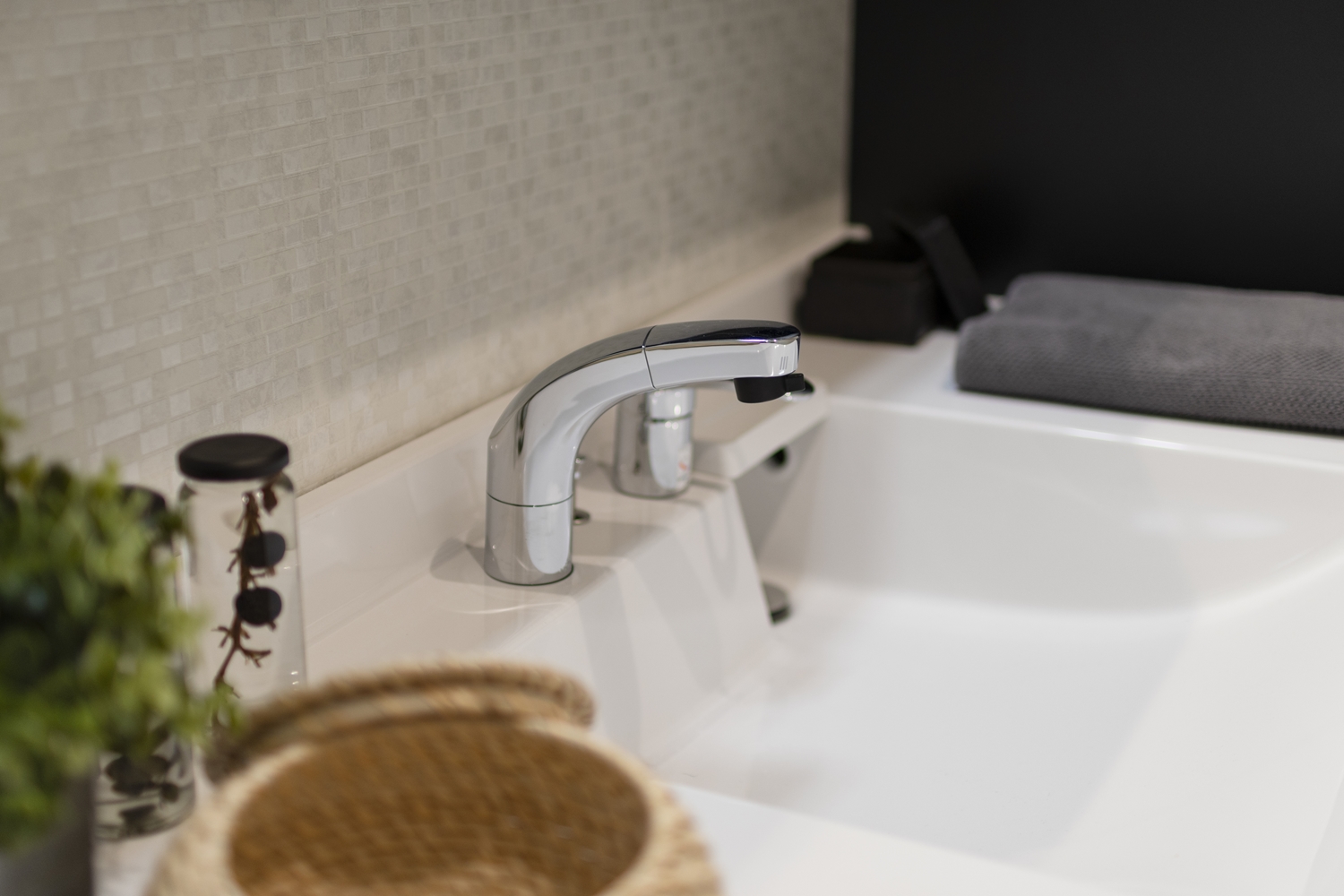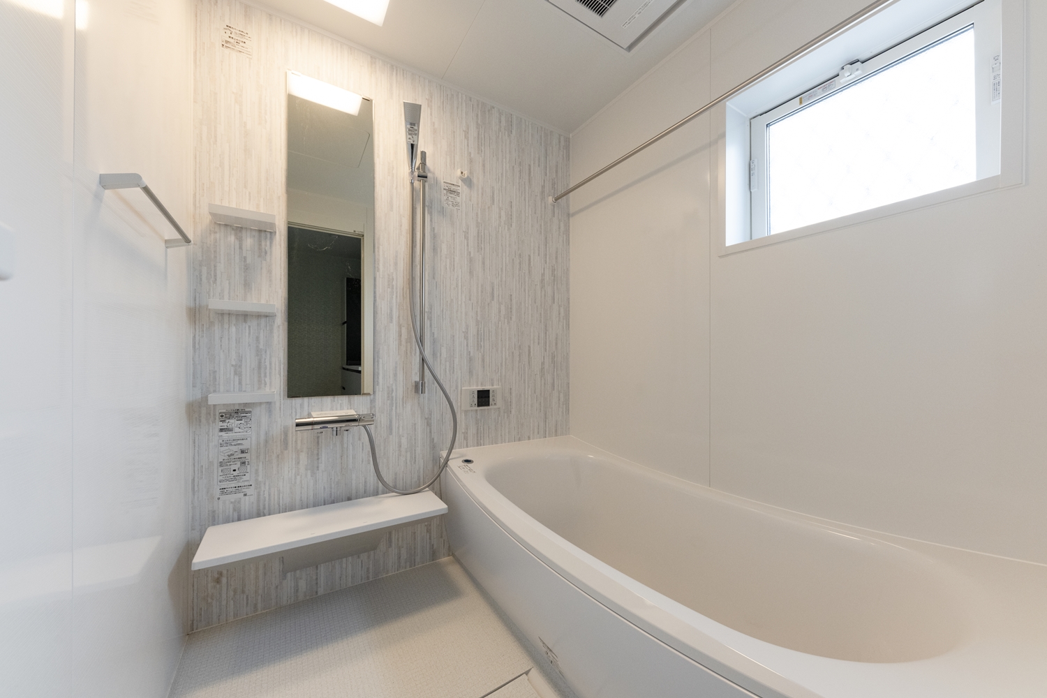 白を基調としたサニタリールーム。さりげなく輝くラメが魅力的な、細かいタイル調のクロスを施しました。