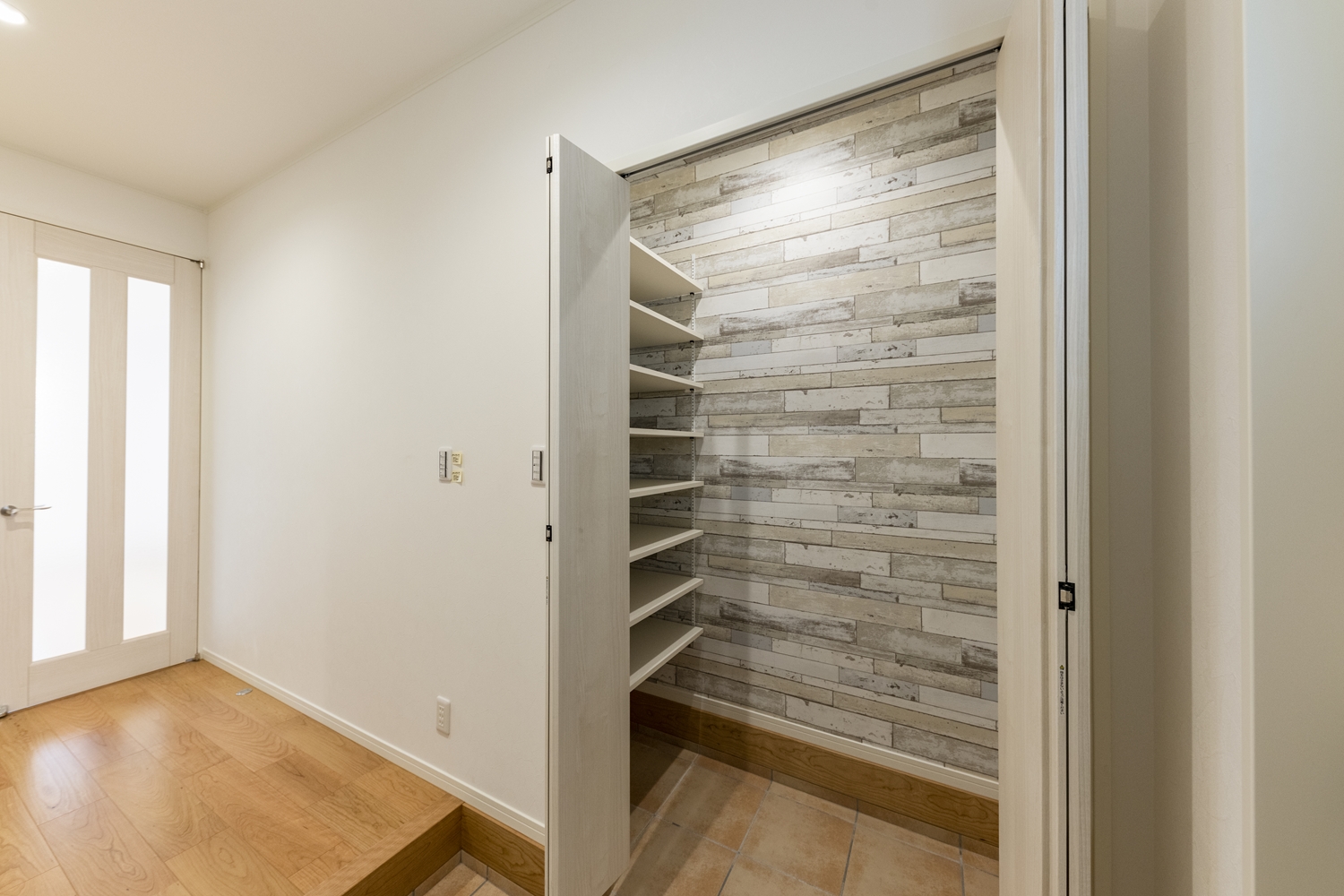 シューズクローク/表情豊かな石目調のクロスをアクセントにしました。