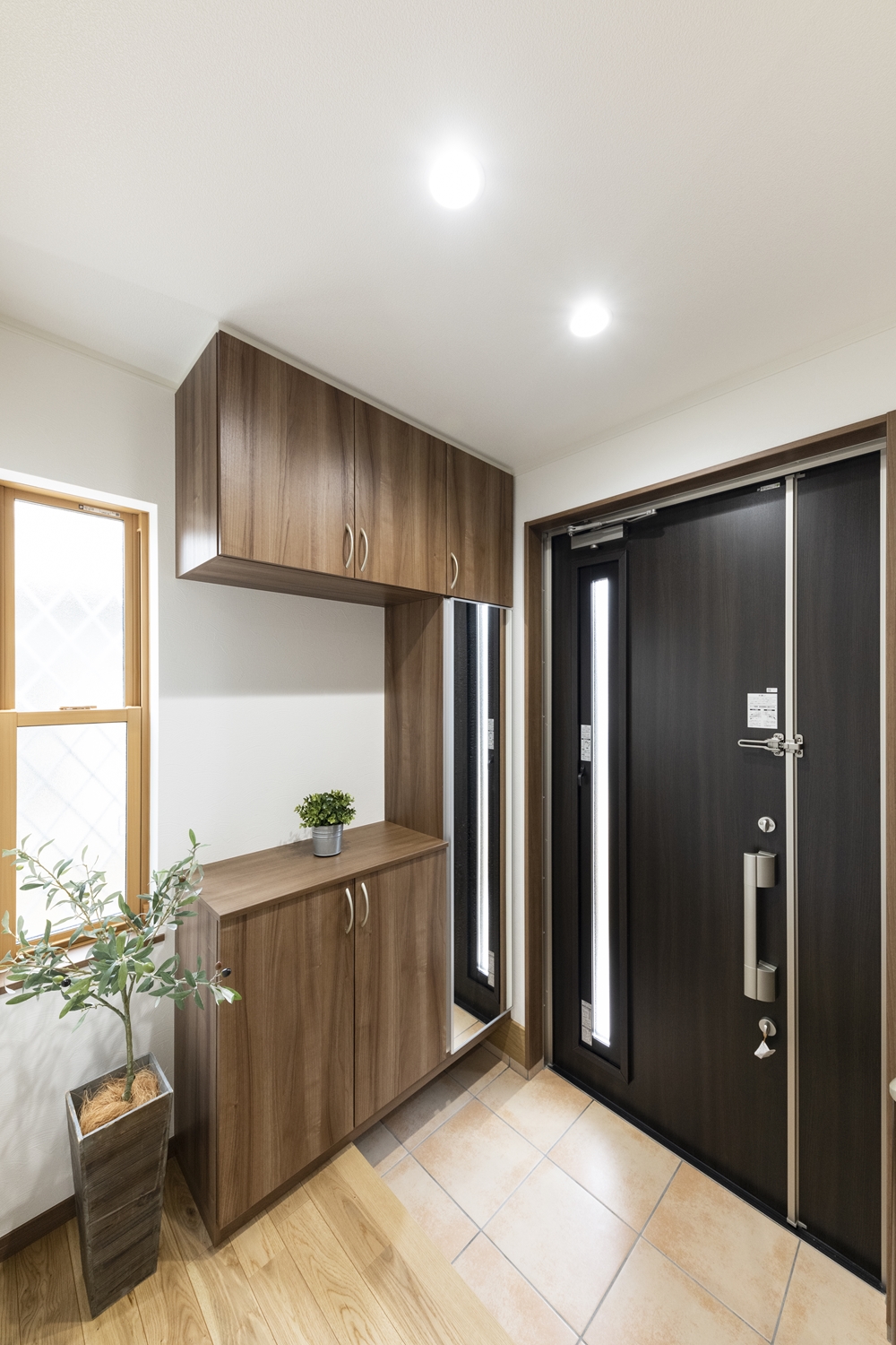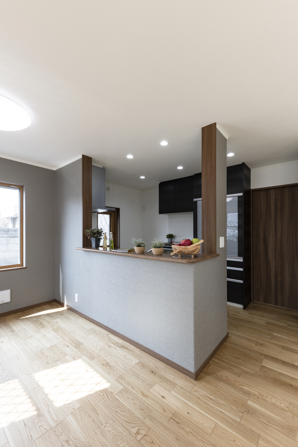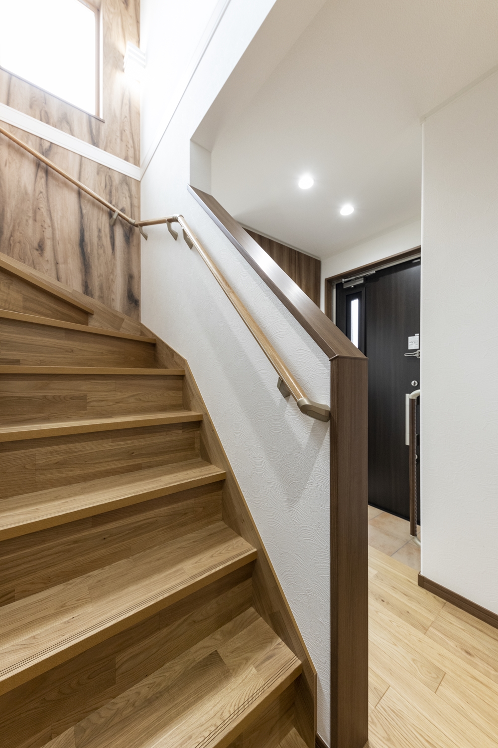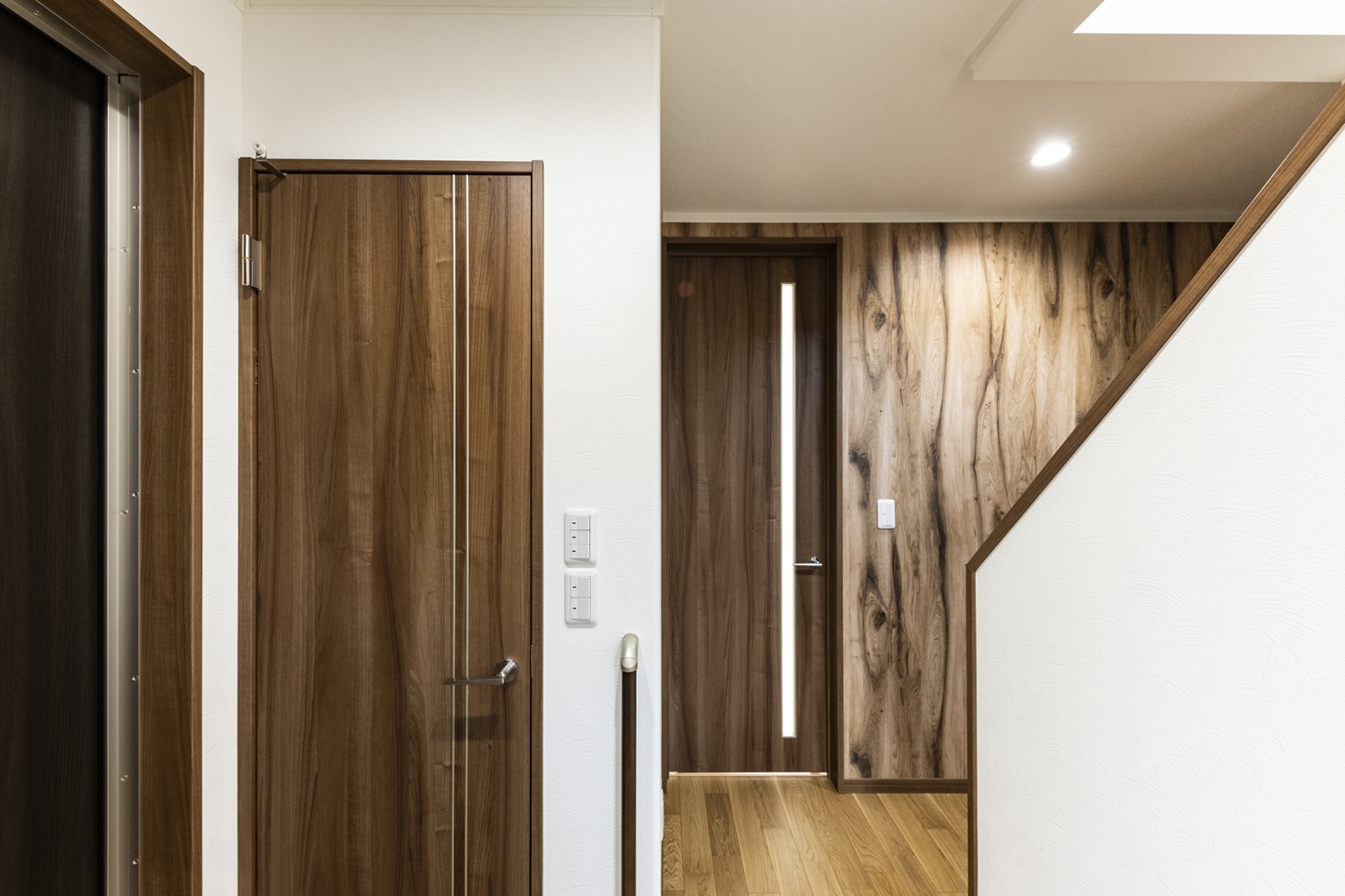 スタイリッシュな外観は、ストーン調サイディング×ブラックストライプのアクセント。ダークブラウンの扉は、美しい光沢を放ち、上品な木目デザインのインテリアに仕上がりました。
