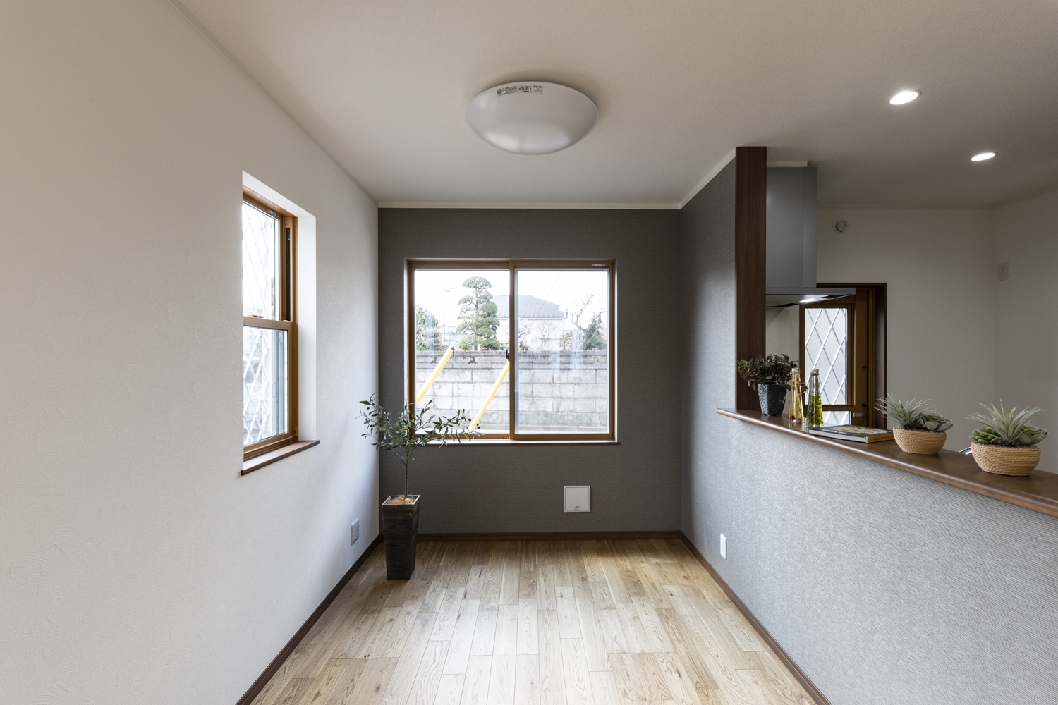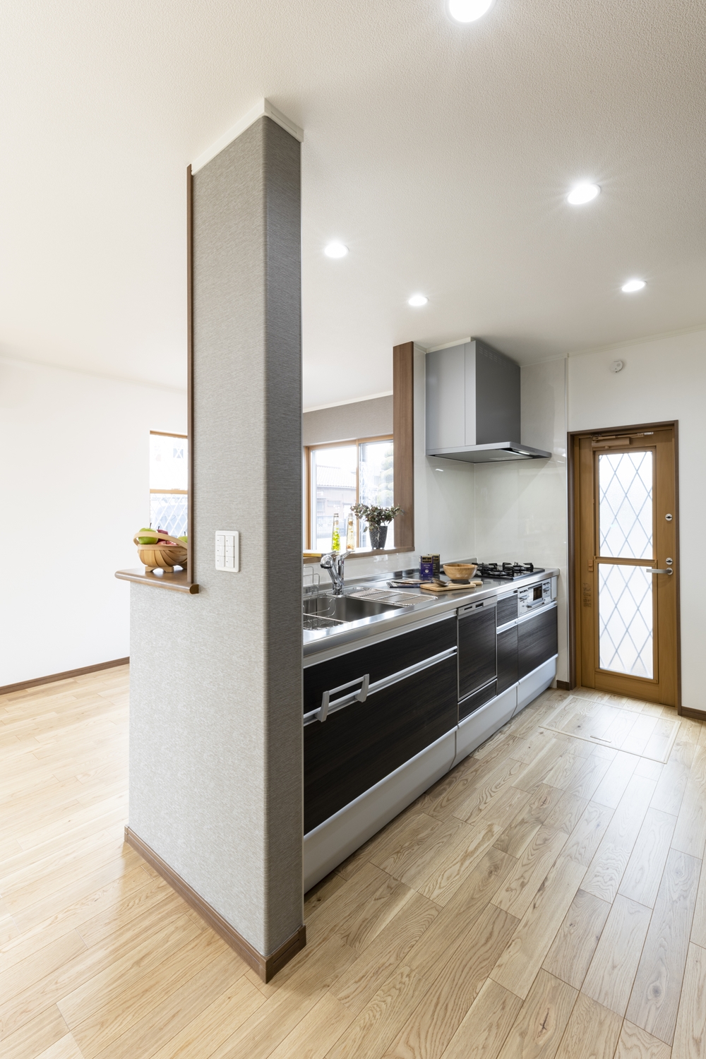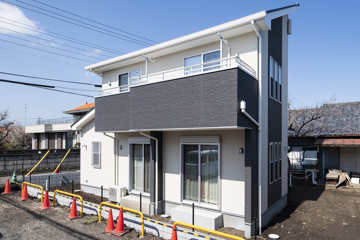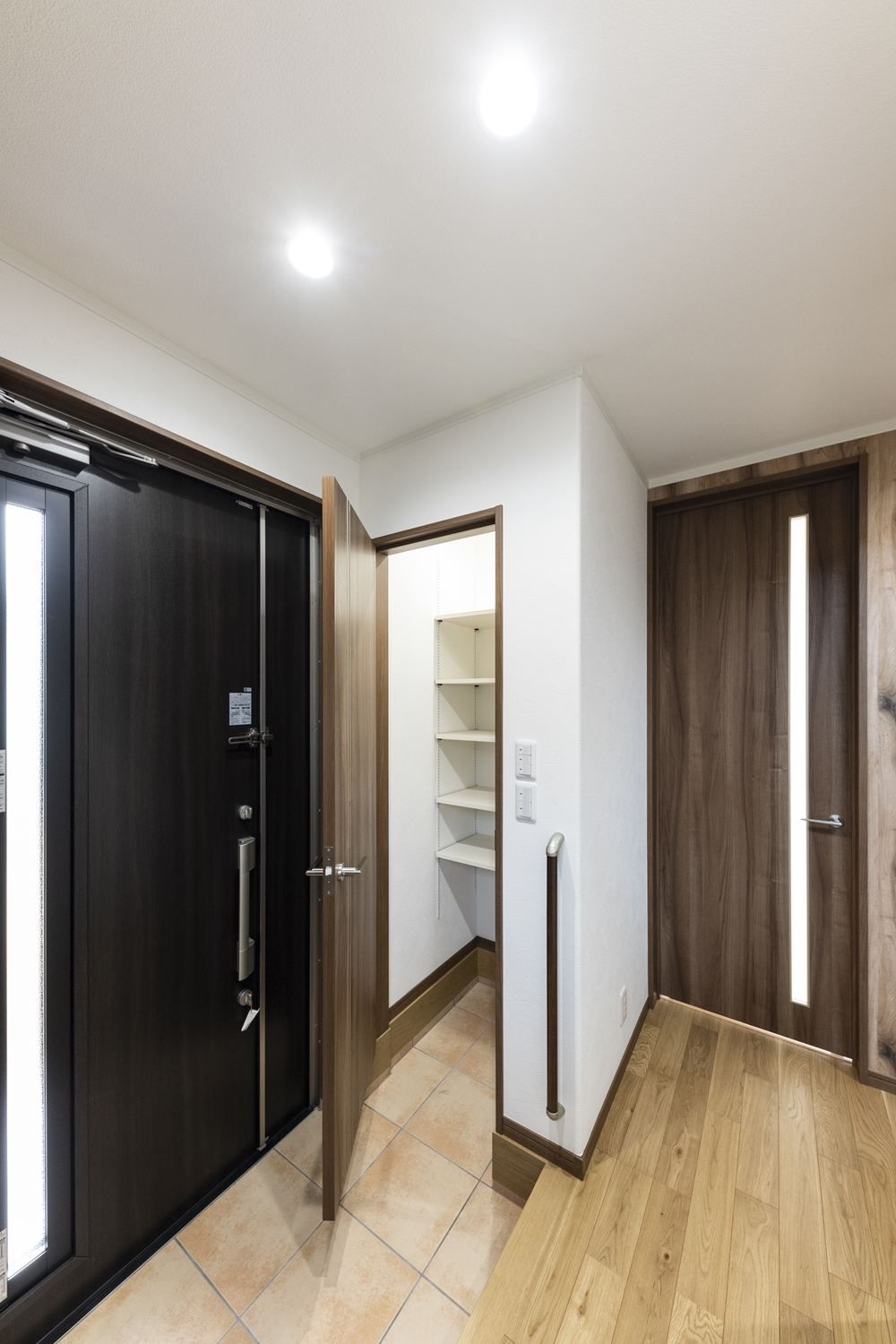 スタイリッシュな外観は、ストーン調サイディング×ブラックストライプのアクセント。ダークブラウンの扉は、美しい光沢を放ち、上品な木目デザインのインテリアに仕上がりました。