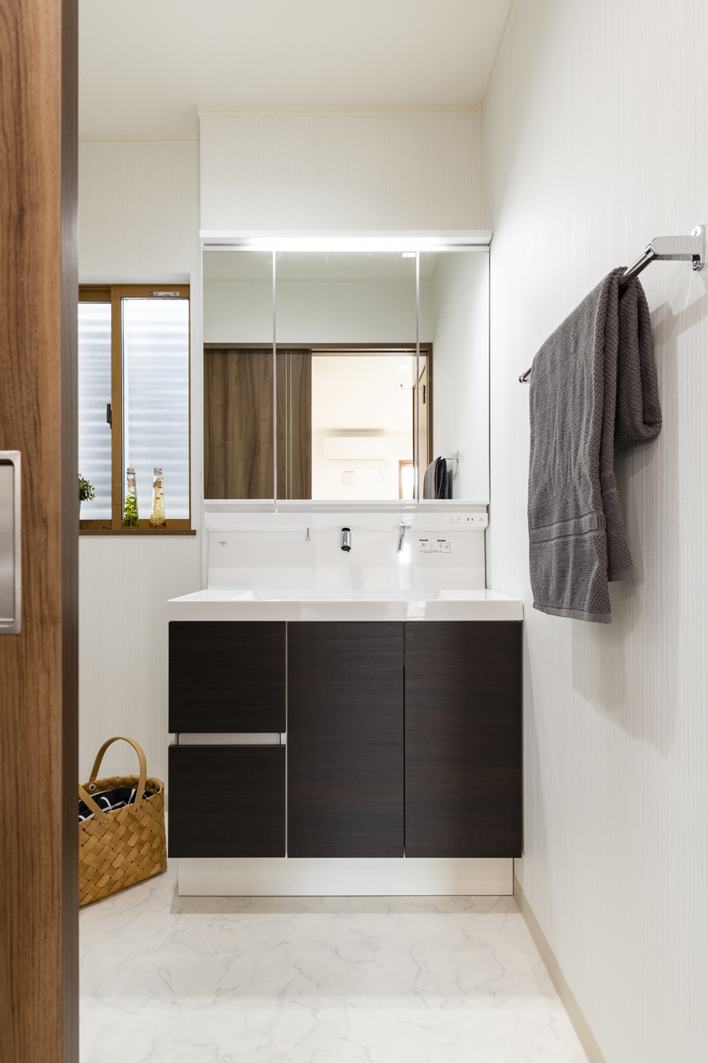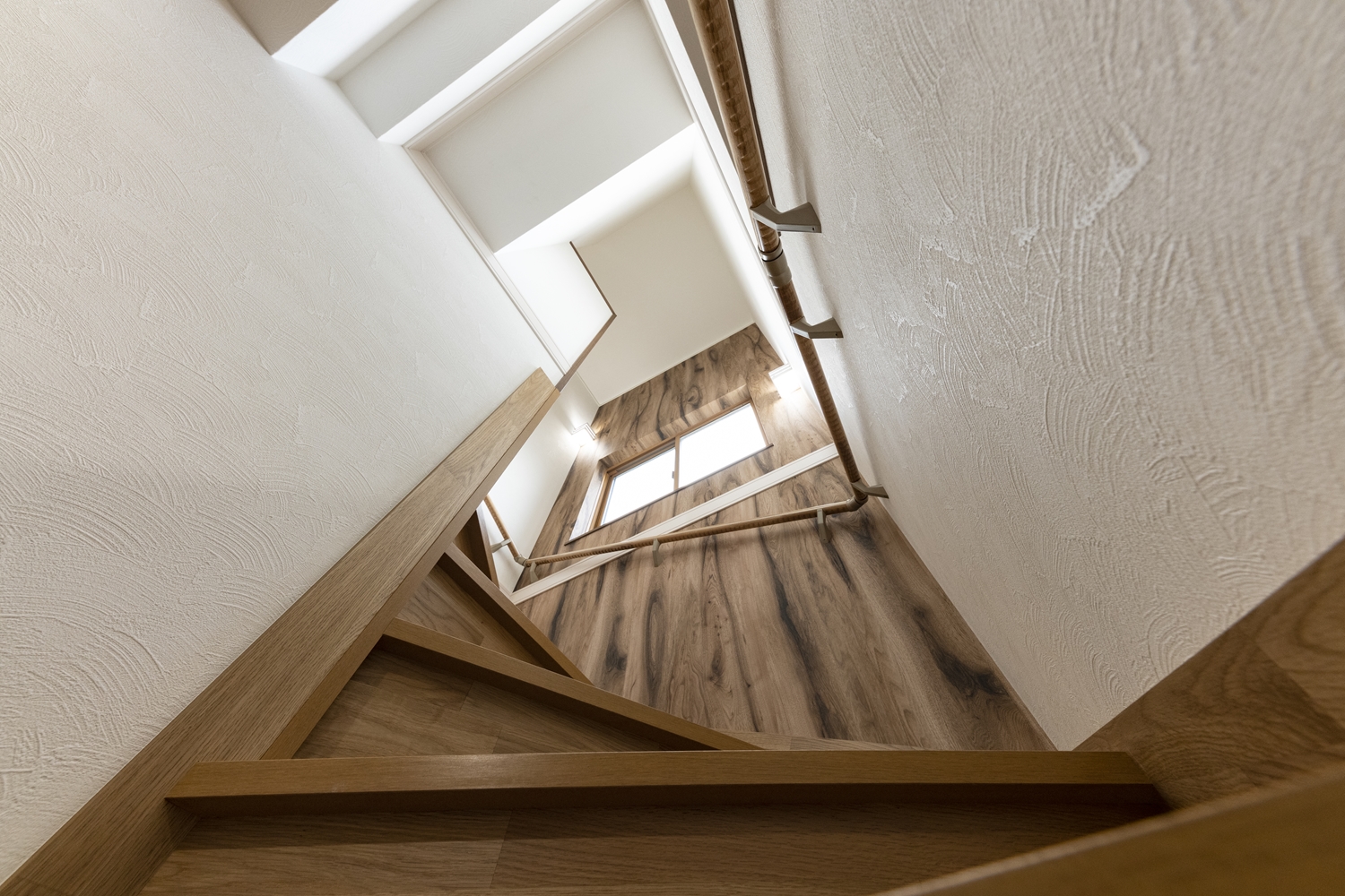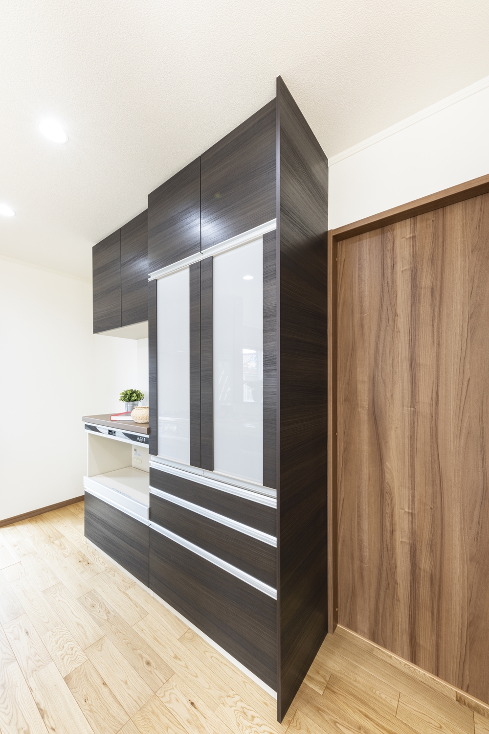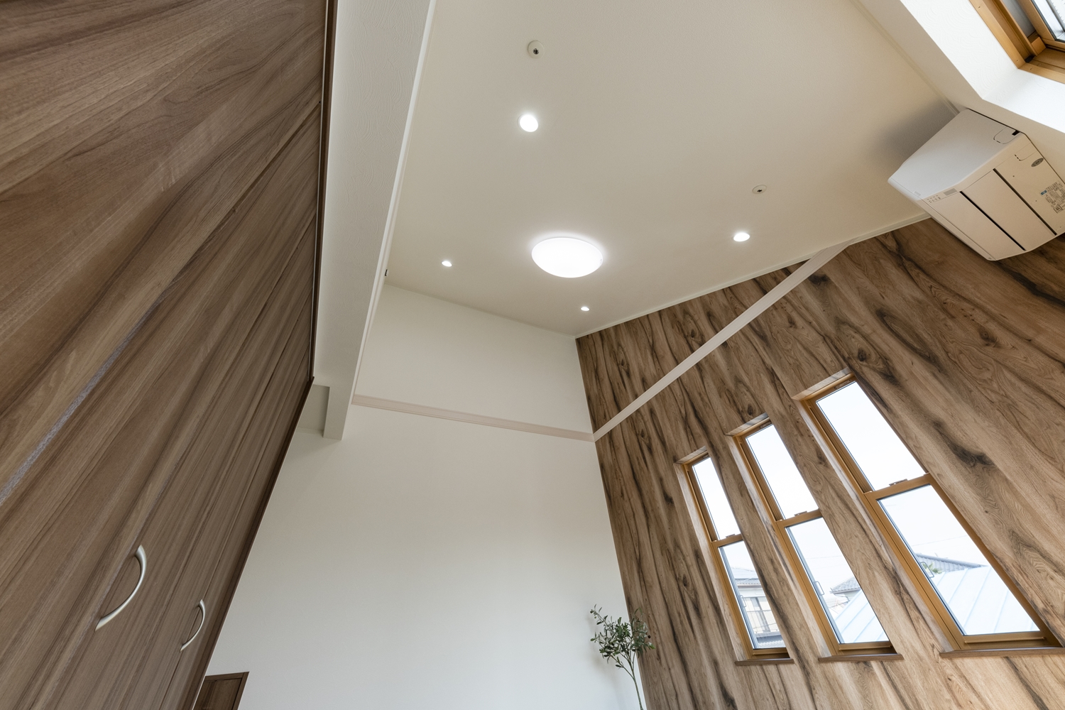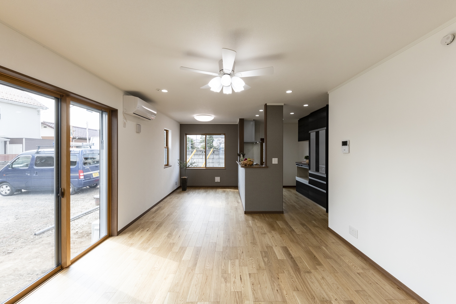 スタイリッシュな外観は、ストーン調サイディング×ブラックストライプのアクセント。ダークブラウンの扉は、美しい光沢を放ち、上品な木目デザインのインテリアに仕上がりました。