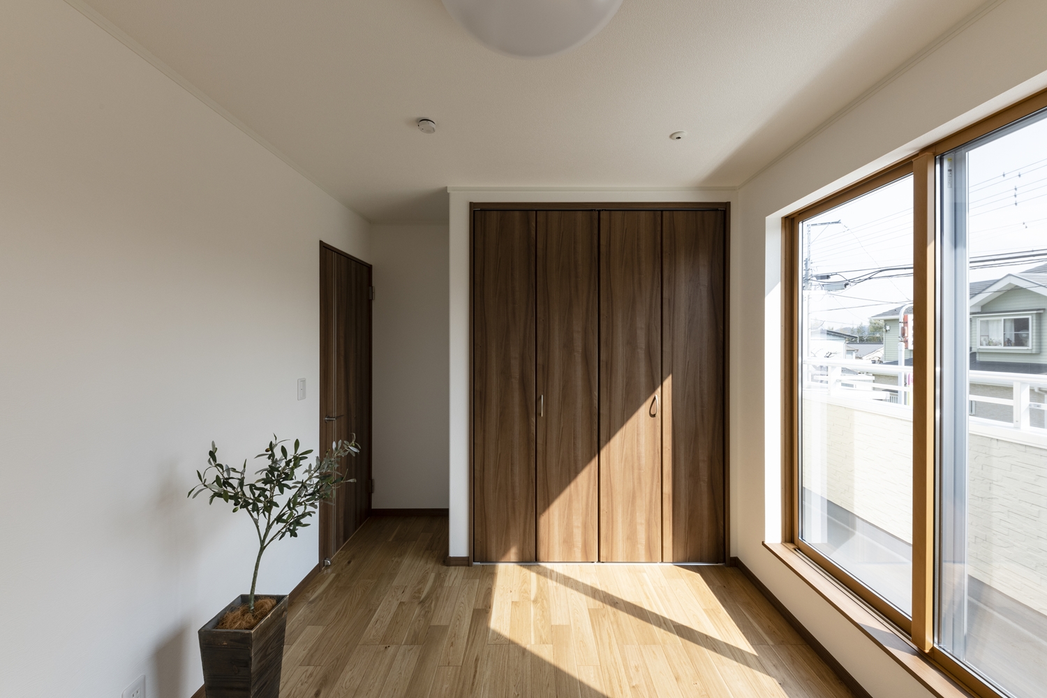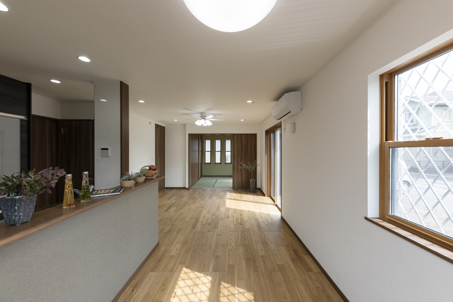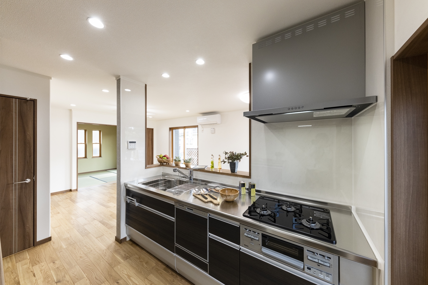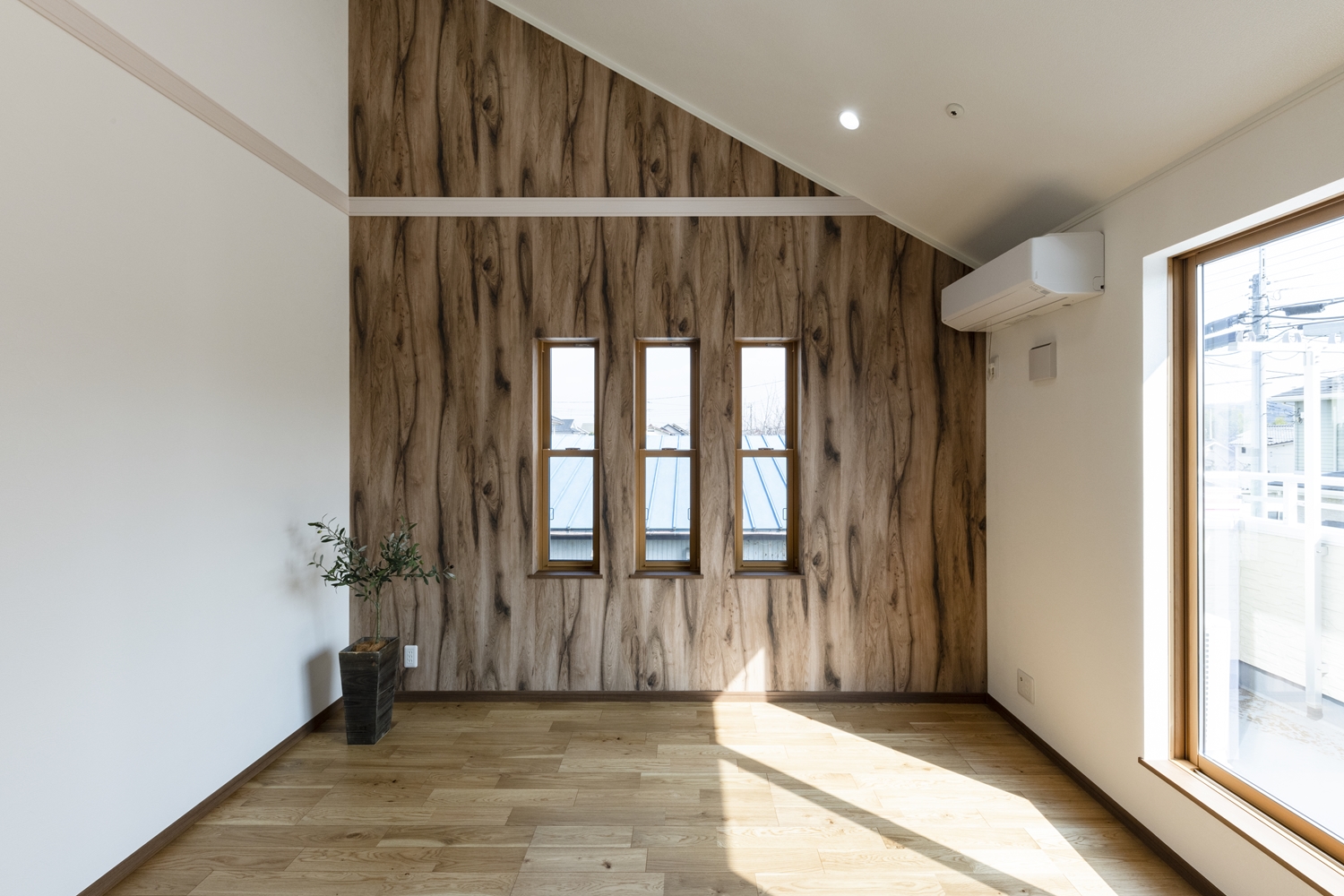 スタイリッシュな外観は、ストーン調サイディング×ブラックストライプのアクセント。ダークブラウンの扉は、美しい光沢を放ち、上品な木目デザインのインテリアに仕上がりました。