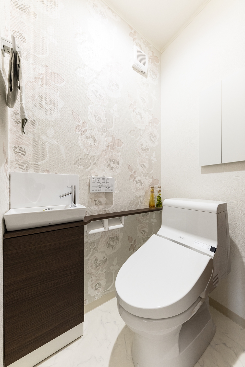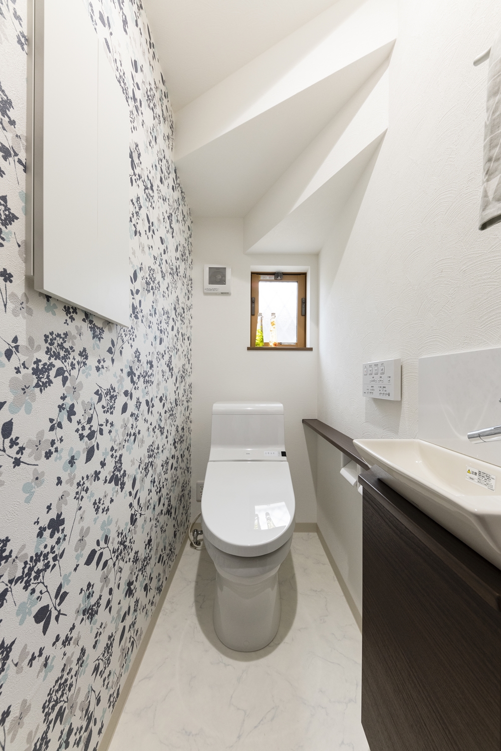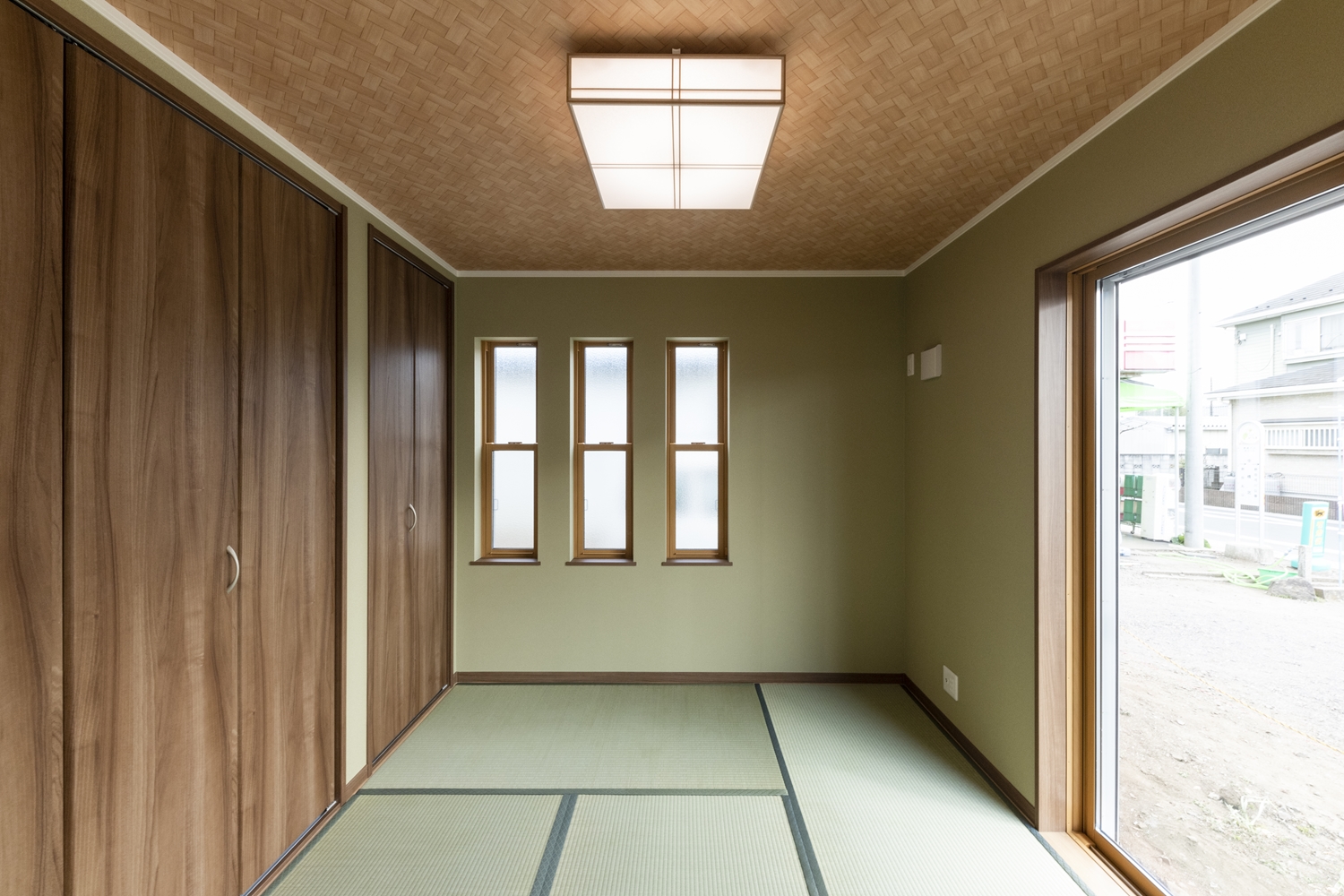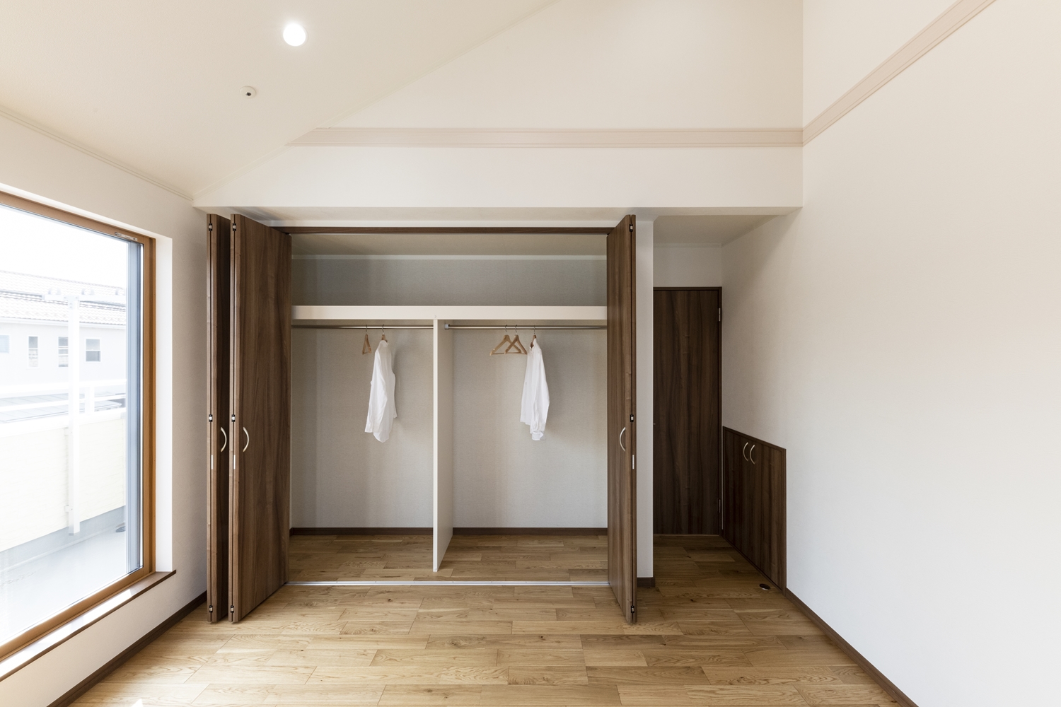 スタイリッシュな外観は、ストーン調サイディング×ブラックストライプのアクセント。ダークブラウンの扉は、美しい光沢を放ち、上品な木目デザインのインテリアに仕上がりました。