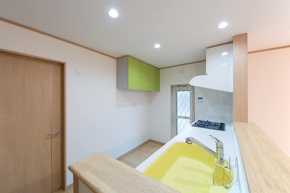 ライトグリーンのキッチン扉がナチュラルな室内を引き立てます。