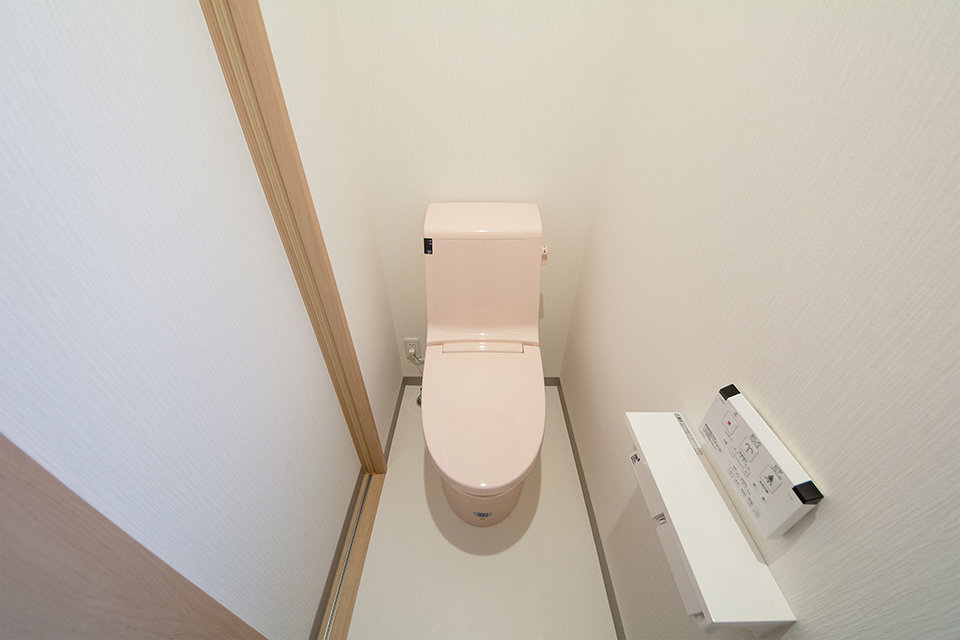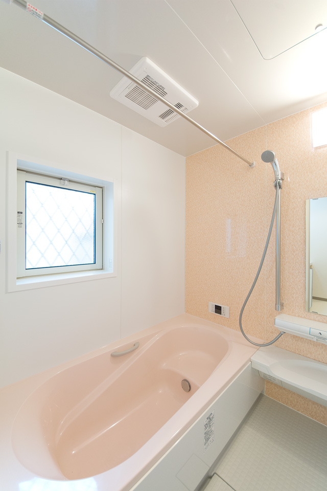 ピンクを基調とした可愛らしい空間のバスルーム。