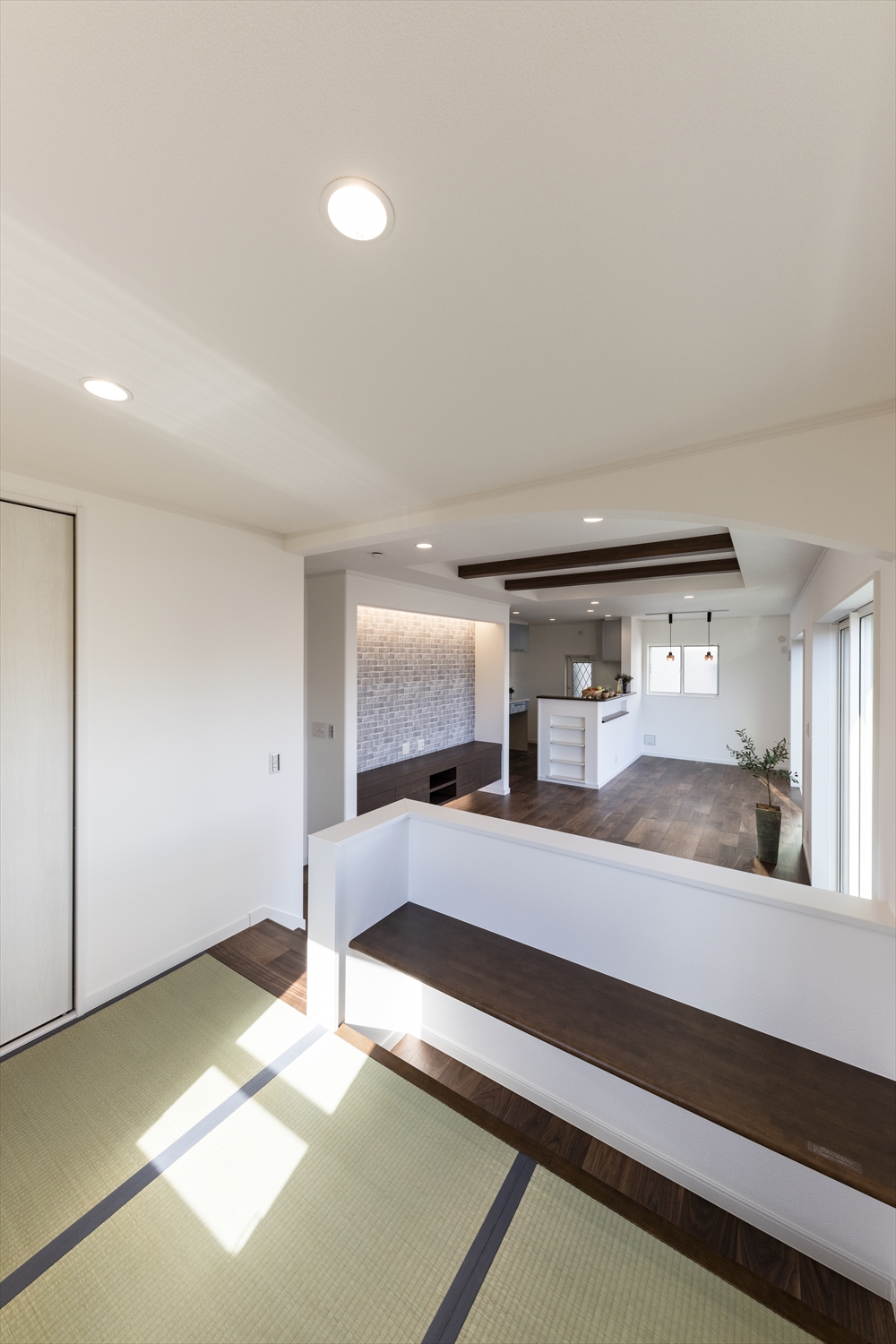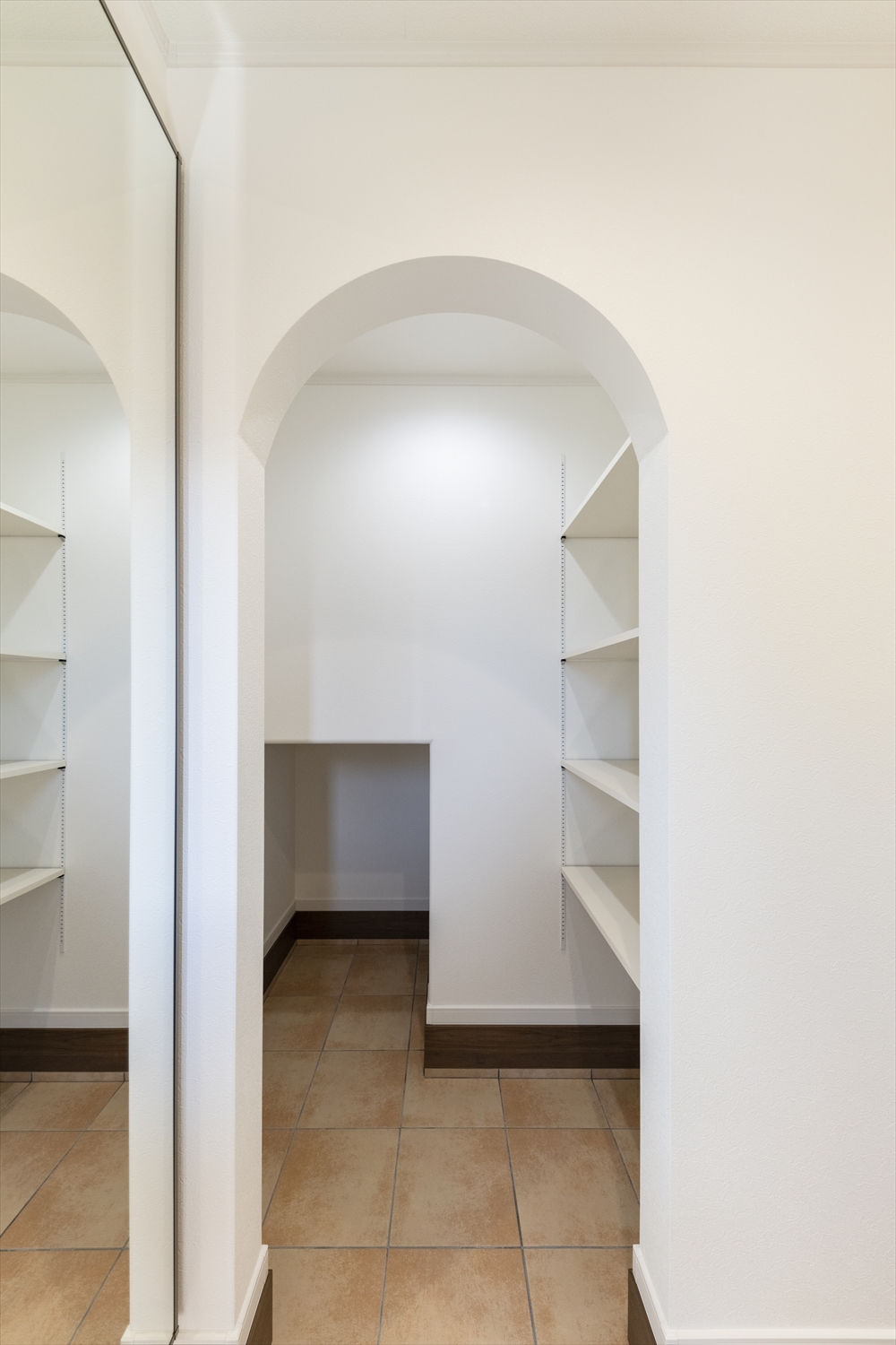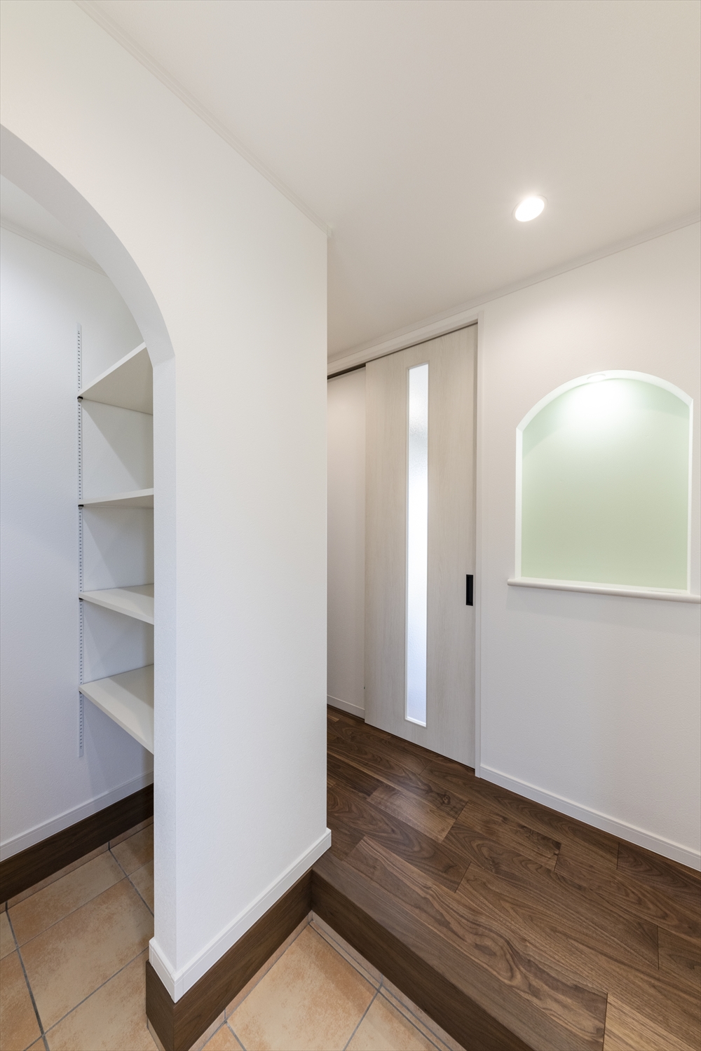 北欧風のナチュラルな外観と、アンティークでモダンなインテリア。玄関を入ると、やわらかなアーチのシューズクロークがお出迎え。所々におしゃれなニッチを設え、季節や気分に合わせディスプレイも楽しめます。