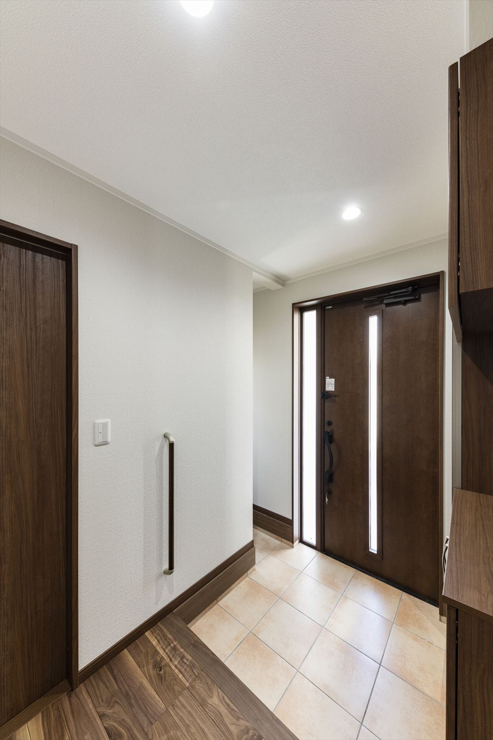 落ち着いた雰囲気の玄関ホール。玄関の昇り降りをやさしくサポートする手摺を設置しました。