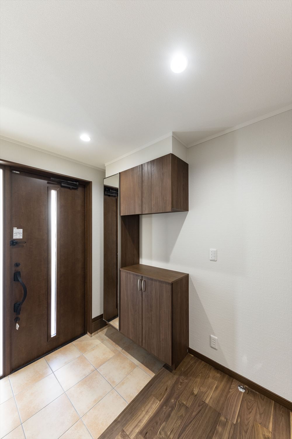玄関ドアの縦スリットから自然の光が差し込み明るく開放感があります。大切な人を迎えたくなる玄関です。