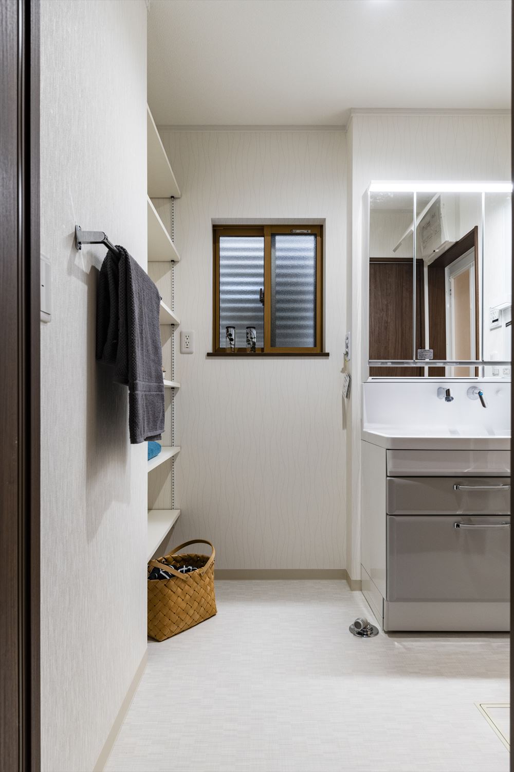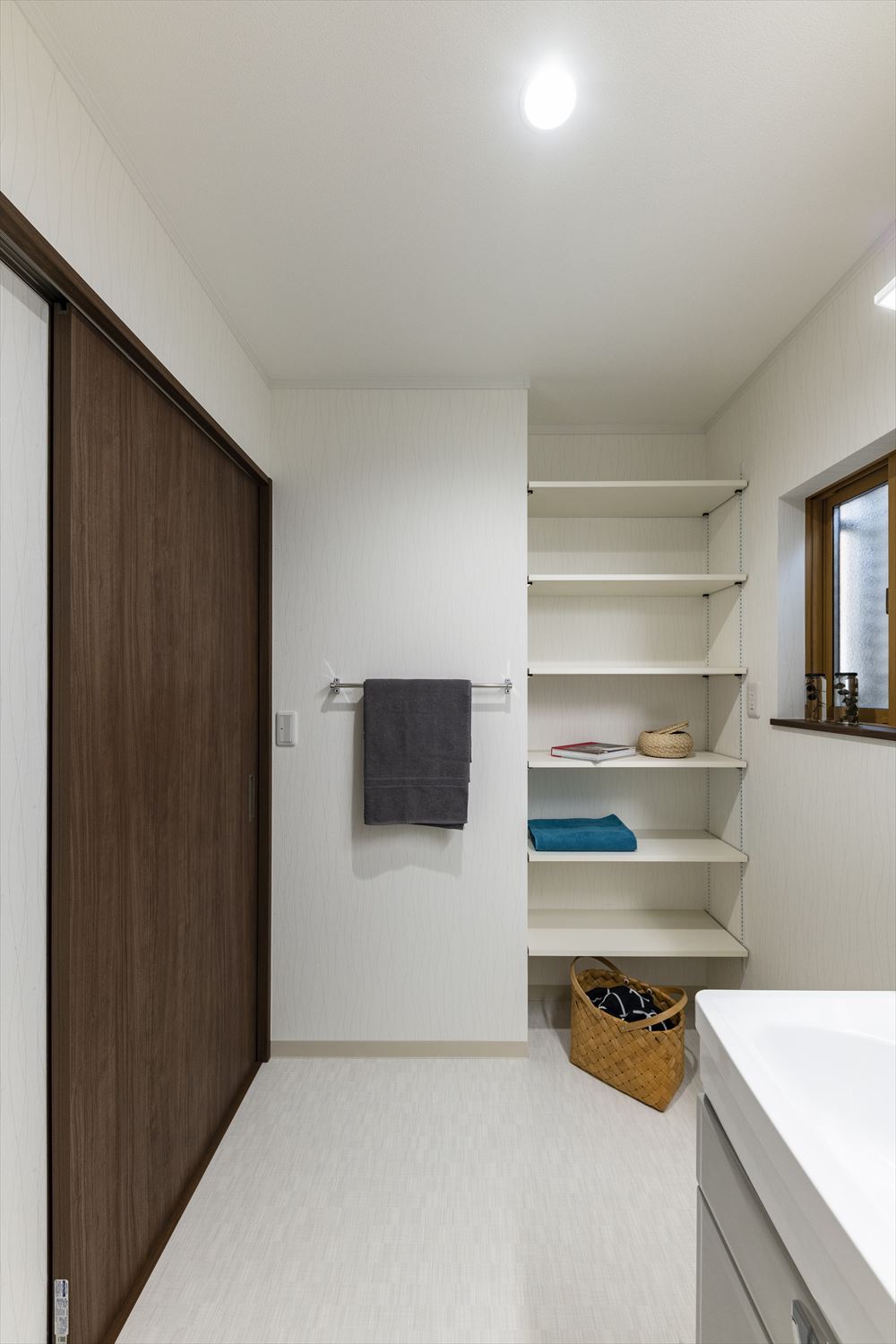 タオルや洗剤等をたっぷり収納できる可動式のリネン棚を設置したサニタリールーム。
