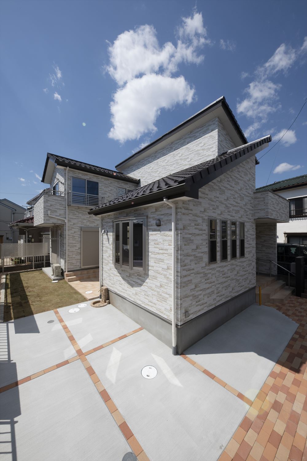 ブラウンの瓦屋根が印象的な外観デザイン。外壁には白の石積み調サイディングをあしらい、ナチュラルであたたかみのあるデザインに仕上がりました。