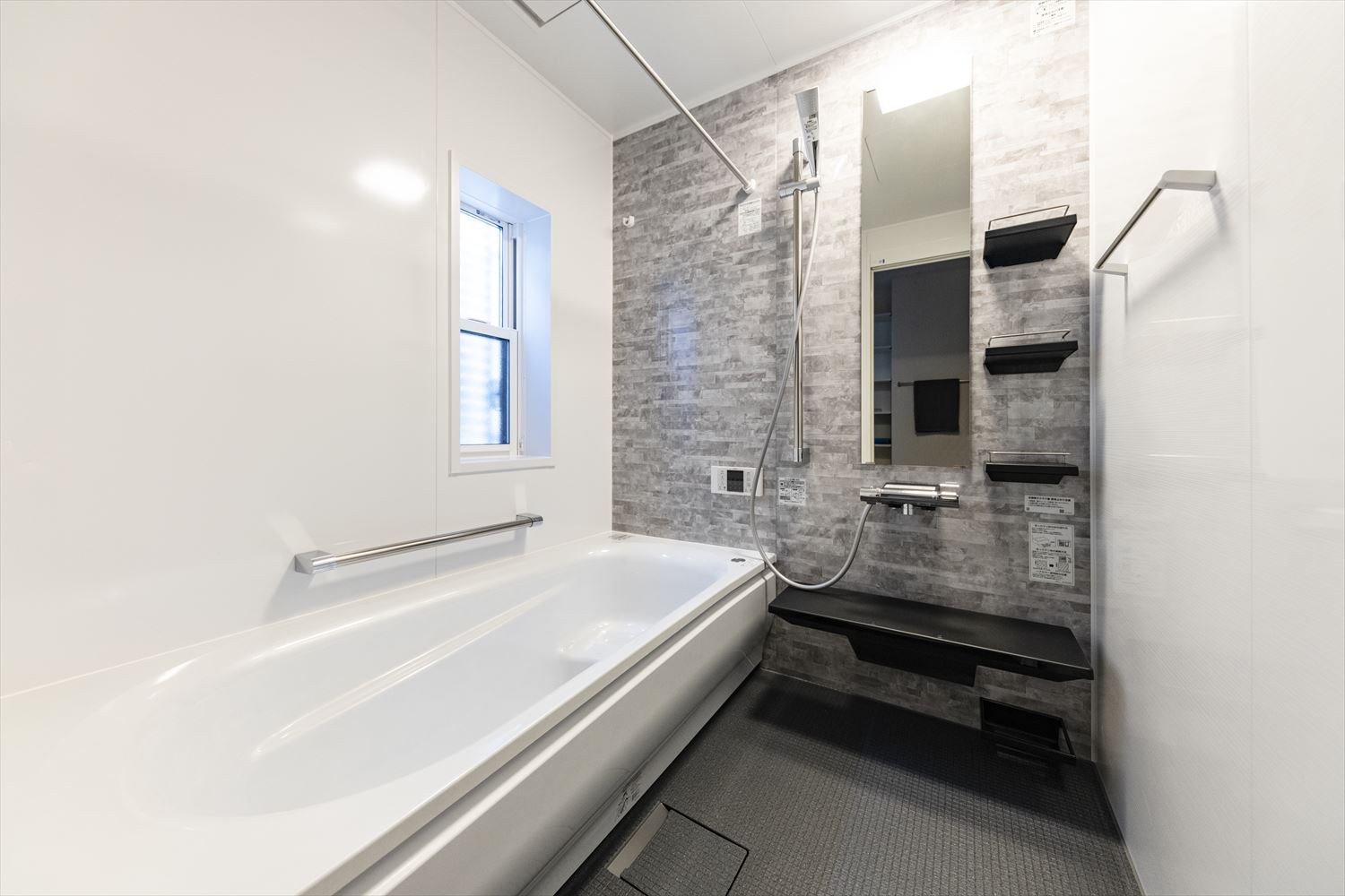 天然石の豊かな表情をモチーフにした、濃いグレー色のアクセントパネルが上質な空間を演出します。