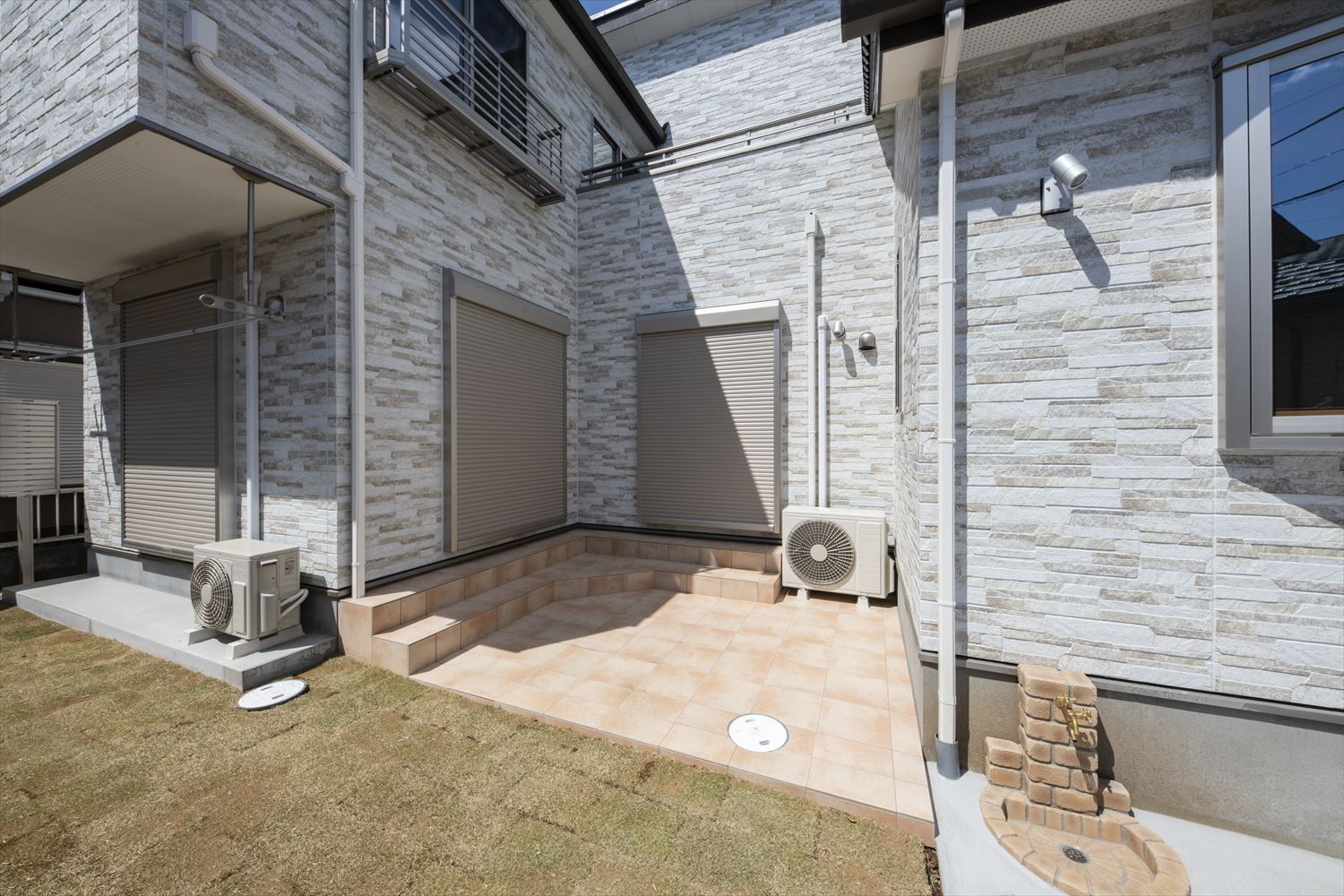 ワンちゃんと過ごしたり、お子様のプール遊びや、バーベキューができて、お掃除もしやすいタイルテラスを設えました。