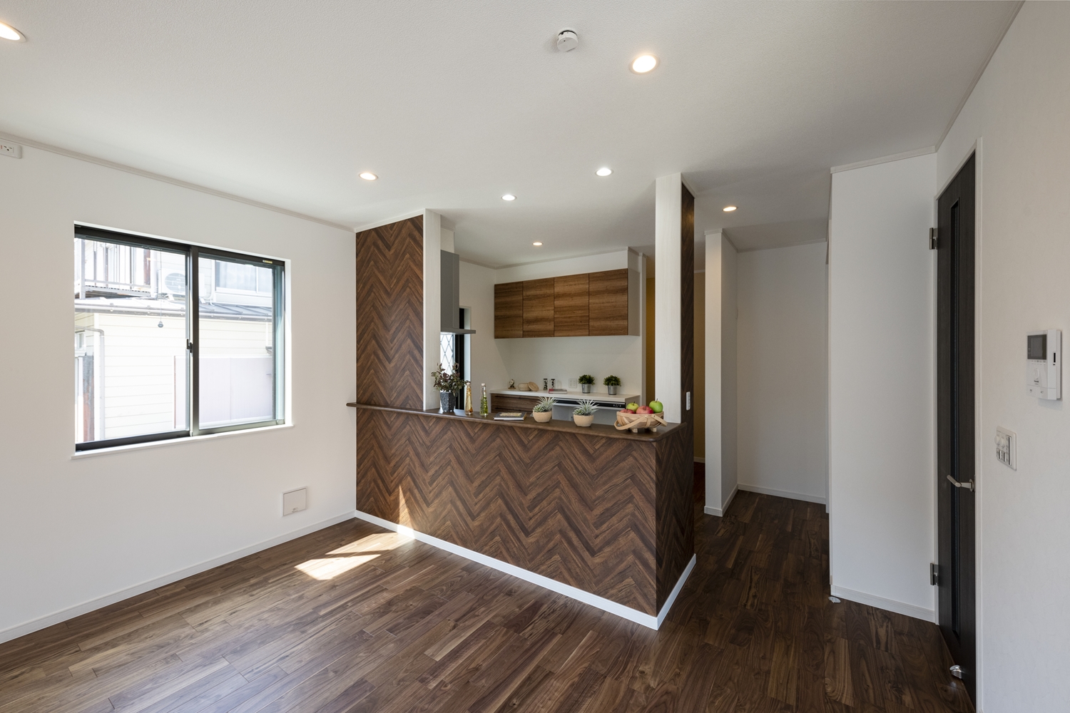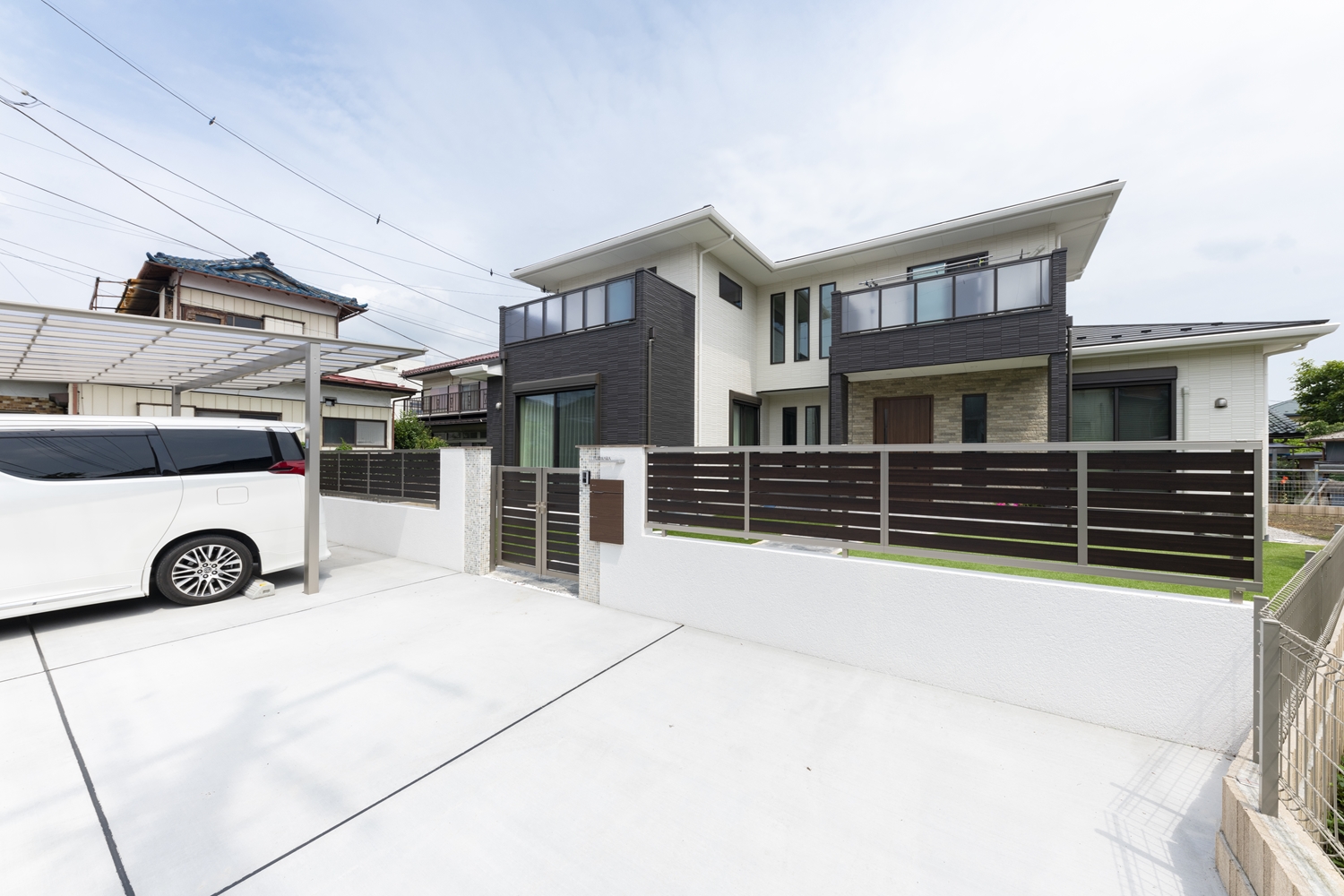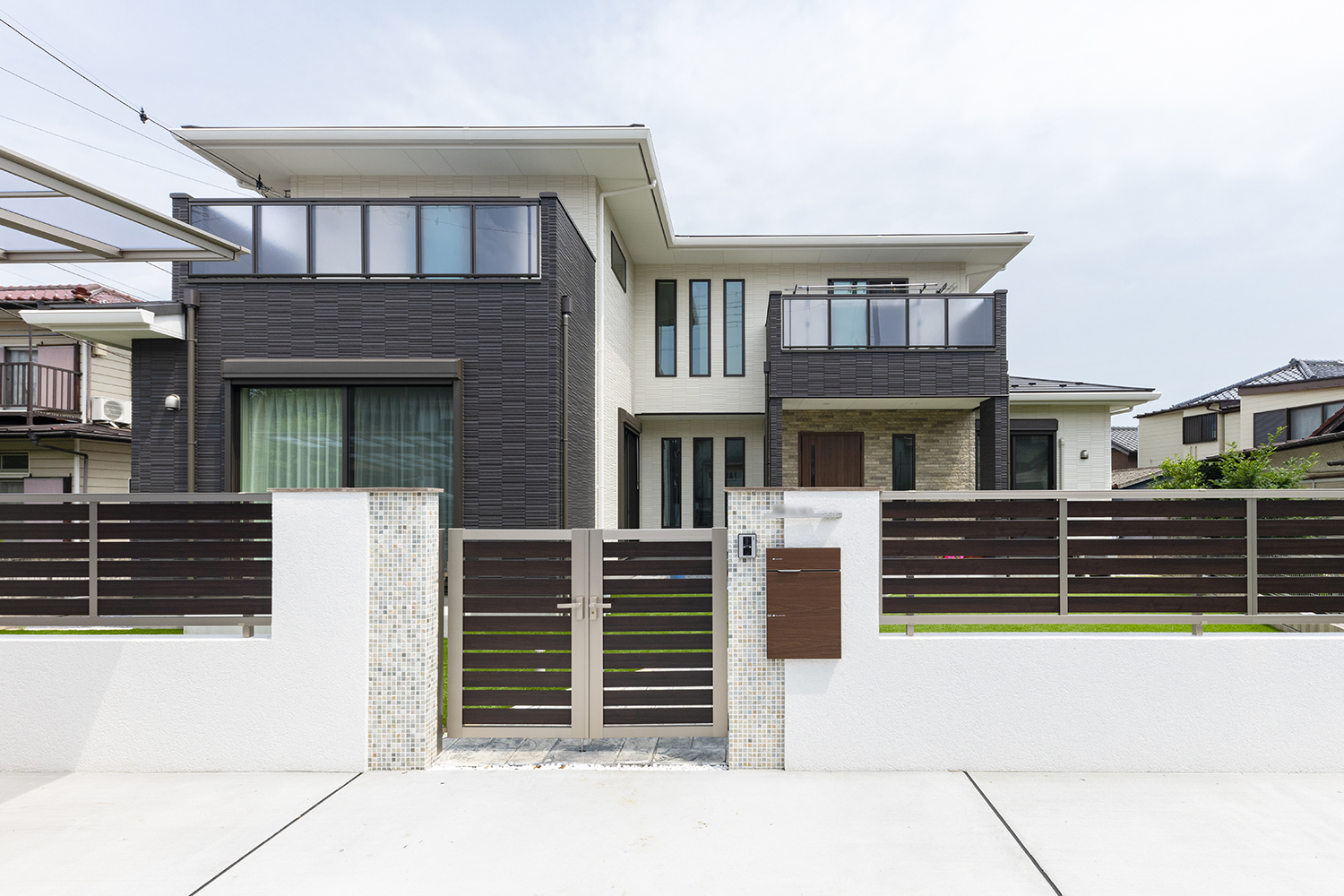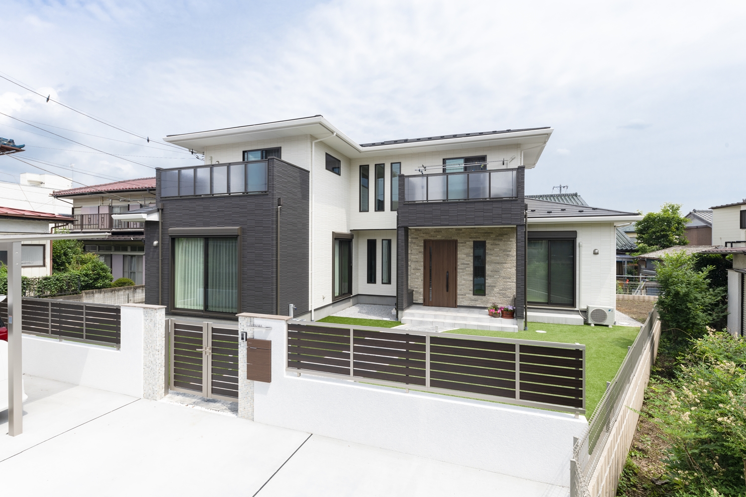 白とチャコールのツートンをあしらったシンプルでスタイリッシュな外観。モダンな市松敷きのお部屋など、お施主様のこだわりがいっぱい詰まった一邸に仕上りました。