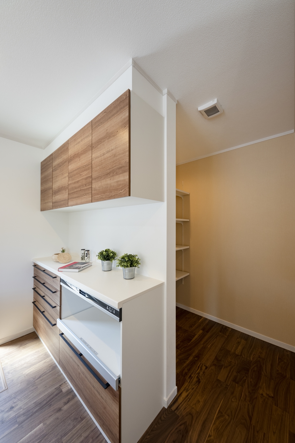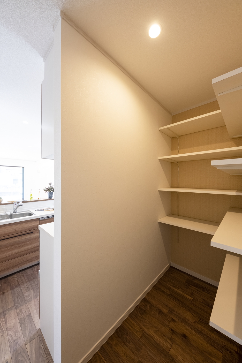 収納豊富なパントリースペース。買い物あとの片づけがスムーズに。