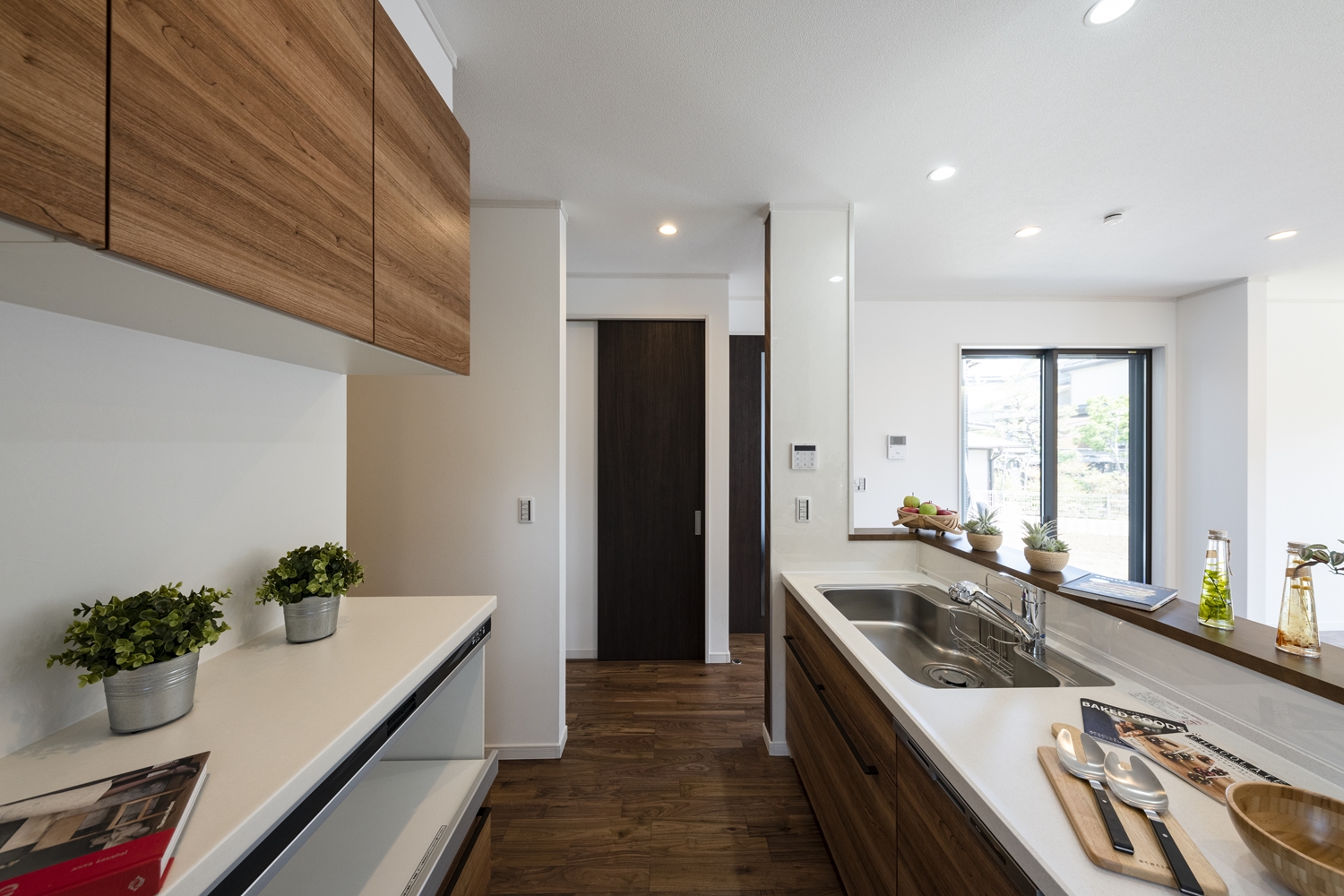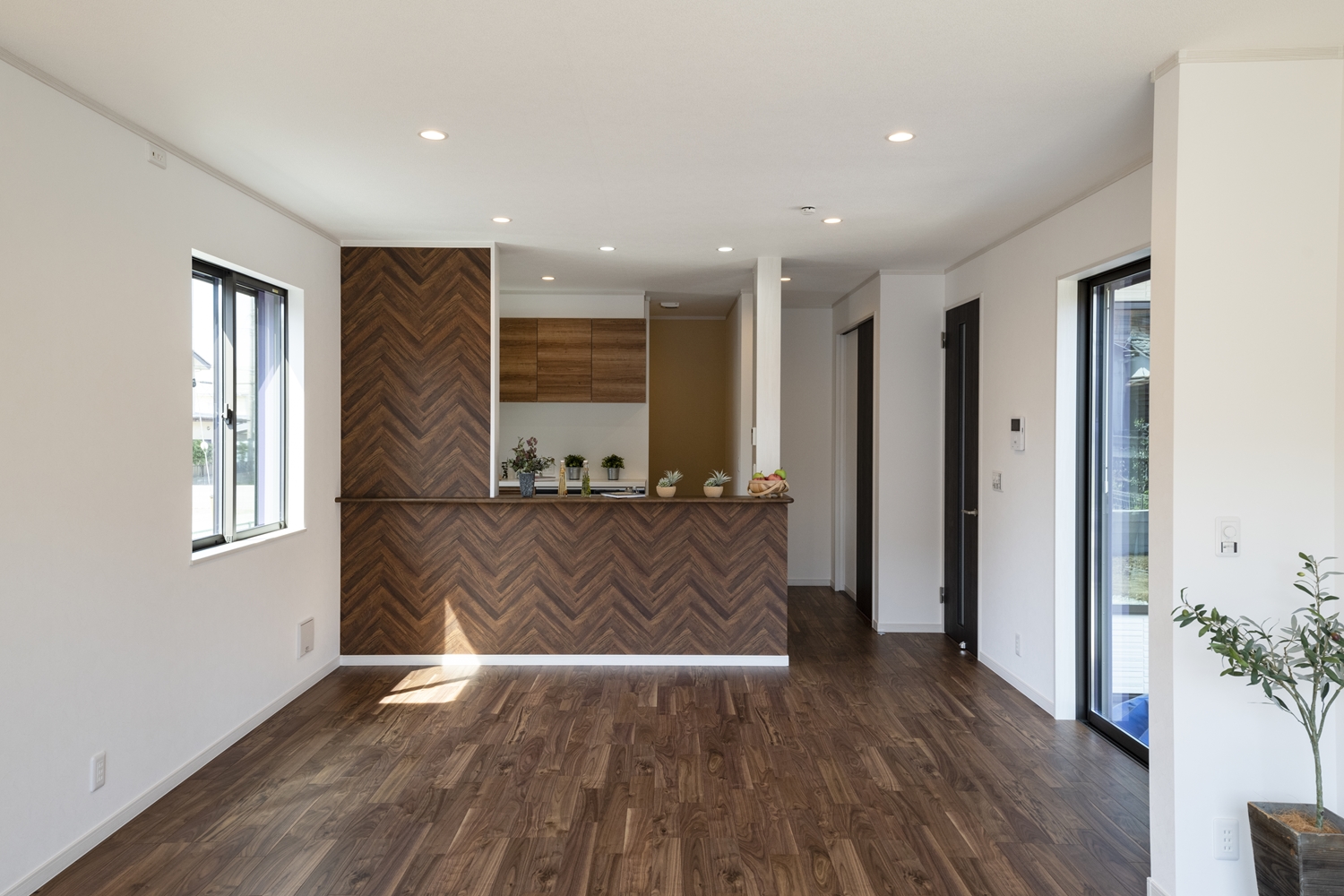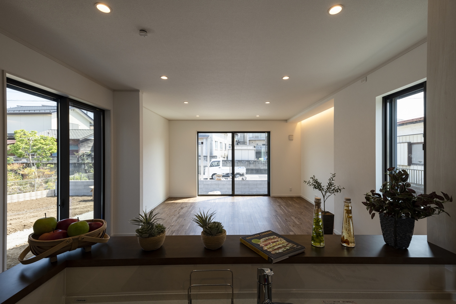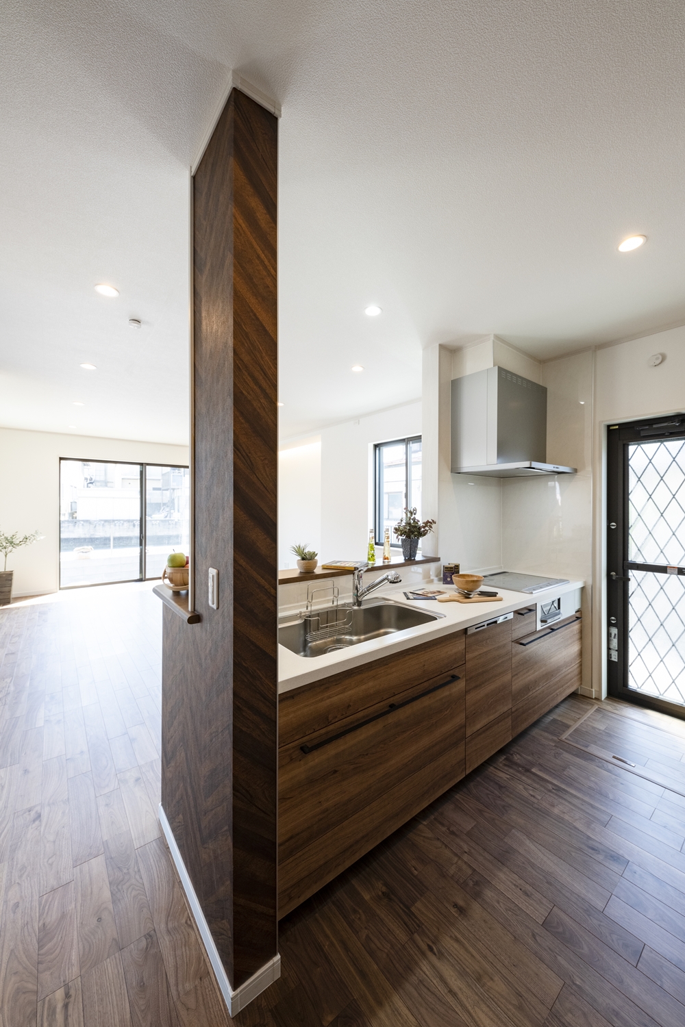 キッチンから、リビング、ダイニングが見渡せて、とても開放的で一体感があります。