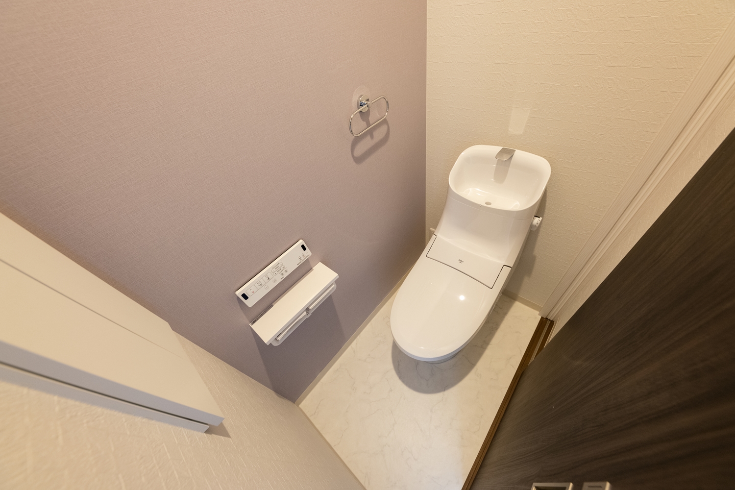 ライトピンクが可愛らしい印象。2種類のアクセントクロスで空間を彩る2階トイレ。