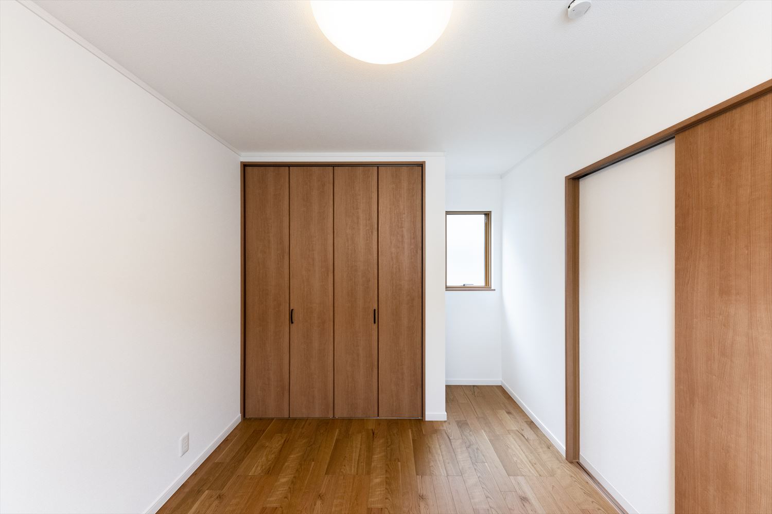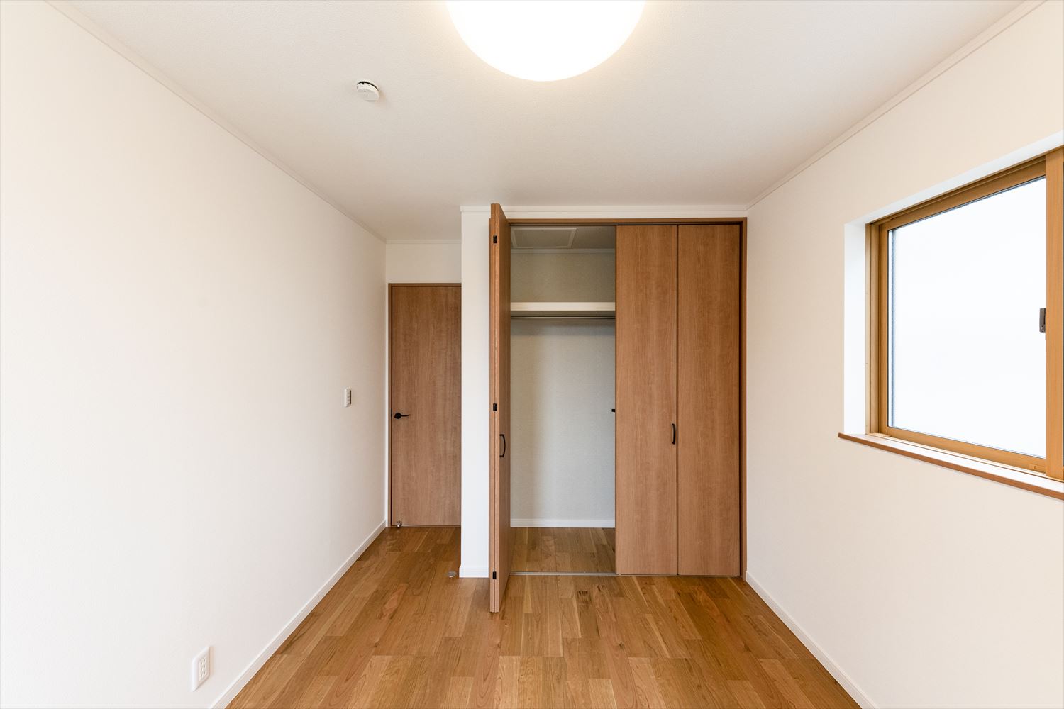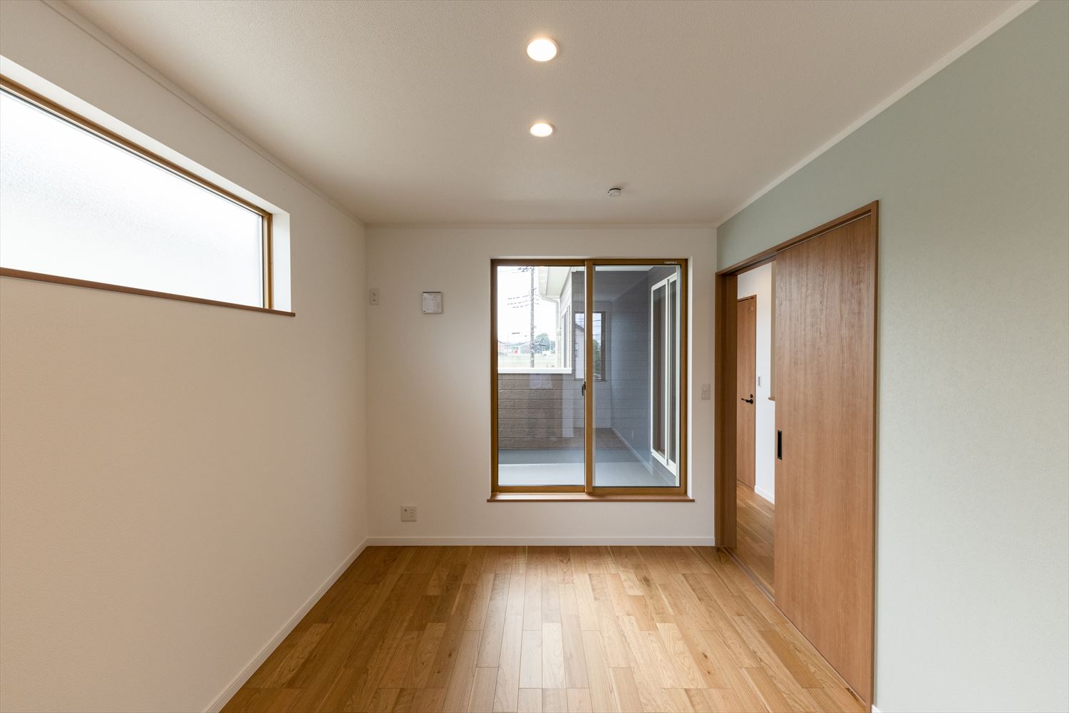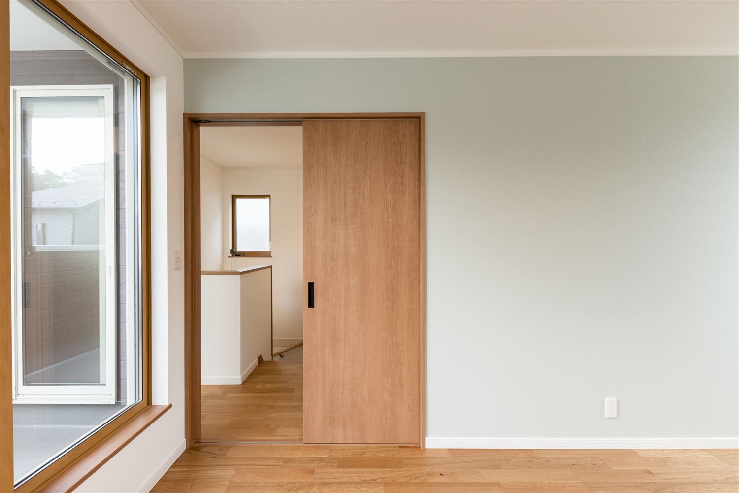 窓から自然のやさしい光が降り注ぐ明るい2階洋室。スペースのムダをつくらない引き戸を採用。