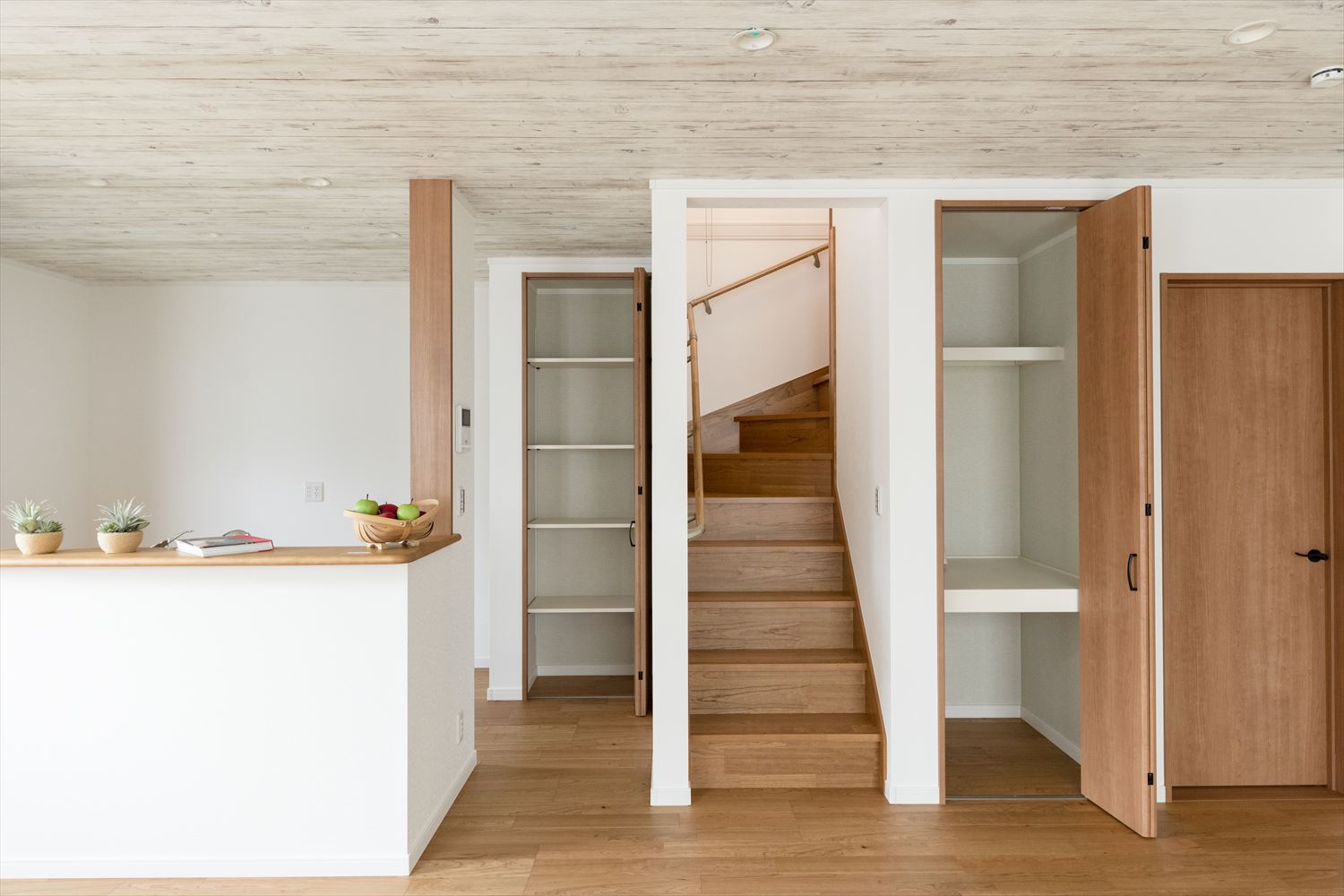 リビングにも収納付でちょっとした掃除用具や子供のおもちゃなど、散らかりやすいリビングがいつでも綺麗に。