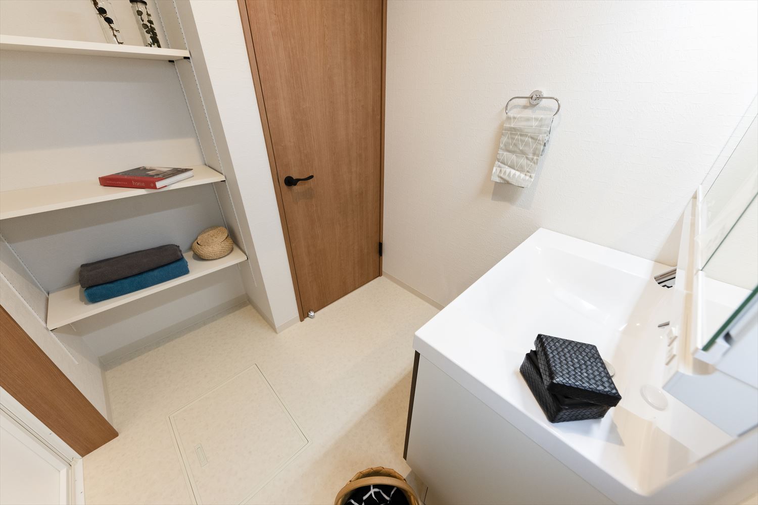 可動式のリネン棚を設置し、タオルや洗剤等も楽々収納