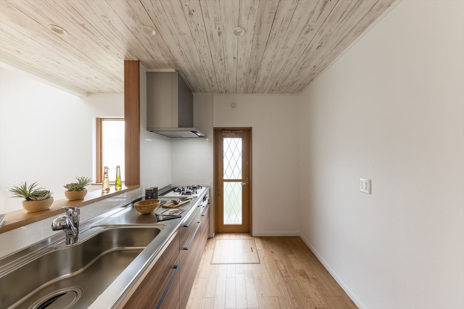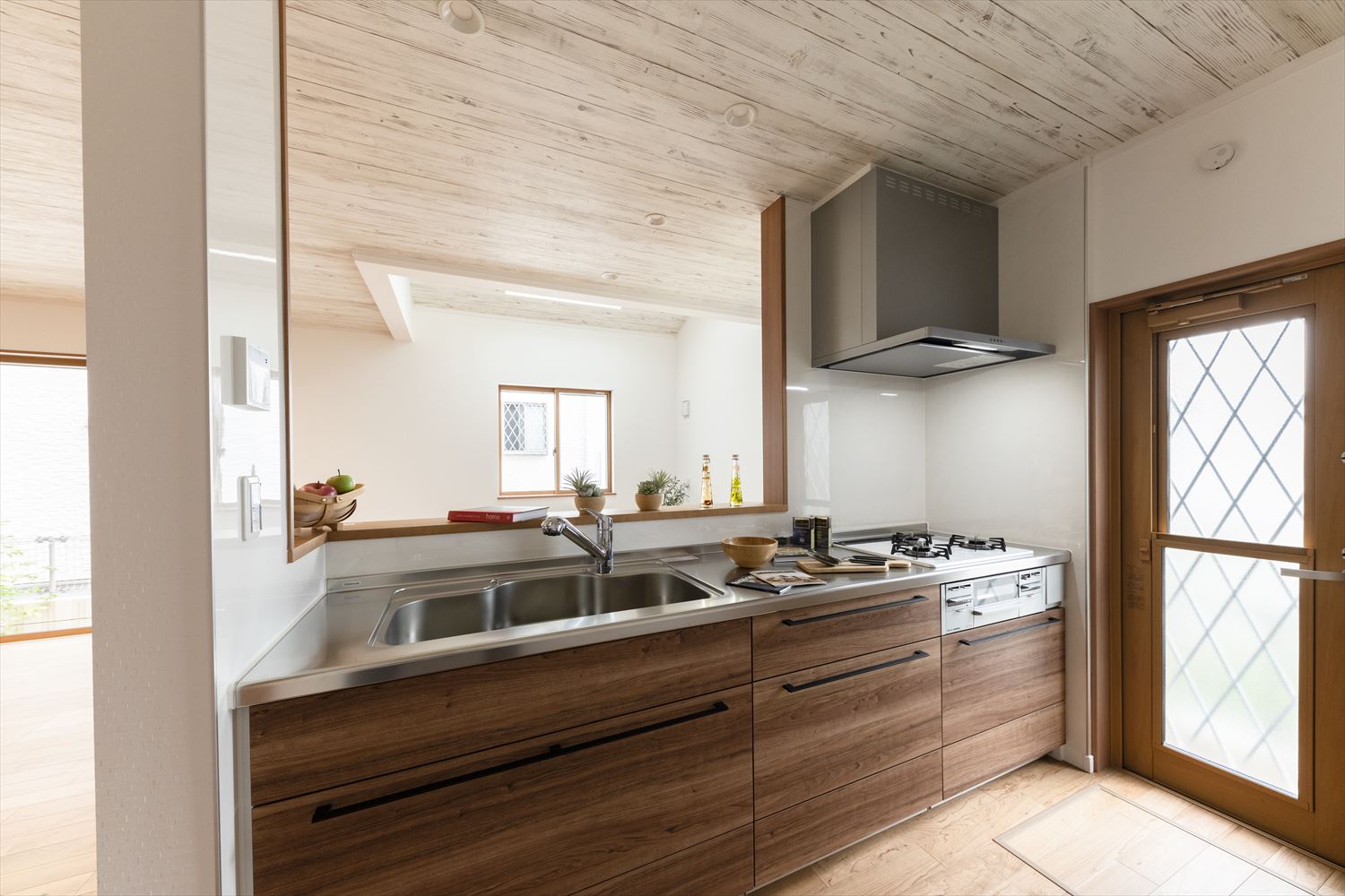 木目のキッチンパネルが空間をよりナチュラルな雰囲気に。