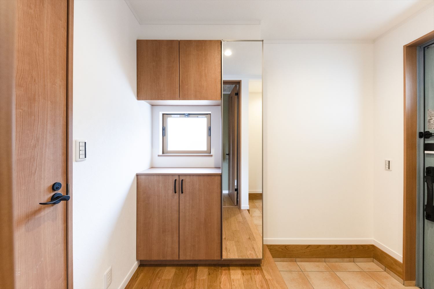 ミラー付き収納の他に一目で自分の靴が見つけられるシューズクロークも設置。高さを変えることができるので丈のあるブーツも綺麗に収納することが可能に。