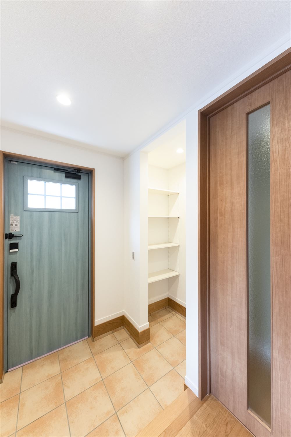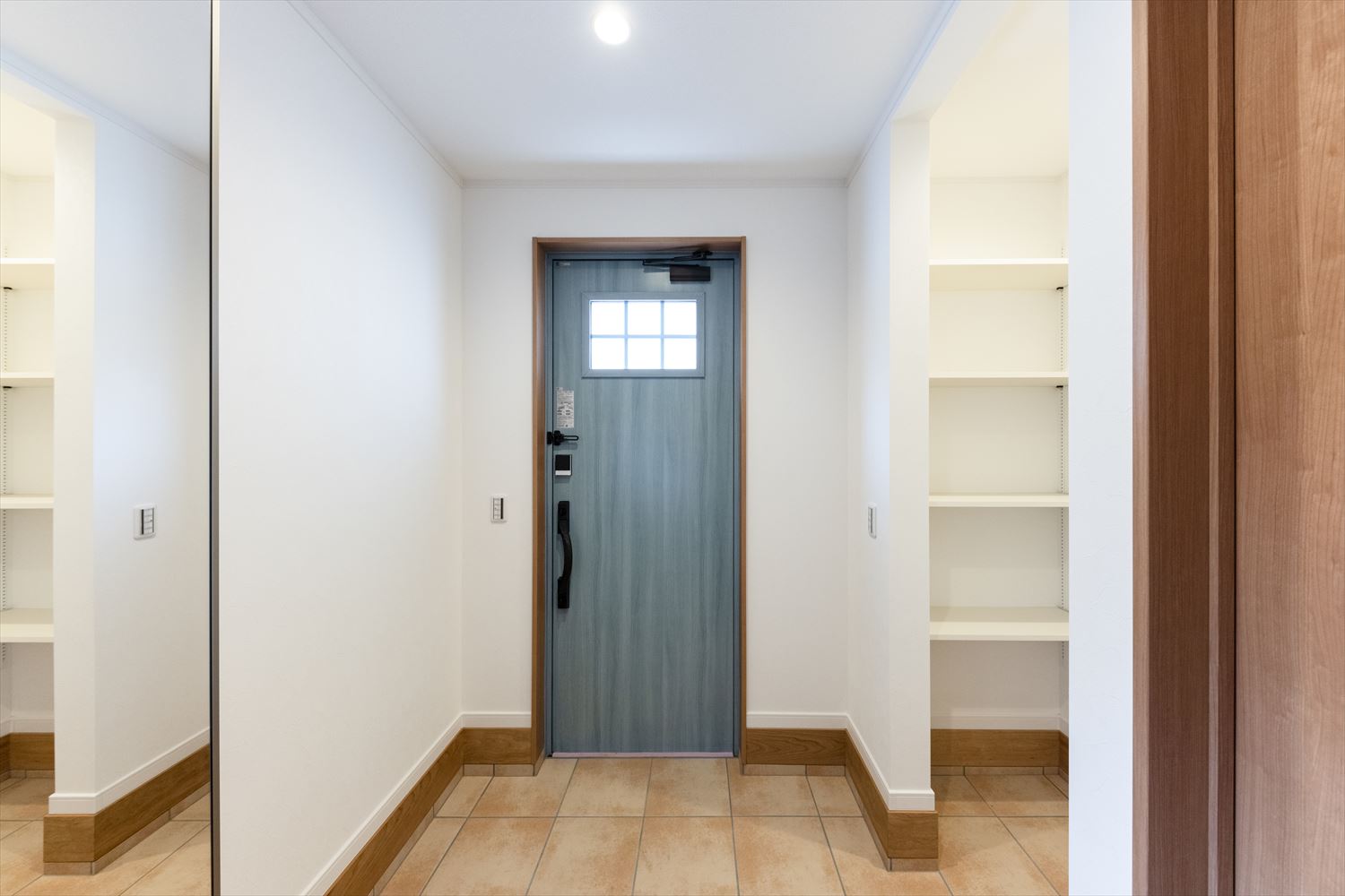 アイスブルーの玄関ドアに、ベージュのテラコッタ調タイルを施した鮮やかな玄関。
