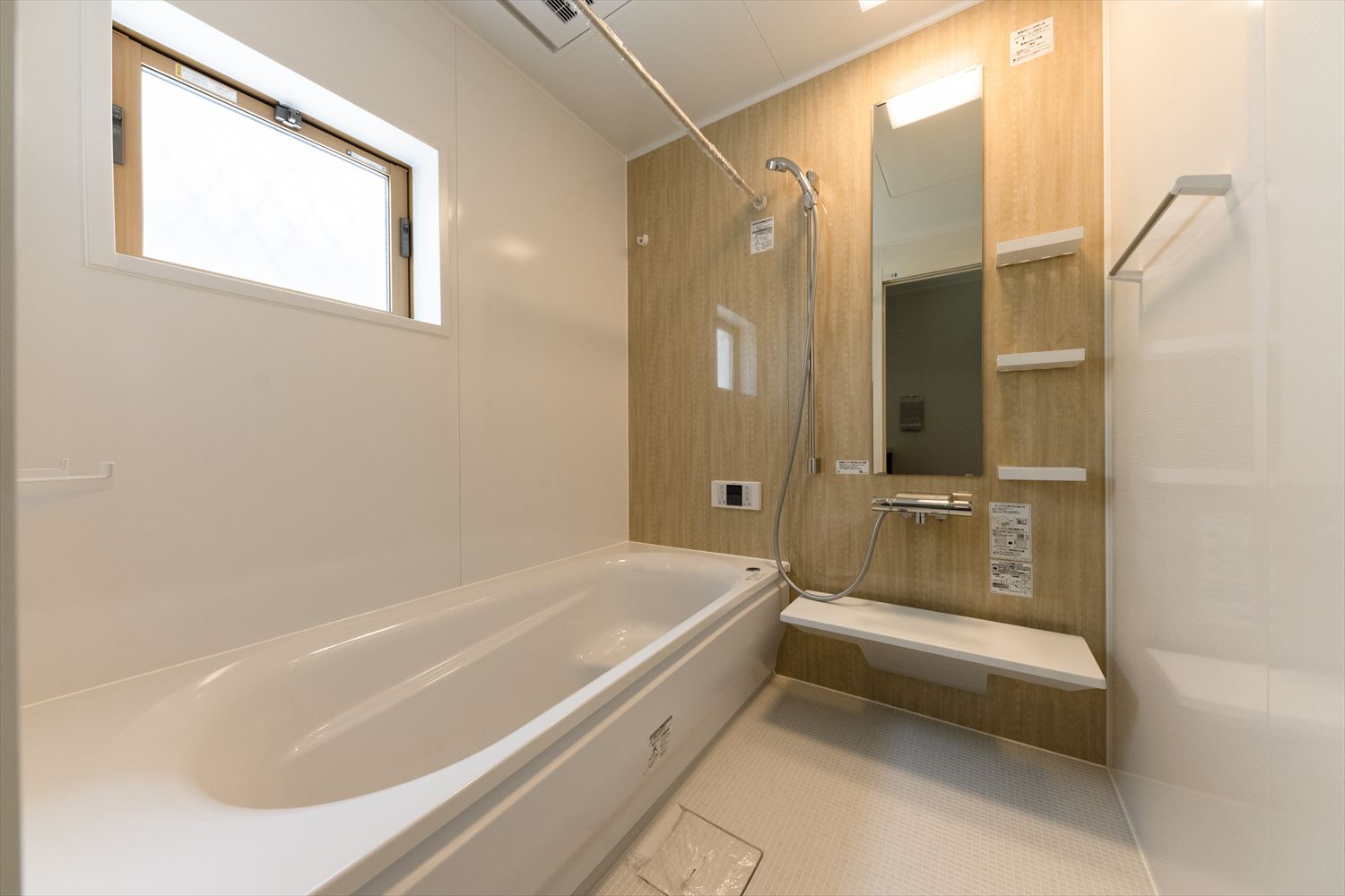 ナチュラルな木目柄のアクセントパネルが癒しの空間を演出するバスルーム。