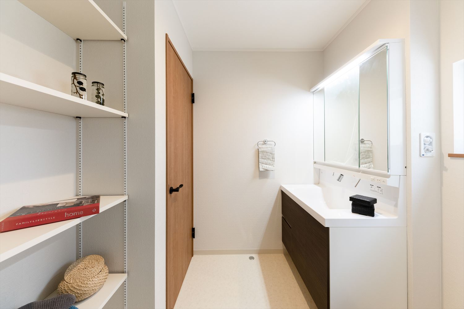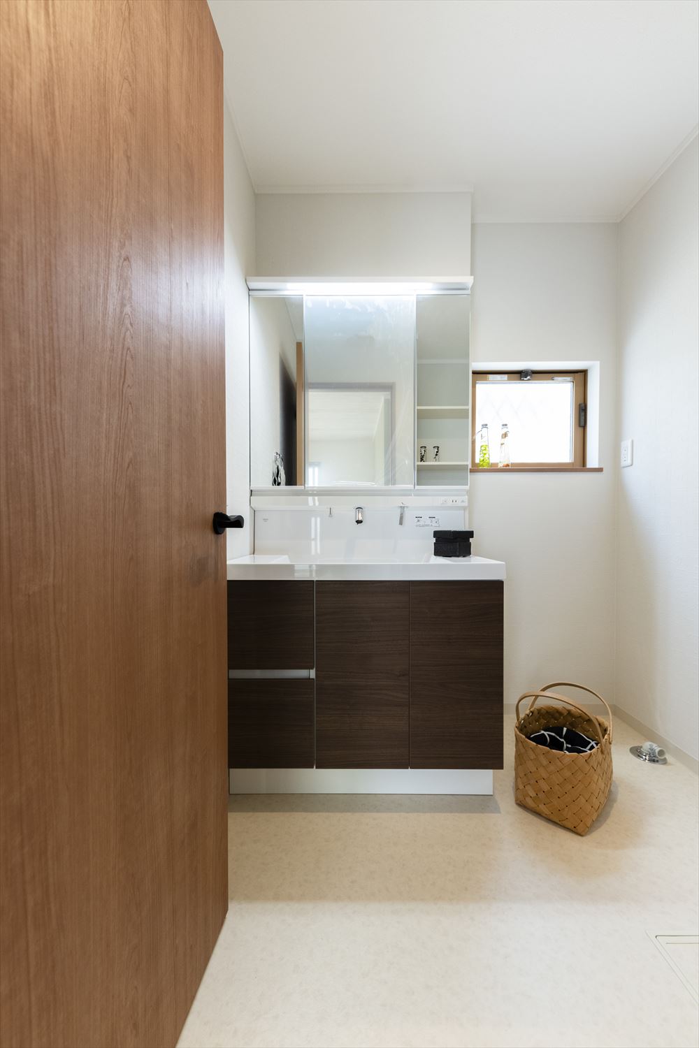 白を基調とした清潔感のあるサニタリールーム。洗面化粧台扉をダークブラウンでアクセントに。